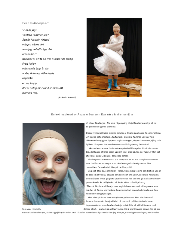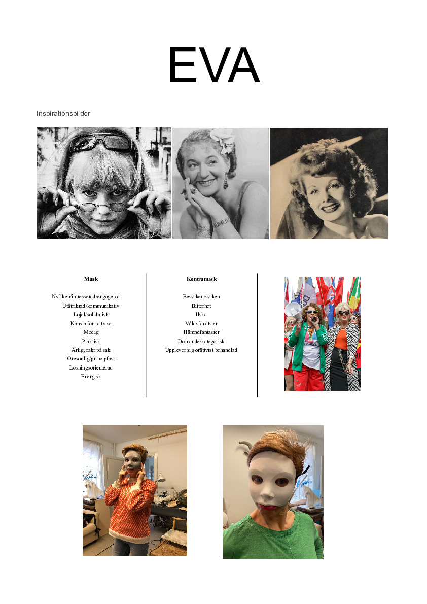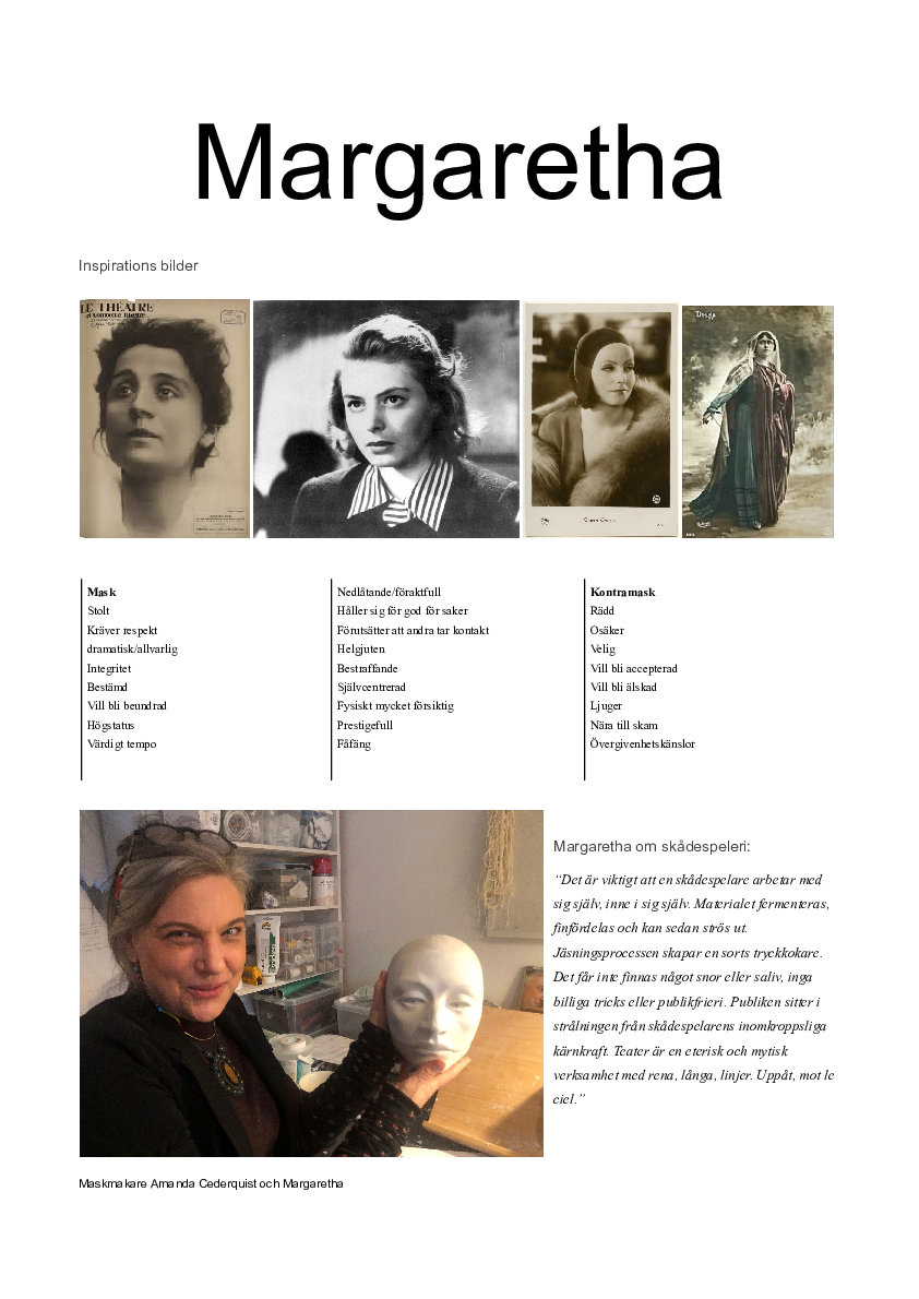 Jag presenterade jag min idé om att skapa två skådespelar-masker för maskmakaren Amanda Cederquist. För att ge startpunkter för hennes arbete samlade jag bilder, gjorde skisser och enkla lerfigurer. Jag listade egenskaper för mask och kontramask, alltså maskens polaritet, för båda karaktärerna, skrev om deras relation till teatern och till publiken.