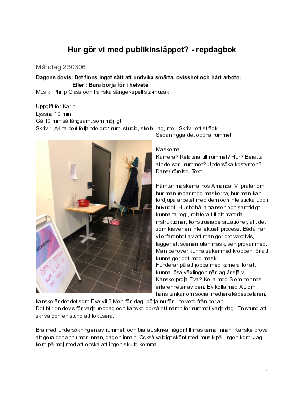 This exhibition shows my project from the Master in Acting 2021-2023 at SKH in Stockholm. The essay is called "When we meet" and the performative part "How do we let the audience in?" As an actor and clown, I have worked in many different rooms and with many different audience agreements. Everything from stage-salon situations where the audience knows exactly how to behave and what their participation looks like, to playing for only one person in a hospital bed or in a small rowing boat, where participation must be clearly negotiated and communicated. I've met adults who are world masters of theater etiquette, but can't answer a question if asked from the stage, and I've met children who are wild first-timers who engage in intense dialogue with us on stage. I am interested in the dialogue between actors and audience and in audience participation. What standards and agreements are they regulated by? How does the fear of making a mistake, breaking the norm, affect the experience of the performance? Does that fear of shame limit what is possible in the theater? I have also wondered what roles the audience can have, what in a work communicates this role, and whether the audience can change roles in the same work. In "How do we let the audience in?" you can read about the work with Eva and Margaretha, two half-masks who are both actors but in whose artistry the audience plays very different roles.