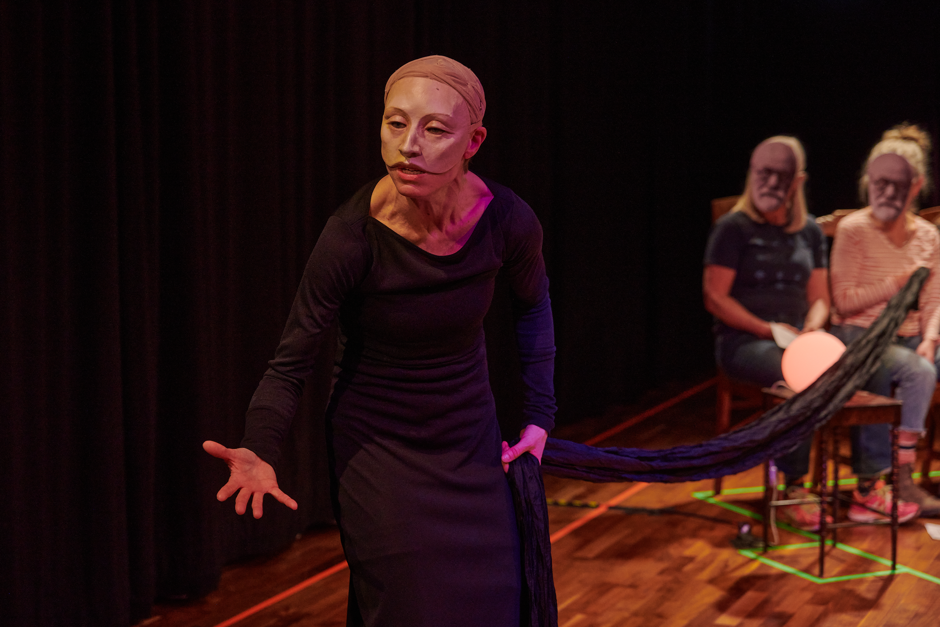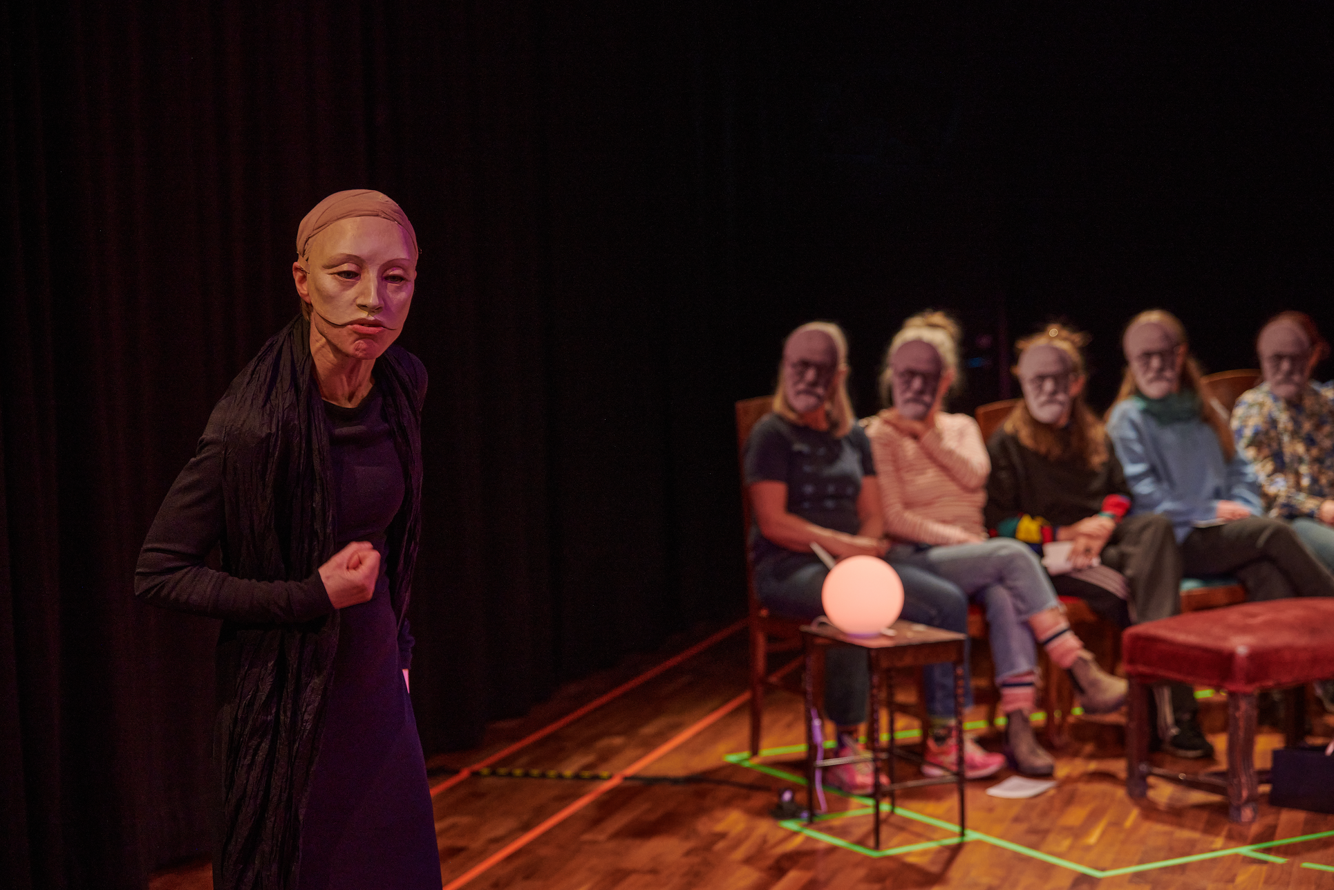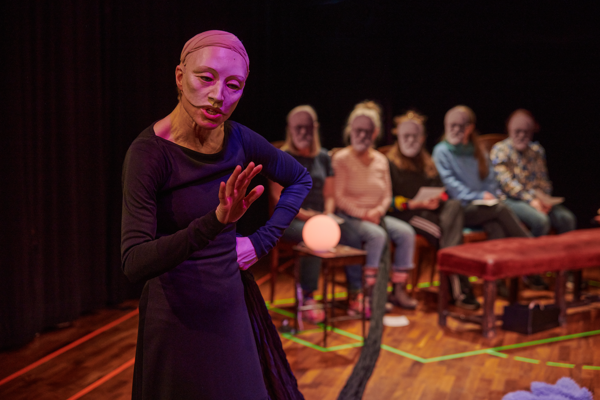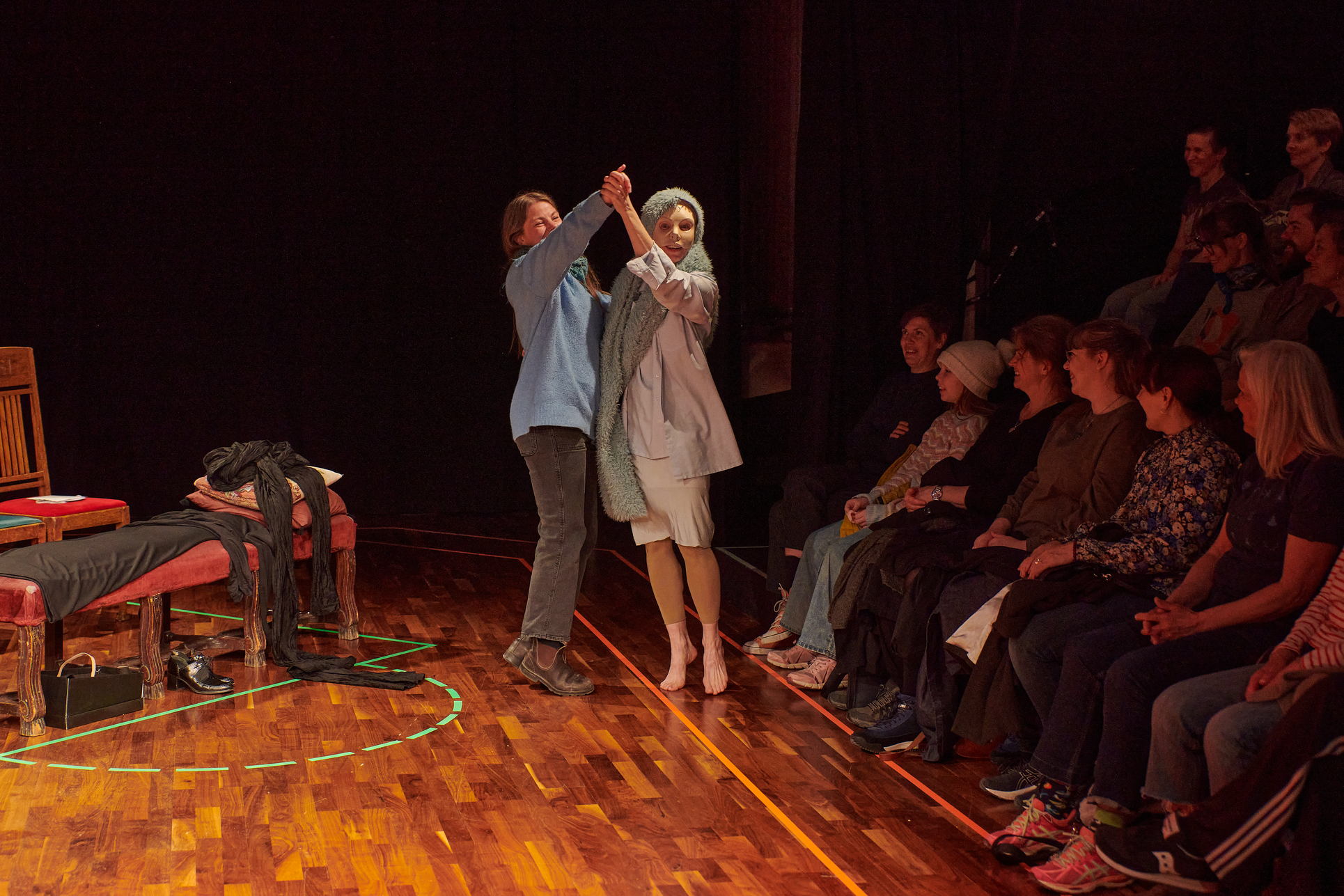 This exhibition shows my project from the Master in Acting 2021-2023 at SKH in Stockholm. The essay is called "When we meet" and the performative part "How do we let the audience in?" As an actor and clown, I have worked in many different rooms and with many different audience agreements. Everything from stage-salon situations where the audience knows exactly how to behave and what their participation looks like, to playing for only one person in a hospital bed or in a small rowing boat, where participation must be clearly negotiated and communicated. I've met adults who are world masters of theater etiquette, but can't answer a question if asked from the stage, and I've met children who are wild first-timers who engage in intense dialogue with us on stage. I am interested in the dialogue between actors and audience and in audience participation. What standards and agreements are they regulated by? How does the fear of making a mistake, breaking the norm, affect the experience of the performance? Does that fear of shame limit what is possible in the theater? I have also wondered what roles the audience can have, what in a work communicates this role, and whether the audience can change roles in the same work. In "How do we let the audience in?" you can read about the work with Eva and Margaretha, two half-masks who are both actors but in whose artistry the audience plays very different roles.