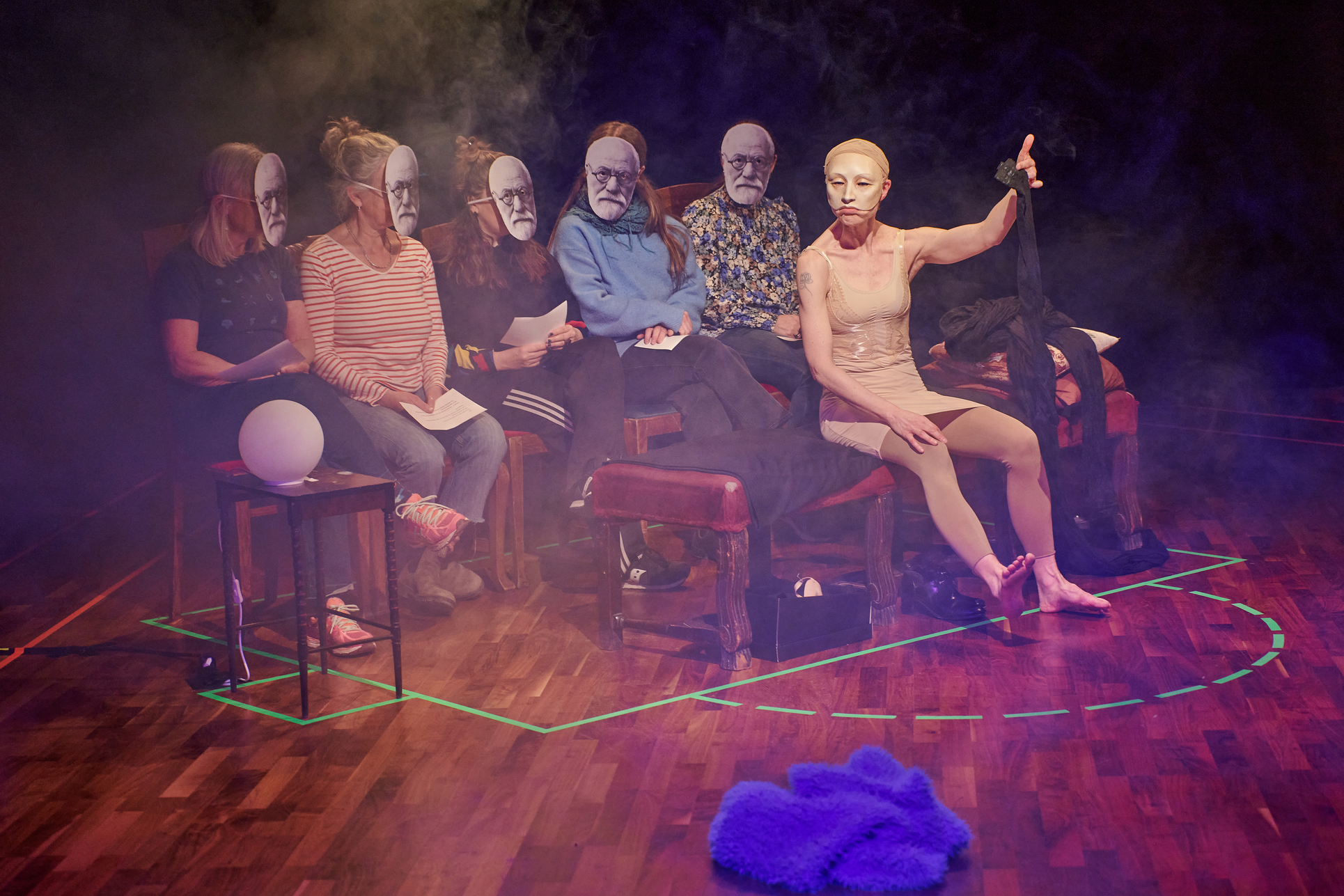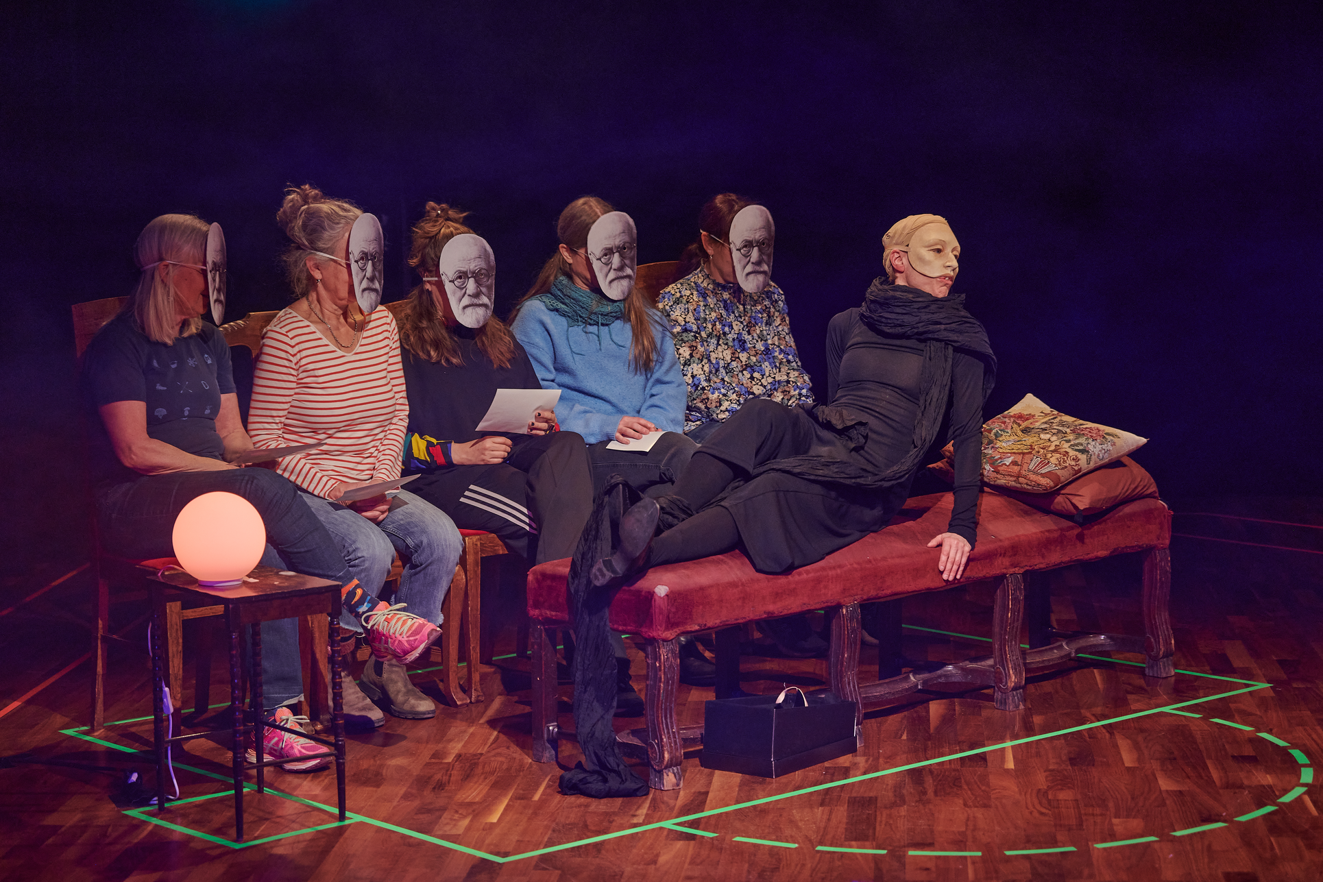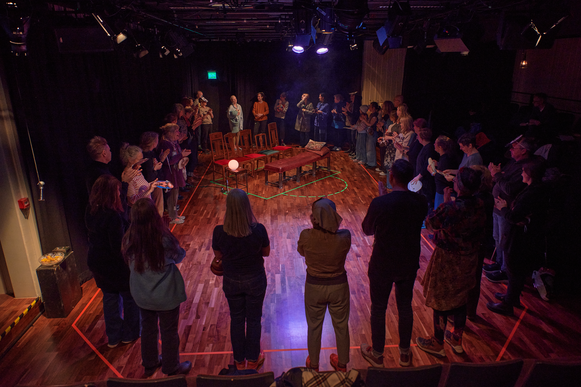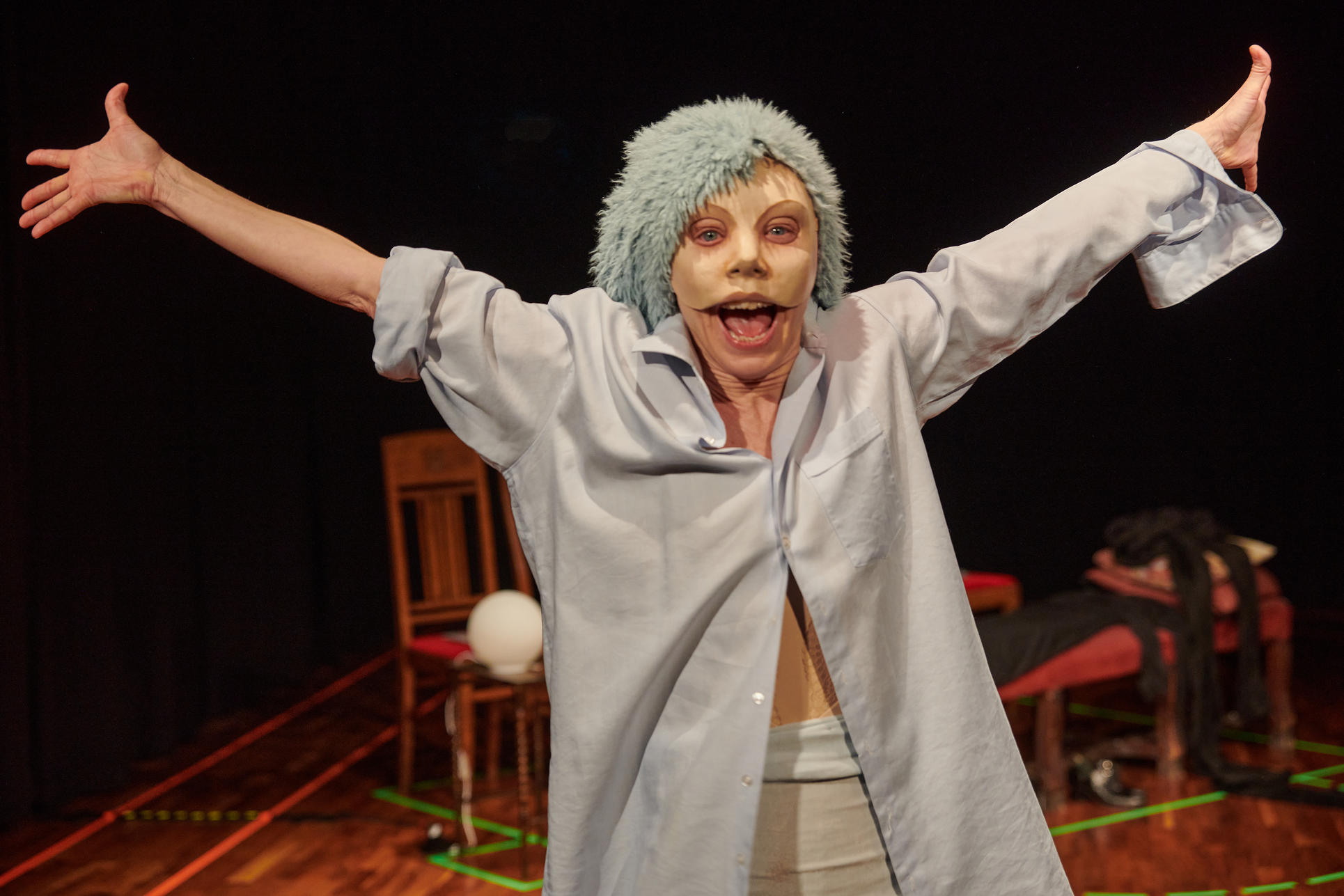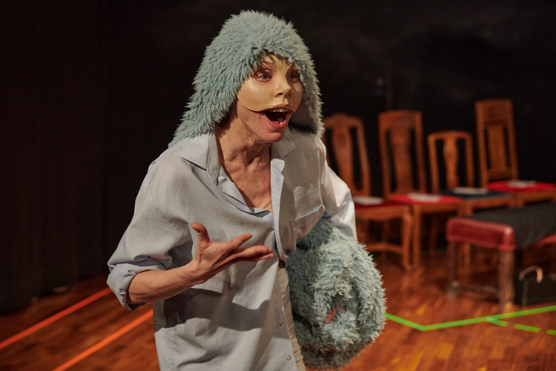 This exhibition shows my project from the Master in Acting 2021-2023 at SKH in Stockholm. The essay is called "When we meet" and the performative part "How do we let the audience in?" As an actor and clown, I have worked in many different rooms and with many different audience agreements. Everything from stage-salon situations where the audience knows exactly how to behave and what their participation looks like, to playing for only one person in a hospital bed or in a small rowing boat, where participation must be clearly negotiated and communicated. I've met adults who are world masters of theater etiquette, but can't answer a question if asked from the stage, and I've met children who are wild first-timers who engage in intense dialogue with us on stage. I am interested in the dialogue between actors and audience and in audience participation. What standards and agreements are they regulated by? How does the fear of making a mistake, breaking the norm, affect the experience of the performance? Does that fear of shame limit what is possible in the theater? I have also wondered what roles the audience can have, what in a work communicates this role, and whether the audience can change roles in the same work. In "How do we let the audience in?" you can read about the work with Eva and Margaretha, two half-masks who are both actors but in whose artistry the audience plays very different roles.