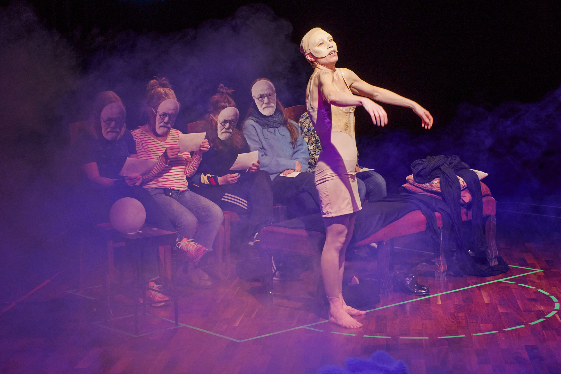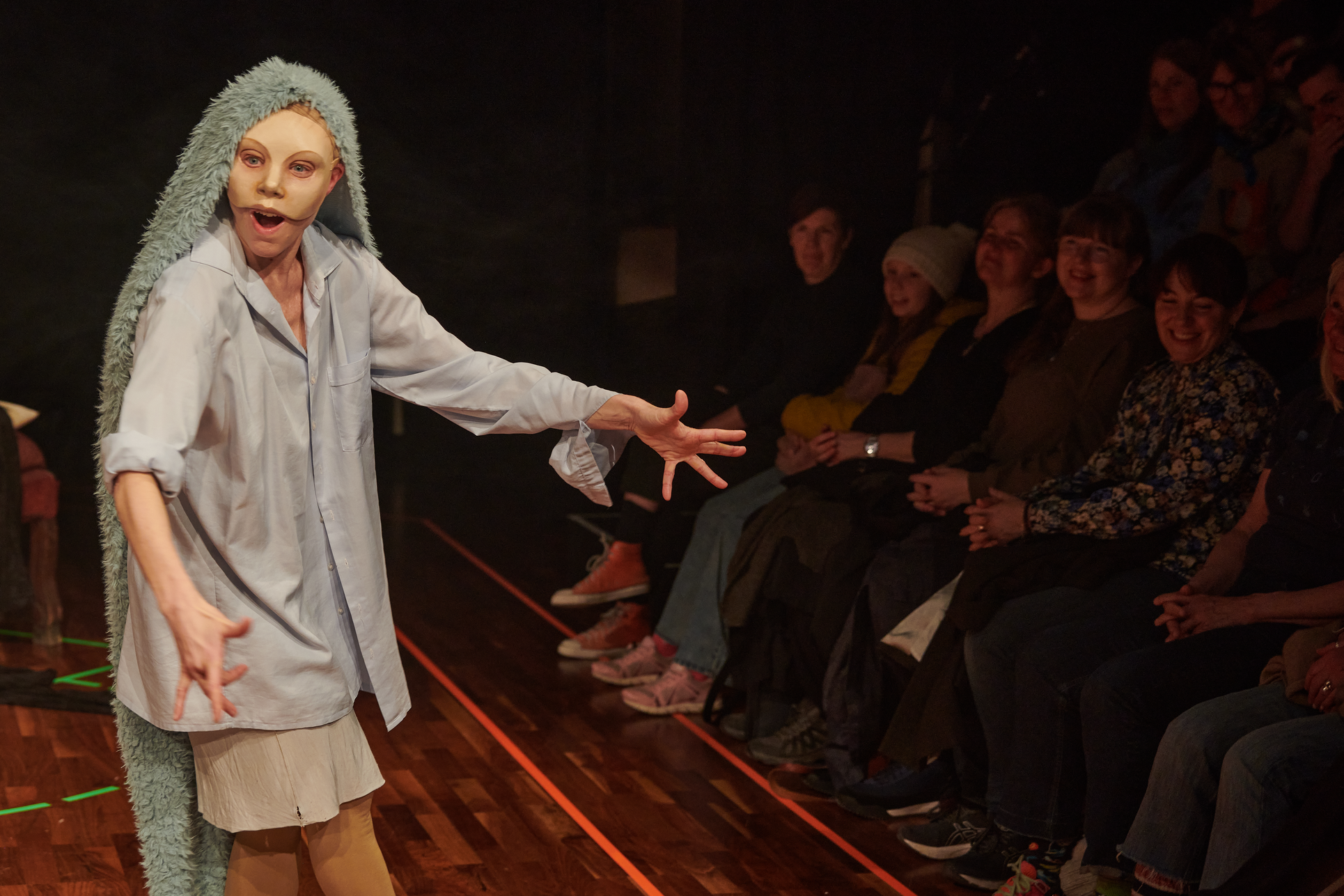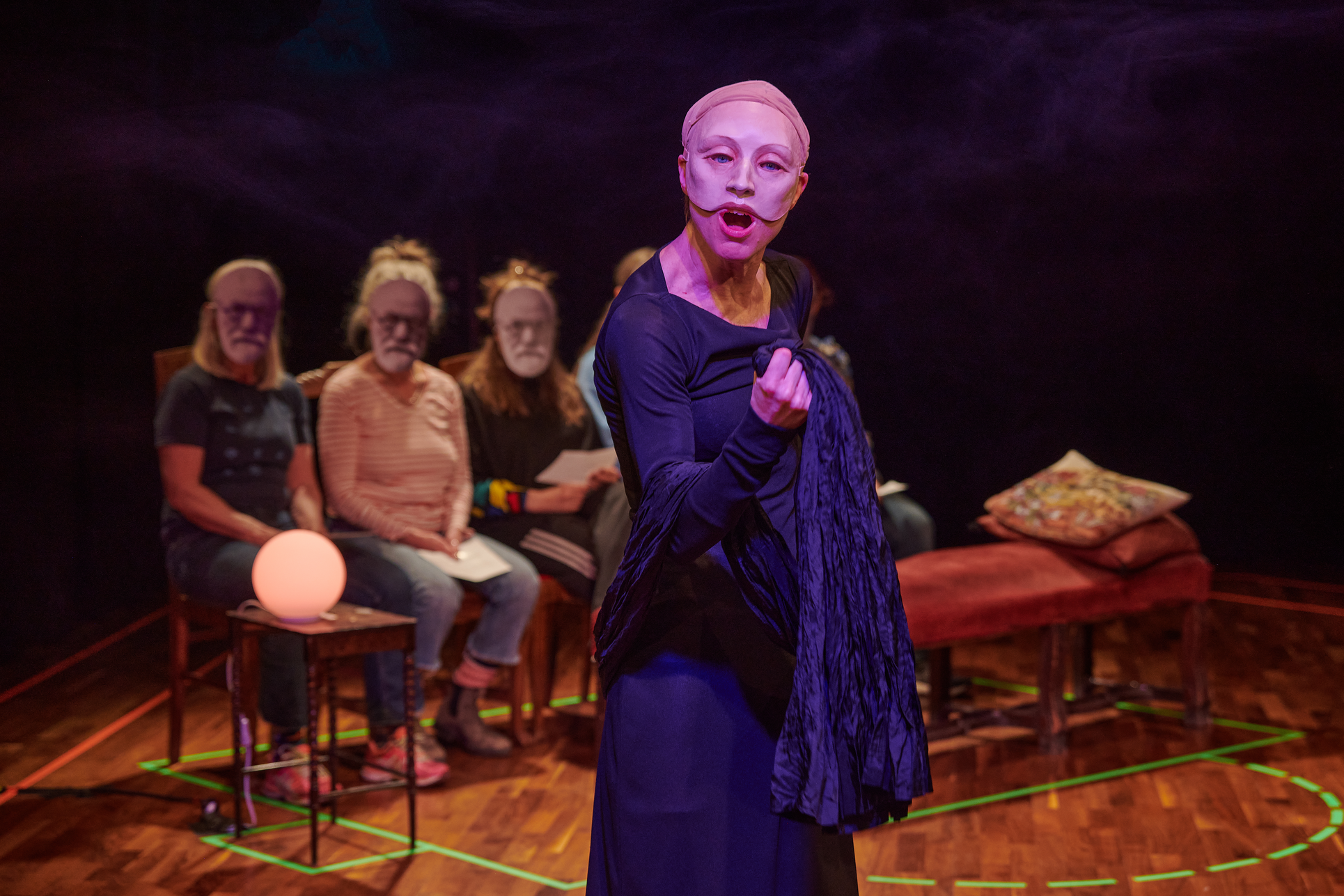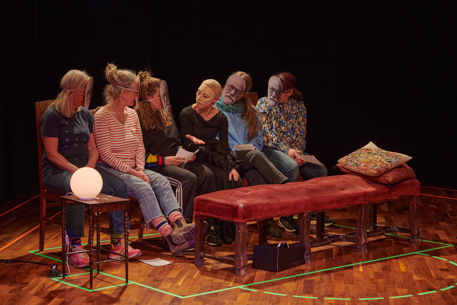 This exhibition shows my project from the Master in Acting 2021-2023 at SKH in Stockholm. The essay is called "When we meet" and the performative part "How do we let the audience in?" As an actor and clown, I have worked in many different rooms and with many different audience agreements. Everything from stage-salon situations where the audience knows exactly how to behave and what their participation looks like, to playing for only one person in a hospital bed or in a small rowing boat, where participation must be clearly negotiated and communicated. I've met adults who are world masters of theater etiquette, but can't answer a question if asked from the stage, and I've met children who are wild first-timers who engage in intense dialogue with us on stage. I am interested in the dialogue between actors and audience and in audience participation. What standards and agreements are they regulated by? How does the fear of making a mistake, breaking the norm, affect the experience of the performance? Does that fear of shame limit what is possible in the theater? I have also wondered what roles the audience can have, what in a work communicates this role, and whether the audience can change roles in the same work. In "How do we let the audience in?" you can read about the work with Eva and Margaretha, two half-masks who are both actors but in whose artistry the audience plays very different roles.