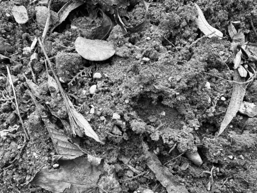 An elderly lady is scratching the soil with her bare hands and looking at me with blind white eyes, while still digging her nails into the dirt.