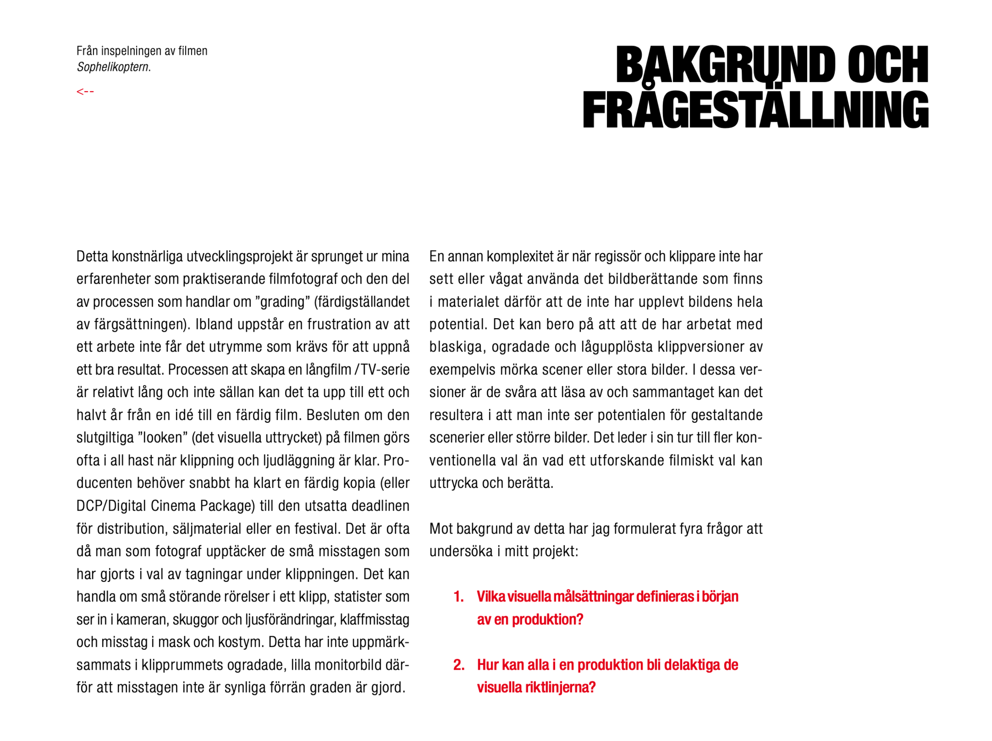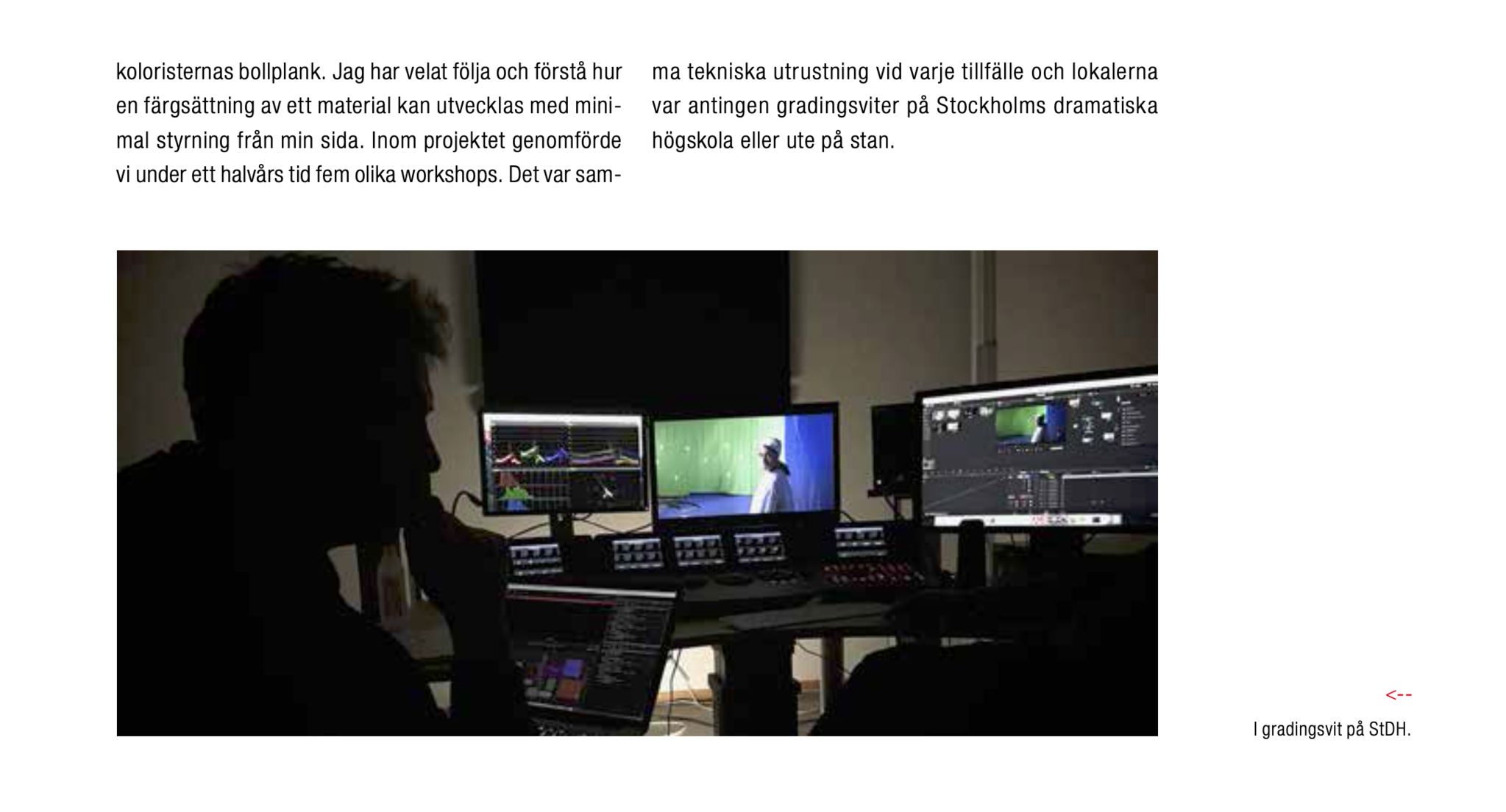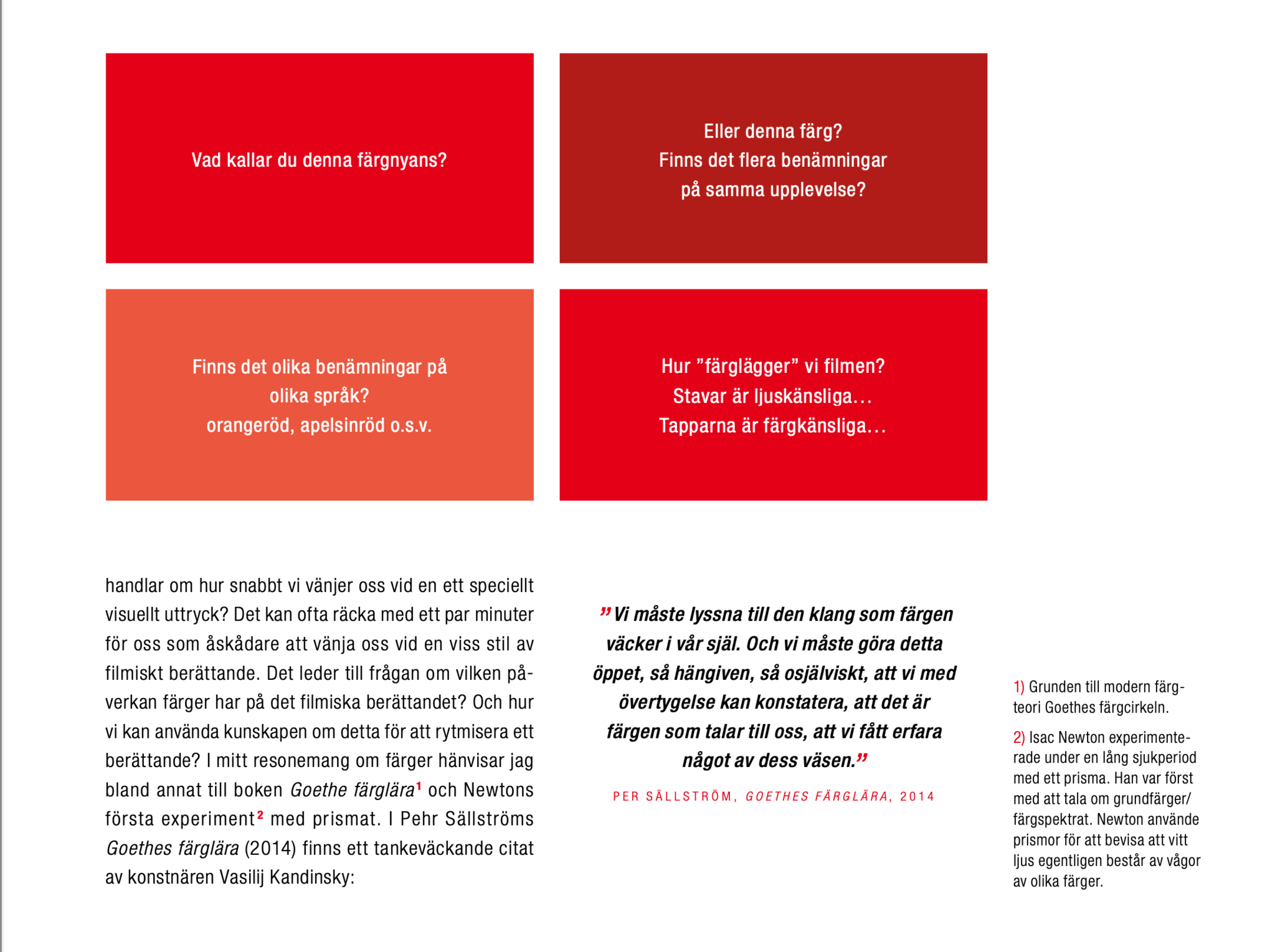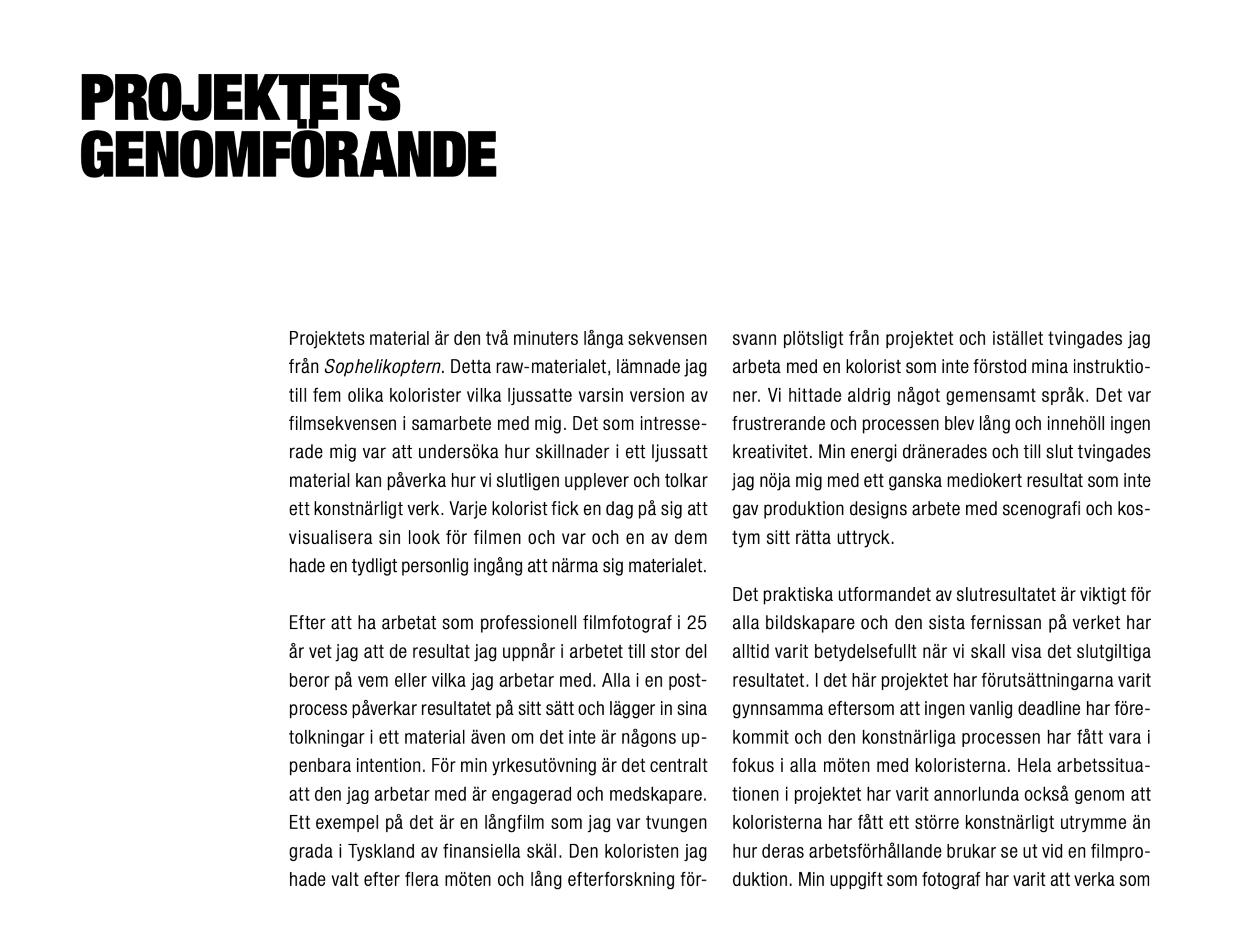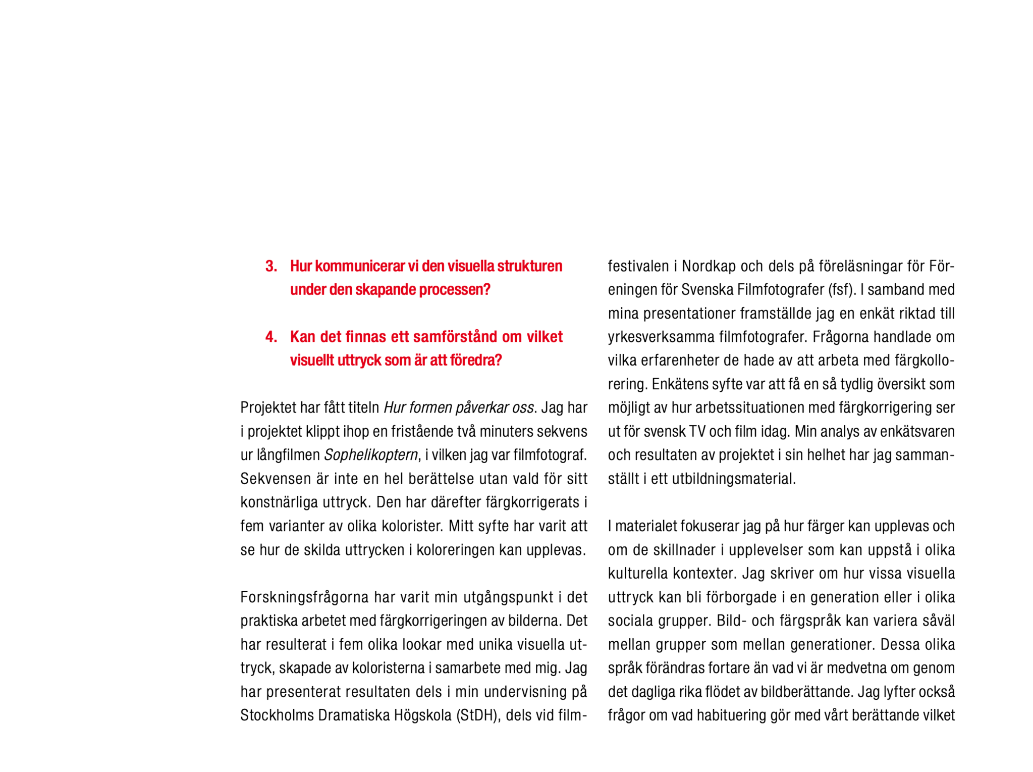 Hur påverkar färg, ljus och form våra sinnen? Varför är det ständigt så intressant och lockande med den oväntade bilden – med brottet av normaliteten? Detta konstnärliga utvecklingsprojekt är sprunget ur mina erfarenheter som praktiserande filmfotograf och den del av processen som handlar om ”grading” (färdigställandet av färgsättningen). Ibland uppstår en frustration av att ett arbete inte får det utrymme som krävs för att uppnå ett bra resultat. Processen att skapa en långfilm /TV-serie är relativt lång och inte sällan kan det ta upp till ett och halvt år från en idé till en färdig film. Besluten om den slutgiltiga ”looken” (det visuella uttrycket) på filmen görs ofta i all hast när klippning och ljudläggning är klar. Producenten behöver snabbt ha klart en färdig kopia (eller DCP/Digital Cinema Package) till den utsatta deadlinen för distribution, säljmaterial eller en festival. Det är ofta då man som fotograf upptäcker de små misstagen som har gjorts i val av tagningar under klippningen. Det kan handla om små störande rörelser i ett klipp, statister som ser in i kameran, skuggor och ljusförändringar, klaffmisstag och misstag i mask och kostym. Detta har inte uppmärksammats i klipprummets ogradade, lilla monitorbild därför att misstagen inte är synliga förrän graden är gjord. En annan komplexitet är när regissör och klippare inte har sett eller vågat använda det bildberättande som finns i materialet därför att de inte har upplevt bildens hela potential. Det kan bero på att att de har arbetat med blaskiga, ogradade och lågupplösta klippversioner av exempelvis mörka scener eller stora bilder. I dessa versioner är de svåra att läsa av och sammantaget kan det resultera i att man inte ser potentialen för gestaltande scenerier eller större bilder. Det leder i sin tur till fler konventionella val än vad ett utforskande filmiskt val kan uttrycka och berätta. Mot bakgrund av detta har jag formulerat fyra frågor att undersöka i mitt projekt: 1. Vilka visuella målsättningar definieras i början av en produktion? 2. Hur kan alla i en produktion bli delaktiga de visuella riktlinjerna? 3. Hur kommunicerar vi den visuella strukturen under den skapande processen? 4. Kan det finnas ett samförstånd om vilket visuellt uttryck som är att föredra? Projektet har fått titeln Hur formen påverkar oss. Jag har i projektet klippt ihop en fristående två minuters sekvens ur långfilmen Sophelikoptern, i vilken jag var filmfotograf. Sekvensen är inte en hel berättelse utan vald för sitt konstnärliga uttryck. Den har därefter färgkorrigerats i fem varianter av olika kolorister. Mitt syfte har varit att se hur de skilda uttrycken i koloreringen kan upplevas. Forskningsfrågorna har varit min utgångspunkt i det praktiska arbetet med färgkorrigeringen av bilderna. Det har resulterat i fem olika lookar med unika visuella uttryck, skapade av koloristerna i samarbete med mig. Jag har presenterat resultaten dels i min undervisning på Stockholms Dramatiska Högskola (StDH), dels vid filmfestivalen i Nordkap och dels på föreläsningar för Föreningen för Svenska Filmfotografer (fsf). I samband med mina presentationer framställde jag en enkät riktad till yrkesverksamma filmfotografer. Frågorna handlade om vilka erfarenheter de hade av att arbeta med färgkollorering. Enkätens syfte var att få en så tydlig översikt som möjligt av hur arbetssituationen med färgkorrigering ser ut för svensk TV och film idag. Min analys av enkätsvaren och resultaten av projektet i sin helhet har jag sammanställt i ett utbildningsmaterial. I materialet fokuserar jag på hur färger kan upplevas och om de skillnader i upplevelser som kan uppstå i olika kulturella kontexter. Jag skriver om hur vissa visuella uttryck kan bli förborgade i en generation eller i olika sociala grupper. Bild- och färgspråk kan variera såväl mellan grupper som mellan generationer. Dessa olika språk förändras fortare än vad vi är medvetna om genom det dagliga rika flödet av bildberättande. Jag lyfter också frågor om vad habituering gör med vårt berättande vilket handlar om hur snabbt vi vänjer oss vid en ett speciellt visuellt uttryck? Det kan ofta räcka med ett par minuter för oss som åskådare att vänja oss vid en viss stil av filmiskt berättande. Det leder till frågan om vilken påverkan färger har på det filmiska berättandet? Och hur vi kan använda kunskapen om detta för att rytmisera ett berättande? I mitt resonemang om färger hänvisar jag bland annat till boken Goethe färglära 1 och Newtons första experiment 2 med prismat. I Pehr Sällströms Goethes färglära (2014) finns ett tankeväckande citat av konstnären Vasilij Kandinsky: ”Vi måste lyssna till den klang som färgen väcker i vår själ. Och vi måste göra detta öppet, så hängiven, så osjälviskt, att vi med övertygelse kan konstatera, att det är färgen som talar till oss, att vi fått erfara något av dess väsen.”P E R S Ä L L S T R Ö M , G O E T H E S F Ä R G L Ä R A , 2 0 1 4