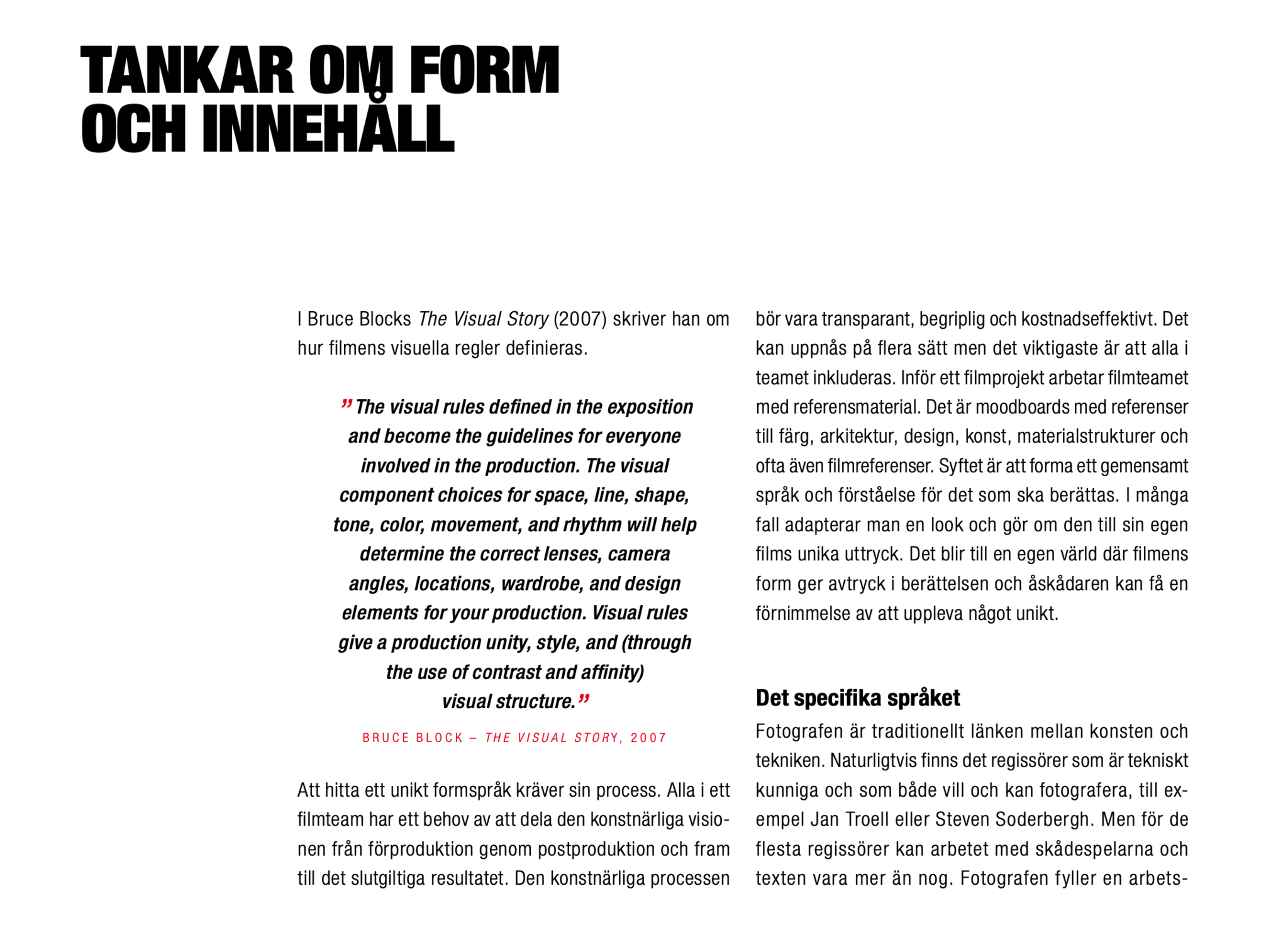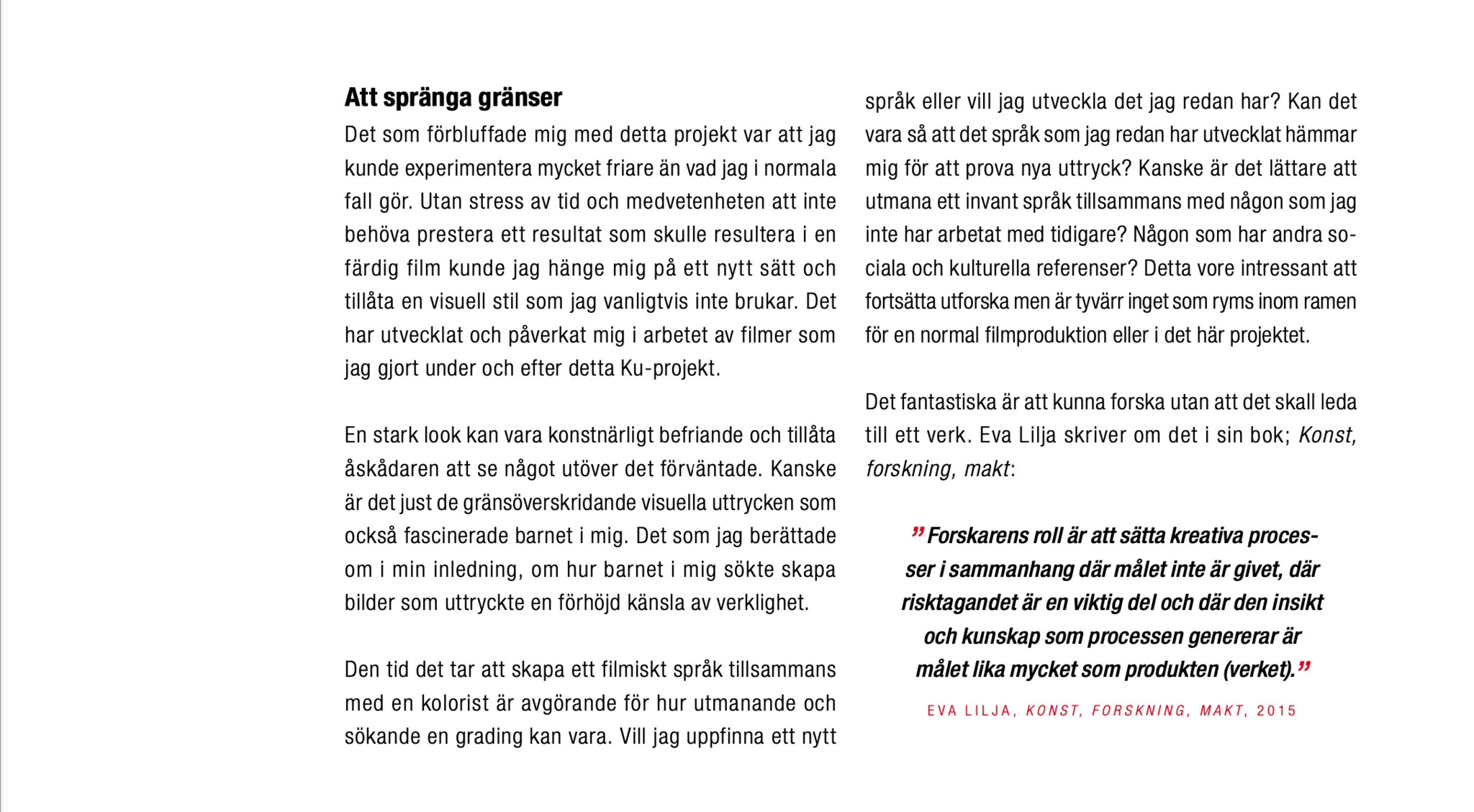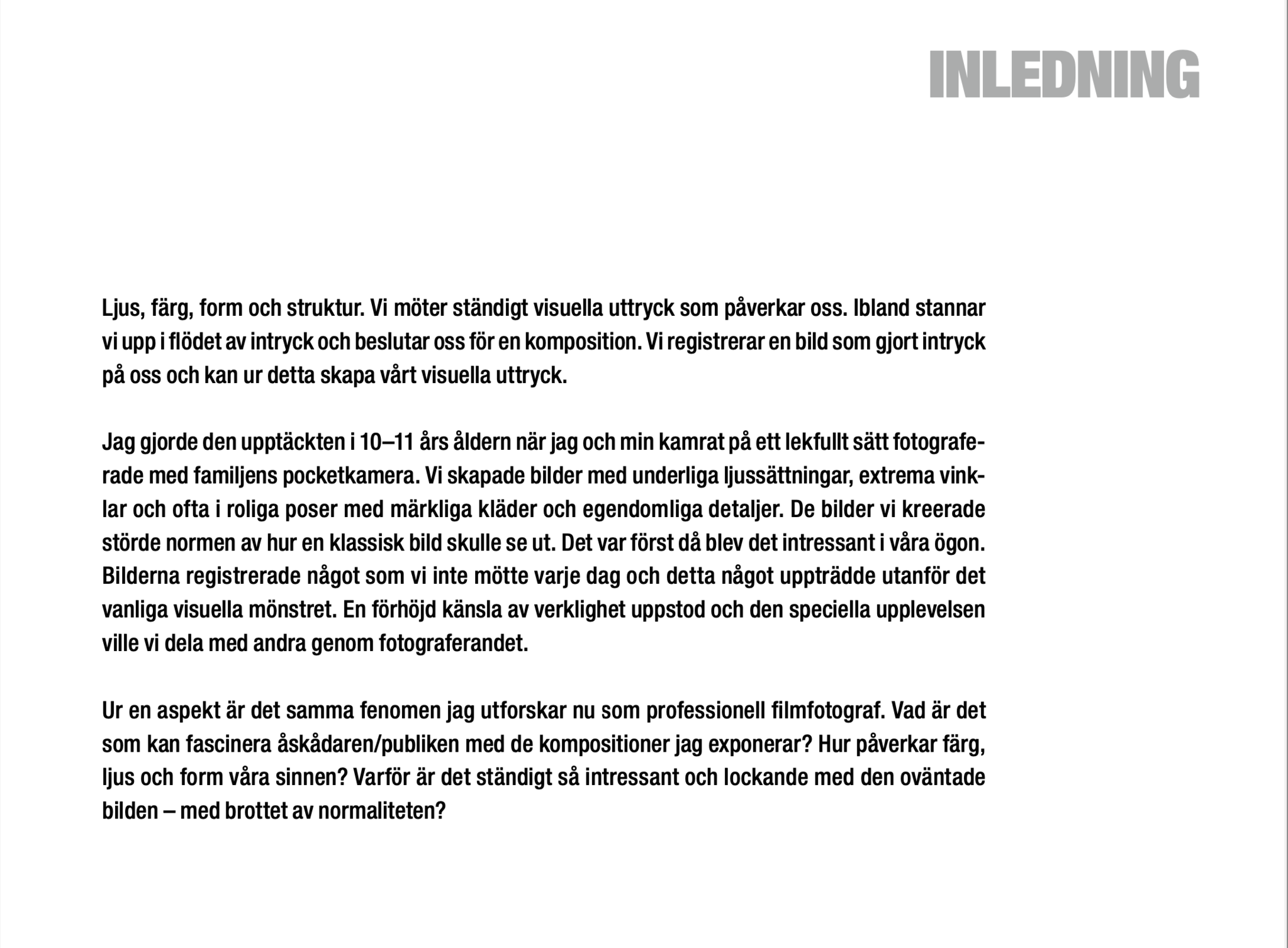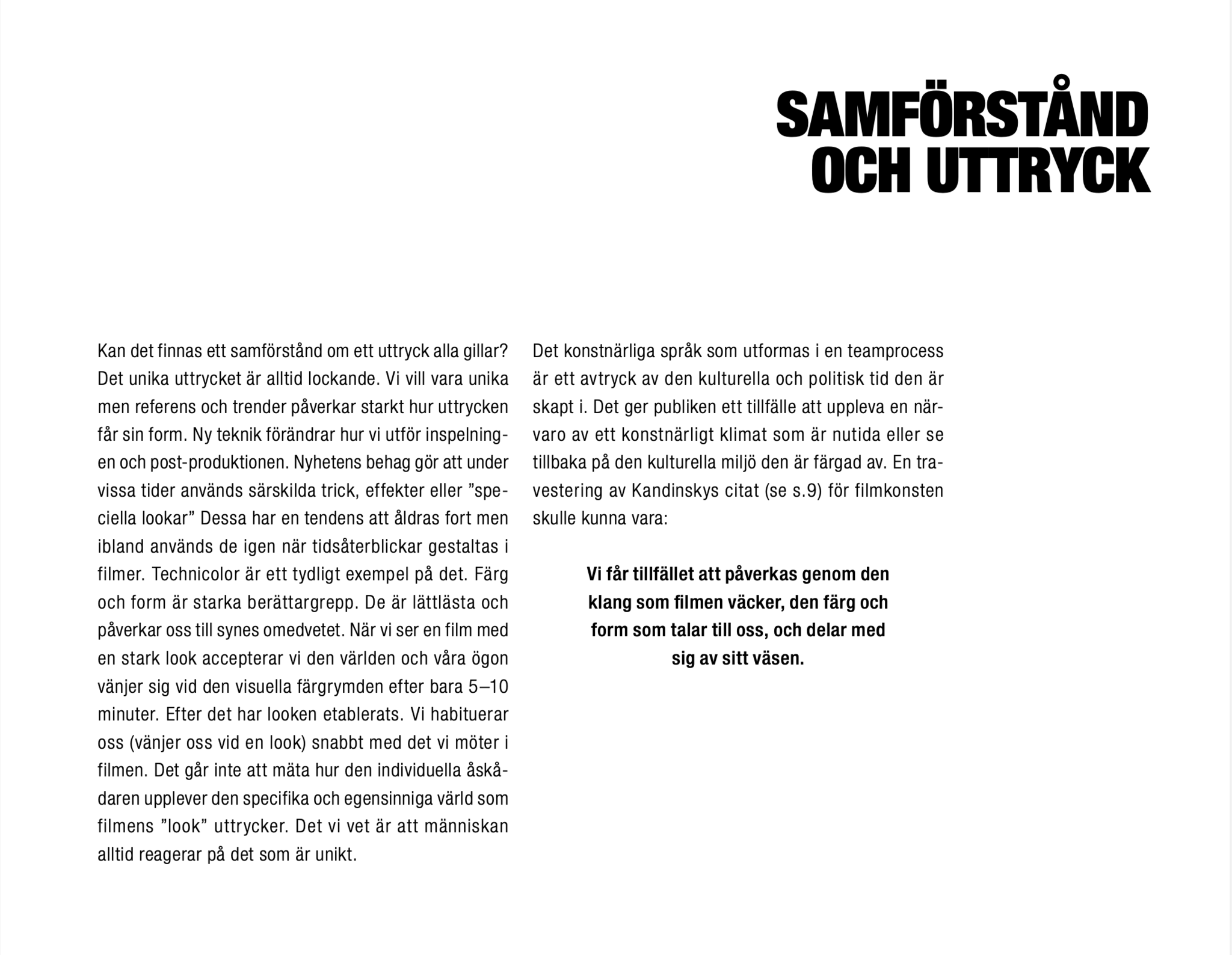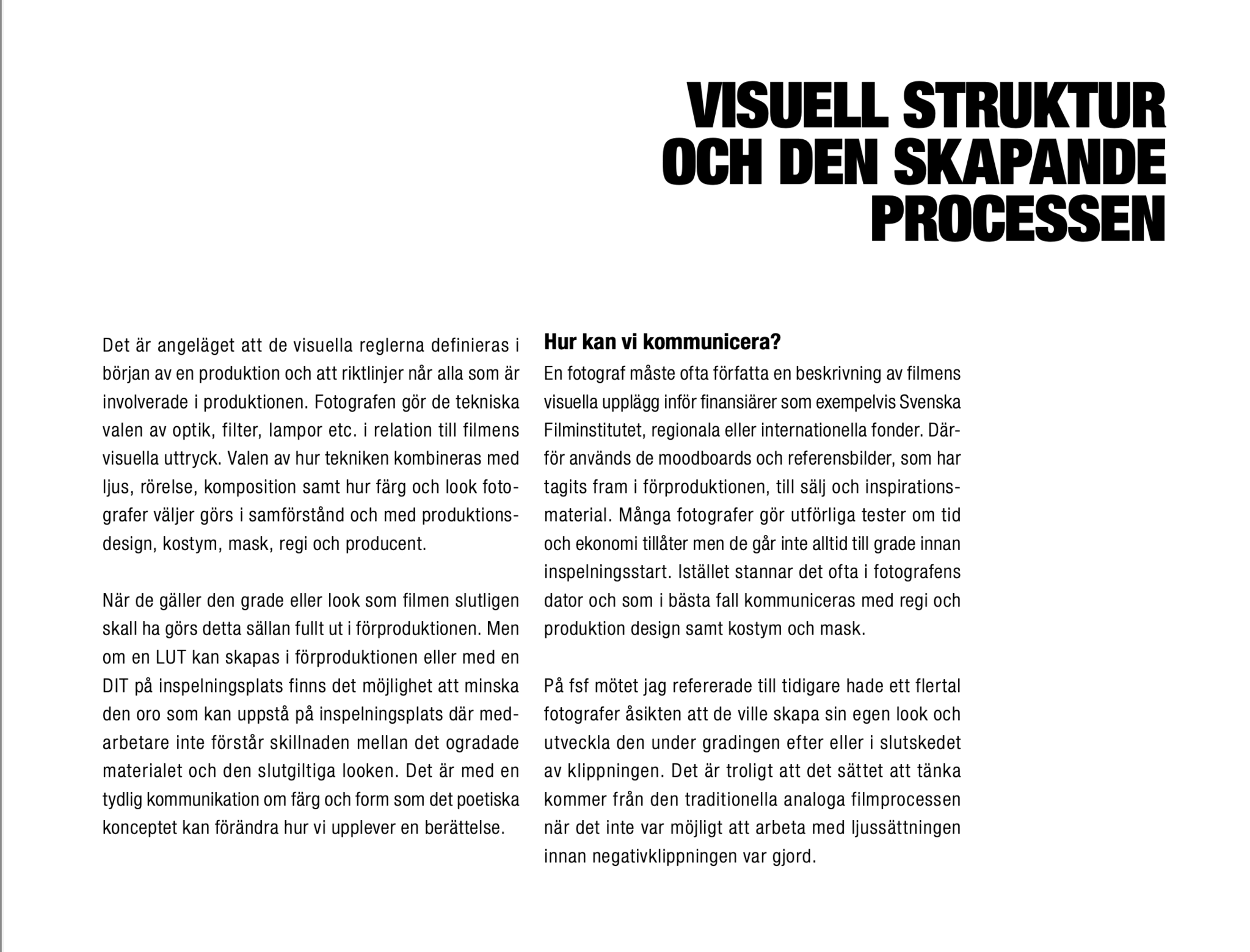 Hur påverkar färg, ljus och form våra sinnen? Varför är det ständigt så intressant och lockande med den oväntade bilden – med brottet av normaliteten? Detta konstnärliga utvecklingsprojekt är sprunget ur mina erfarenheter som praktiserande filmfotograf och den del av processen som handlar om ”grading” (färdigställandet av färgsättningen). Ibland uppstår en frustration av att ett arbete inte får det utrymme som krävs för att uppnå ett bra resultat. Processen att skapa en långfilm /TV-serie är relativt lång och inte sällan kan det ta upp till ett och halvt år från en idé till en färdig film. Besluten om den slutgiltiga ”looken” (det visuella uttrycket) på filmen görs ofta i all hast när klippning och ljudläggning är klar. Producenten behöver snabbt ha klart en färdig kopia (eller DCP/Digital Cinema Package) till den utsatta deadlinen för distribution, säljmaterial eller en festival. Det är ofta då man som fotograf upptäcker de små misstagen som har gjorts i val av tagningar under klippningen. Det kan handla om små störande rörelser i ett klipp, statister som ser in i kameran, skuggor och ljusförändringar, klaffmisstag och misstag i mask och kostym. Detta har inte uppmärksammats i klipprummets ogradade, lilla monitorbild därför att misstagen inte är synliga förrän graden är gjord. En annan komplexitet är när regissör och klippare inte har sett eller vågat använda det bildberättande som finns i materialet därför att de inte har upplevt bildens hela potential. Det kan bero på att att de har arbetat med blaskiga, ogradade och lågupplösta klippversioner av exempelvis mörka scener eller stora bilder. I dessa versioner är de svåra att läsa av och sammantaget kan det resultera i att man inte ser potentialen för gestaltande scenerier eller större bilder. Det leder i sin tur till fler konventionella val än vad ett utforskande filmiskt val kan uttrycka och berätta. Mot bakgrund av detta har jag formulerat fyra frågor att undersöka i mitt projekt: 1. Vilka visuella målsättningar definieras i början av en produktion? 2. Hur kan alla i en produktion bli delaktiga de visuella riktlinjerna? 3. Hur kommunicerar vi den visuella strukturen under den skapande processen? 4. Kan det finnas ett samförstånd om vilket visuellt uttryck som är att föredra? Projektet har fått titeln Hur formen påverkar oss. Jag har i projektet klippt ihop en fristående två minuters sekvens ur långfilmen Sophelikoptern, i vilken jag var filmfotograf. Sekvensen är inte en hel berättelse utan vald för sitt konstnärliga uttryck. Den har därefter färgkorrigerats i fem varianter av olika kolorister. Mitt syfte har varit att se hur de skilda uttrycken i koloreringen kan upplevas. Forskningsfrågorna har varit min utgångspunkt i det praktiska arbetet med färgkorrigeringen av bilderna. Det har resulterat i fem olika lookar med unika visuella uttryck, skapade av koloristerna i samarbete med mig. Jag har presenterat resultaten dels i min undervisning på Stockholms Dramatiska Högskola (StDH), dels vid filmfestivalen i Nordkap och dels på föreläsningar för Föreningen för Svenska Filmfotografer (fsf). I samband med mina presentationer framställde jag en enkät riktad till yrkesverksamma filmfotografer. Frågorna handlade om vilka erfarenheter de hade av att arbeta med färgkollorering. Enkätens syfte var att få en så tydlig översikt som möjligt av hur arbetssituationen med färgkorrigering ser ut för svensk TV och film idag. Min analys av enkätsvaren och resultaten av projektet i sin helhet har jag sammanställt i ett utbildningsmaterial. I materialet fokuserar jag på hur färger kan upplevas och om de skillnader i upplevelser som kan uppstå i olika kulturella kontexter. Jag skriver om hur vissa visuella uttryck kan bli förborgade i en generation eller i olika sociala grupper. Bild- och färgspråk kan variera såväl mellan grupper som mellan generationer. Dessa olika språk förändras fortare än vad vi är medvetna om genom det dagliga rika flödet av bildberättande. Jag lyfter också frågor om vad habituering gör med vårt berättande vilket handlar om hur snabbt vi vänjer oss vid en ett speciellt visuellt uttryck? Det kan ofta räcka med ett par minuter för oss som åskådare att vänja oss vid en viss stil av filmiskt berättande. Det leder till frågan om vilken påverkan färger har på det filmiska berättandet? Och hur vi kan använda kunskapen om detta för att rytmisera ett berättande? I mitt resonemang om färger hänvisar jag bland annat till boken Goethe färglära 1 och Newtons första experiment 2 med prismat. I Pehr Sällströms Goethes färglära (2014) finns ett tankeväckande citat av konstnären Vasilij Kandinsky: ”Vi måste lyssna till den klang som färgen väcker i vår själ. Och vi måste göra detta öppet, så hängiven, så osjälviskt, att vi med övertygelse kan konstatera, att det är färgen som talar till oss, att vi fått erfara något av dess väsen.”P E R S Ä L L S T R Ö M , G O E T H E S F Ä R G L Ä R A , 2 0 1 4