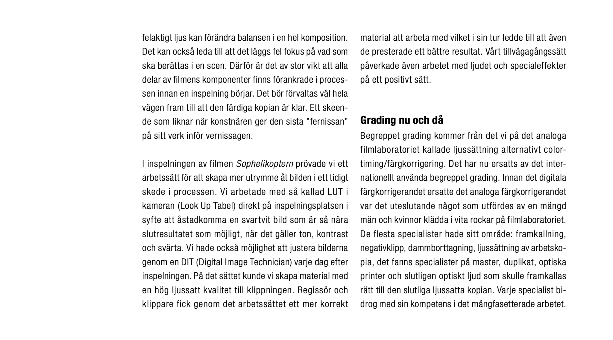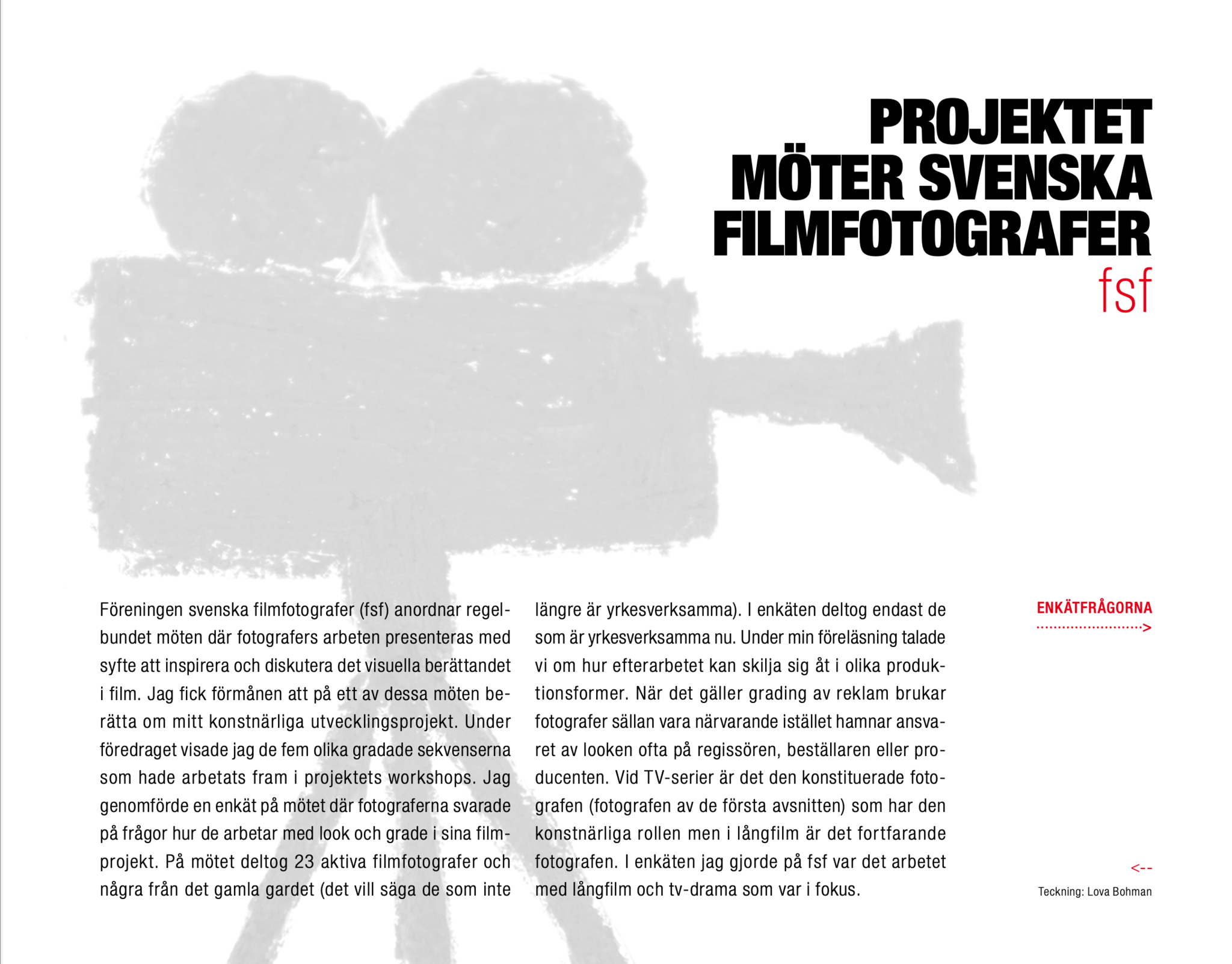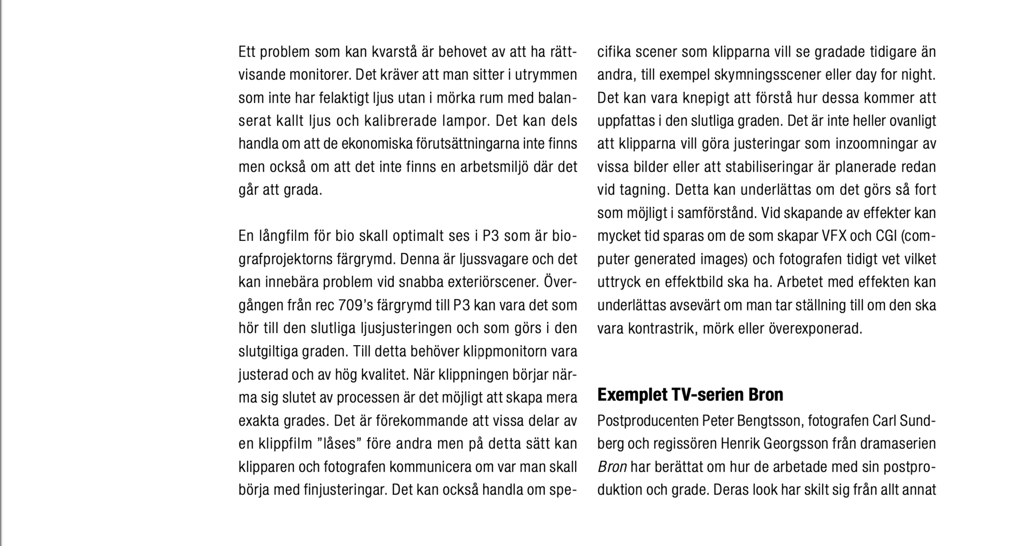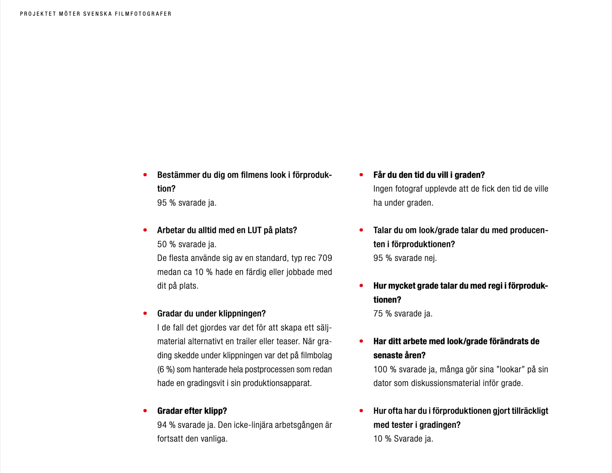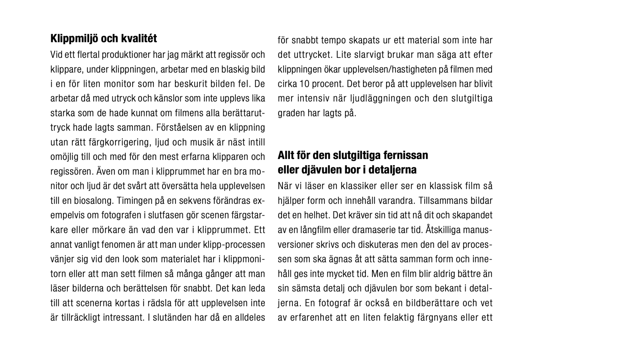 Hur påverkar färg, ljus och form våra sinnen? Varför är det ständigt så intressant och lockande med den oväntade bilden – med brottet av normaliteten? Detta konstnärliga utvecklingsprojekt är sprunget ur mina erfarenheter som praktiserande filmfotograf och den del av processen som handlar om ”grading” (färdigställandet av färgsättningen). Ibland uppstår en frustration av att ett arbete inte får det utrymme som krävs för att uppnå ett bra resultat. Processen att skapa en långfilm /TV-serie är relativt lång och inte sällan kan det ta upp till ett och halvt år från en idé till en färdig film. Besluten om den slutgiltiga ”looken” (det visuella uttrycket) på filmen görs ofta i all hast när klippning och ljudläggning är klar. Producenten behöver snabbt ha klart en färdig kopia (eller DCP/Digital Cinema Package) till den utsatta deadlinen för distribution, säljmaterial eller en festival. Det är ofta då man som fotograf upptäcker de små misstagen som har gjorts i val av tagningar under klippningen. Det kan handla om små störande rörelser i ett klipp, statister som ser in i kameran, skuggor och ljusförändringar, klaffmisstag och misstag i mask och kostym. Detta har inte uppmärksammats i klipprummets ogradade, lilla monitorbild därför att misstagen inte är synliga förrän graden är gjord. En annan komplexitet är när regissör och klippare inte har sett eller vågat använda det bildberättande som finns i materialet därför att de inte har upplevt bildens hela potential. Det kan bero på att att de har arbetat med blaskiga, ogradade och lågupplösta klippversioner av exempelvis mörka scener eller stora bilder. I dessa versioner är de svåra att läsa av och sammantaget kan det resultera i att man inte ser potentialen för gestaltande scenerier eller större bilder. Det leder i sin tur till fler konventionella val än vad ett utforskande filmiskt val kan uttrycka och berätta. Mot bakgrund av detta har jag formulerat fyra frågor att undersöka i mitt projekt: 1. Vilka visuella målsättningar definieras i början av en produktion? 2. Hur kan alla i en produktion bli delaktiga de visuella riktlinjerna? 3. Hur kommunicerar vi den visuella strukturen under den skapande processen? 4. Kan det finnas ett samförstånd om vilket visuellt uttryck som är att föredra? Projektet har fått titeln Hur formen påverkar oss. Jag har i projektet klippt ihop en fristående två minuters sekvens ur långfilmen Sophelikoptern, i vilken jag var filmfotograf. Sekvensen är inte en hel berättelse utan vald för sitt konstnärliga uttryck. Den har därefter färgkorrigerats i fem varianter av olika kolorister. Mitt syfte har varit att se hur de skilda uttrycken i koloreringen kan upplevas. Forskningsfrågorna har varit min utgångspunkt i det praktiska arbetet med färgkorrigeringen av bilderna. Det har resulterat i fem olika lookar med unika visuella uttryck, skapade av koloristerna i samarbete med mig. Jag har presenterat resultaten dels i min undervisning på Stockholms Dramatiska Högskola (StDH), dels vid filmfestivalen i Nordkap och dels på föreläsningar för Föreningen för Svenska Filmfotografer (fsf). I samband med mina presentationer framställde jag en enkät riktad till yrkesverksamma filmfotografer. Frågorna handlade om vilka erfarenheter de hade av att arbeta med färgkollorering. Enkätens syfte var att få en så tydlig översikt som möjligt av hur arbetssituationen med färgkorrigering ser ut för svensk TV och film idag. Min analys av enkätsvaren och resultaten av projektet i sin helhet har jag sammanställt i ett utbildningsmaterial. I materialet fokuserar jag på hur färger kan upplevas och om de skillnader i upplevelser som kan uppstå i olika kulturella kontexter. Jag skriver om hur vissa visuella uttryck kan bli förborgade i en generation eller i olika sociala grupper. Bild- och färgspråk kan variera såväl mellan grupper som mellan generationer. Dessa olika språk förändras fortare än vad vi är medvetna om genom det dagliga rika flödet av bildberättande. Jag lyfter också frågor om vad habituering gör med vårt berättande vilket handlar om hur snabbt vi vänjer oss vid en ett speciellt visuellt uttryck? Det kan ofta räcka med ett par minuter för oss som åskådare att vänja oss vid en viss stil av filmiskt berättande. Det leder till frågan om vilken påverkan färger har på det filmiska berättandet? Och hur vi kan använda kunskapen om detta för att rytmisera ett berättande? I mitt resonemang om färger hänvisar jag bland annat till boken Goethe färglära 1 och Newtons första experiment 2 med prismat. I Pehr Sällströms Goethes färglära (2014) finns ett tankeväckande citat av konstnären Vasilij Kandinsky: ”Vi måste lyssna till den klang som färgen väcker i vår själ. Och vi måste göra detta öppet, så hängiven, så osjälviskt, att vi med övertygelse kan konstatera, att det är färgen som talar till oss, att vi fått erfara något av dess väsen.”P E R S Ä L L S T R Ö M , G O E T H E S F Ä R G L Ä R A , 2 0 1 4