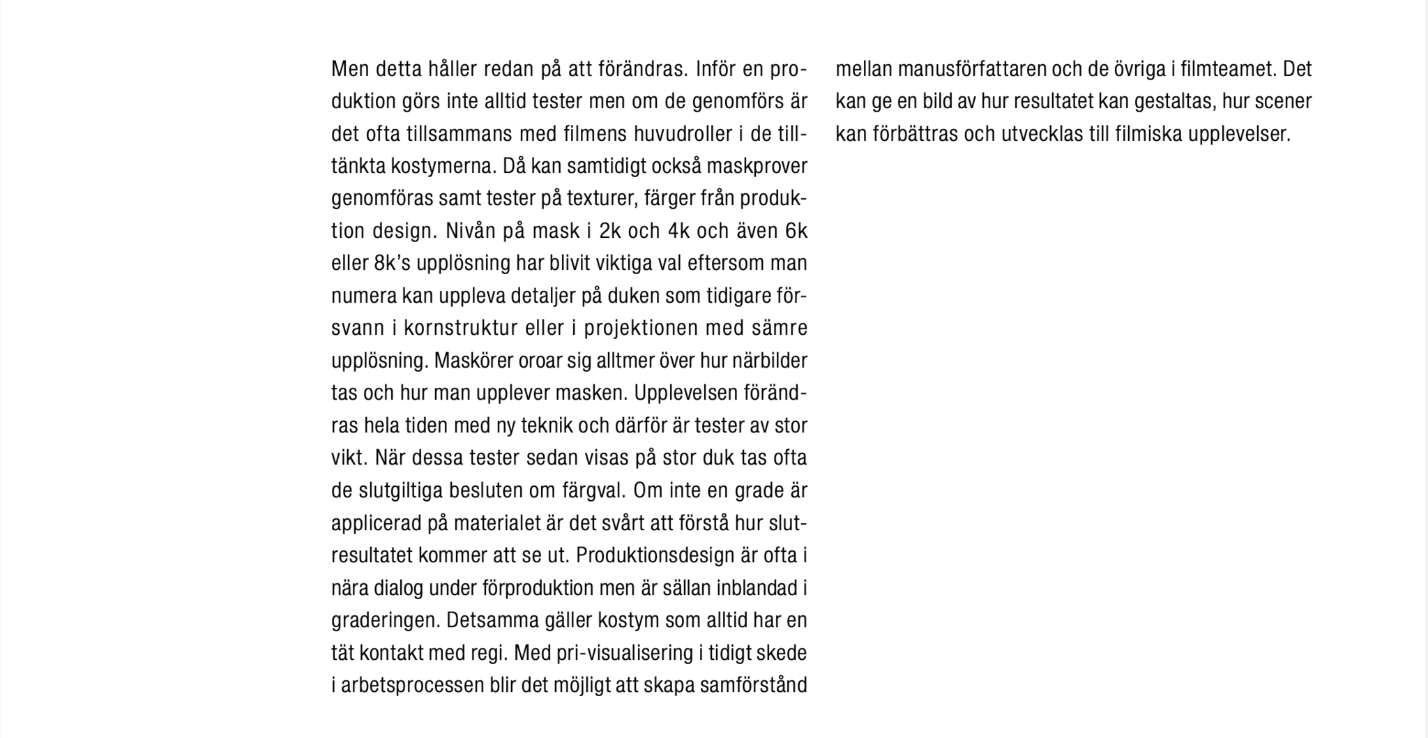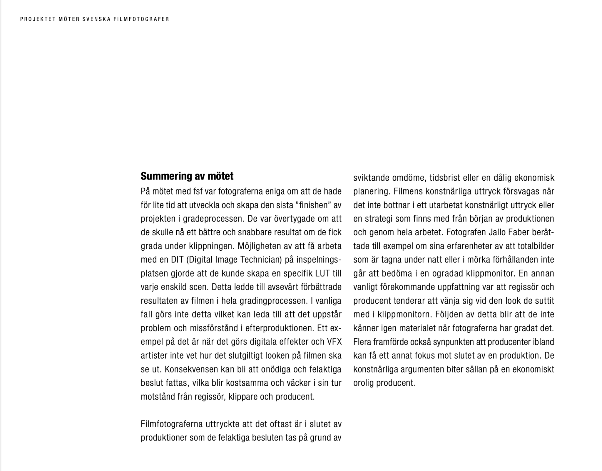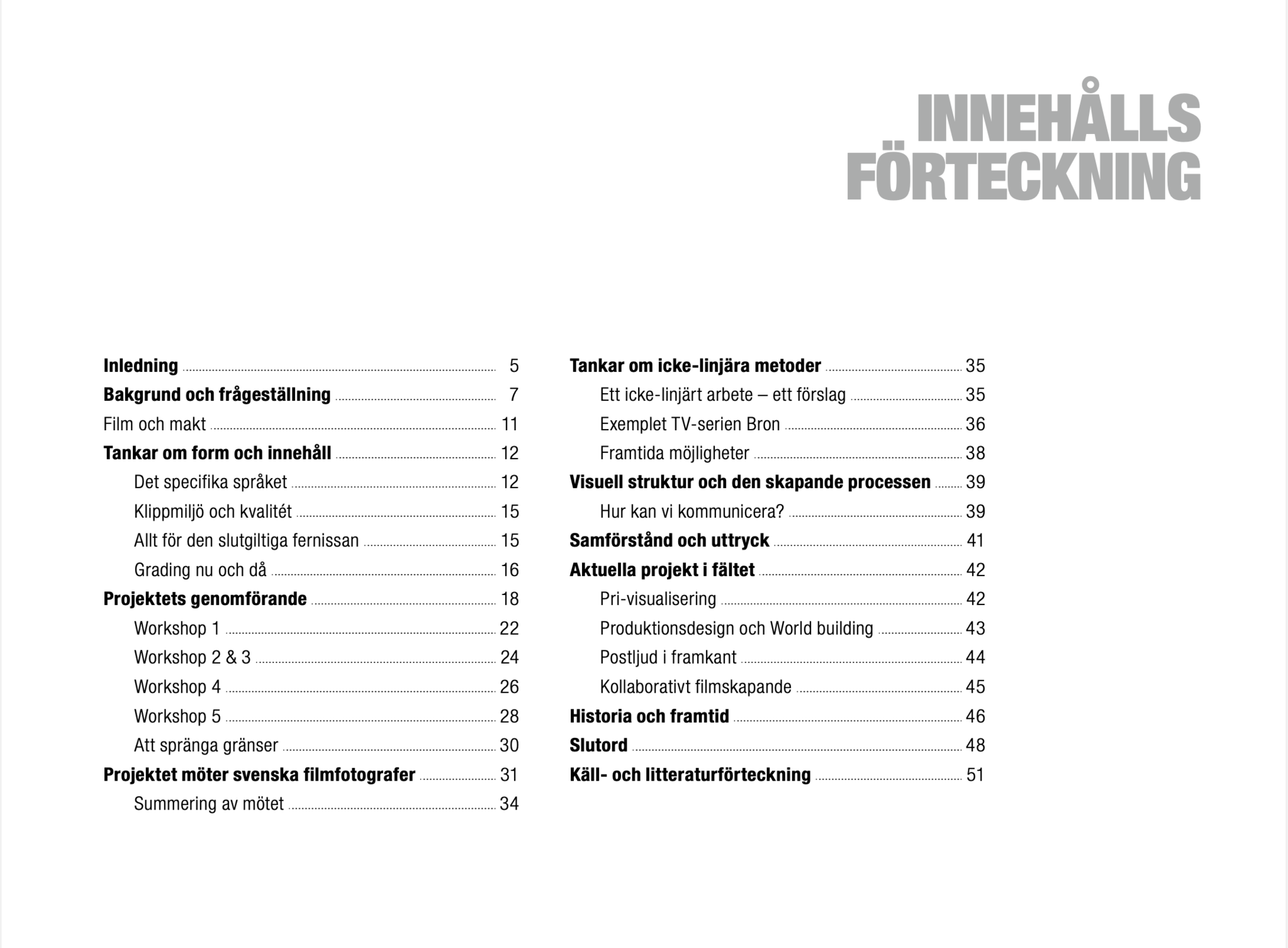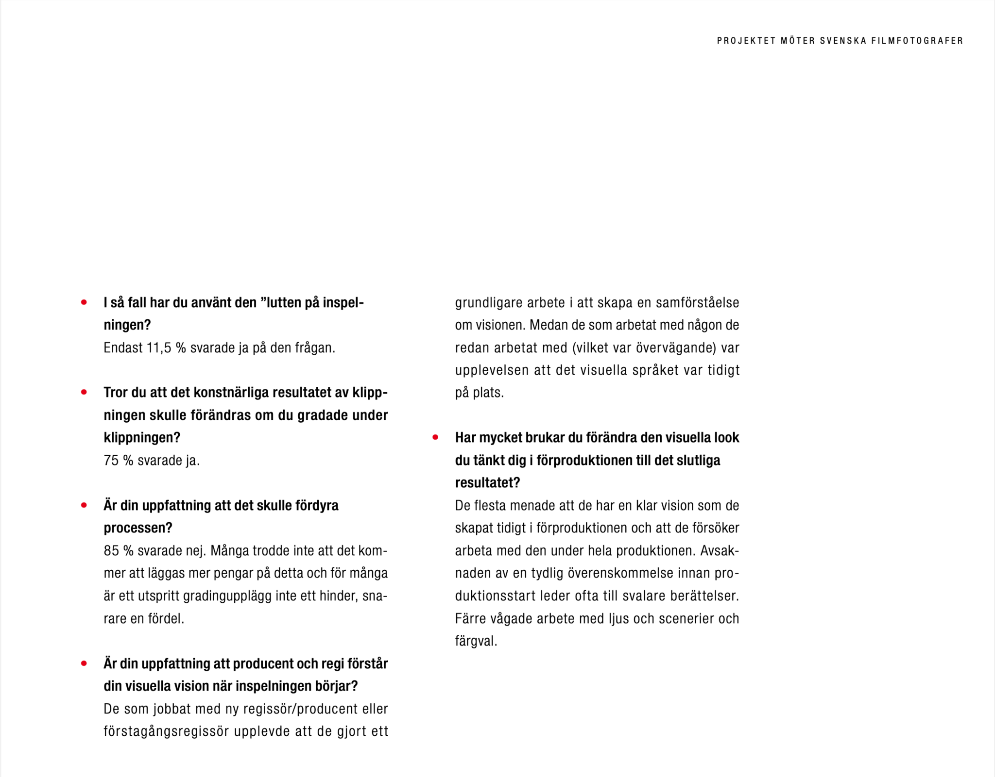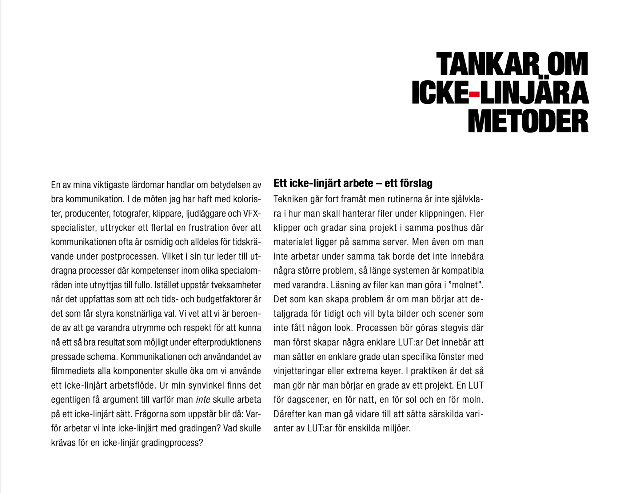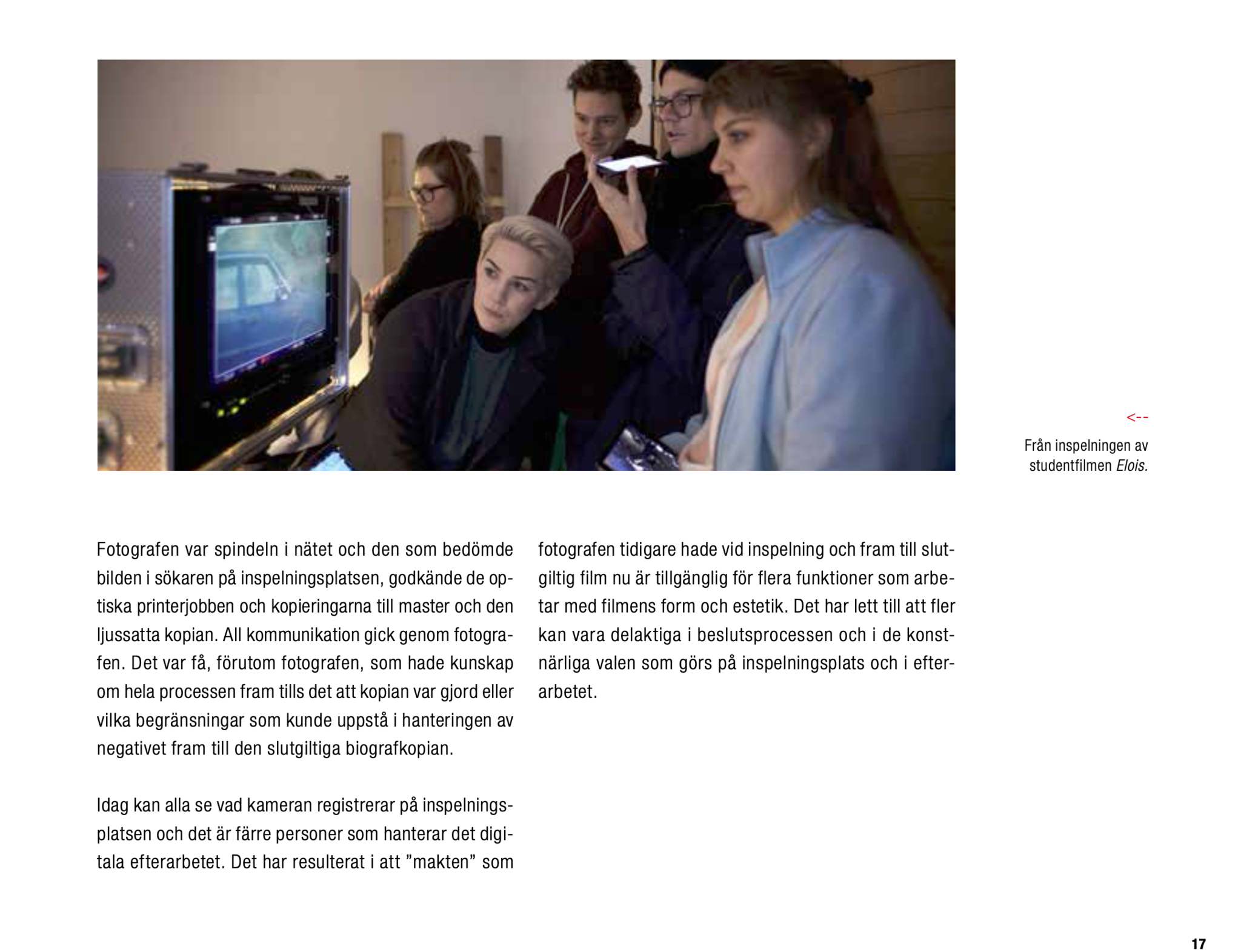 Hur påverkar färg, ljus och form våra sinnen? Varför är det ständigt så intressant och lockande med den oväntade bilden – med brottet av normaliteten? Detta konstnärliga utvecklingsprojekt är sprunget ur mina erfarenheter som praktiserande filmfotograf och den del av processen som handlar om ”grading” (färdigställandet av färgsättningen). Ibland uppstår en frustration av att ett arbete inte får det utrymme som krävs för att uppnå ett bra resultat. Processen att skapa en långfilm /TV-serie är relativt lång och inte sällan kan det ta upp till ett och halvt år från en idé till en färdig film. Besluten om den slutgiltiga ”looken” (det visuella uttrycket) på filmen görs ofta i all hast när klippning och ljudläggning är klar. Producenten behöver snabbt ha klart en färdig kopia (eller DCP/Digital Cinema Package) till den utsatta deadlinen för distribution, säljmaterial eller en festival. Det är ofta då man som fotograf upptäcker de små misstagen som har gjorts i val av tagningar under klippningen. Det kan handla om små störande rörelser i ett klipp, statister som ser in i kameran, skuggor och ljusförändringar, klaffmisstag och misstag i mask och kostym. Detta har inte uppmärksammats i klipprummets ogradade, lilla monitorbild därför att misstagen inte är synliga förrän graden är gjord. En annan komplexitet är när regissör och klippare inte har sett eller vågat använda det bildberättande som finns i materialet därför att de inte har upplevt bildens hela potential. Det kan bero på att att de har arbetat med blaskiga, ogradade och lågupplösta klippversioner av exempelvis mörka scener eller stora bilder. I dessa versioner är de svåra att läsa av och sammantaget kan det resultera i att man inte ser potentialen för gestaltande scenerier eller större bilder. Det leder i sin tur till fler konventionella val än vad ett utforskande filmiskt val kan uttrycka och berätta. Mot bakgrund av detta har jag formulerat fyra frågor att undersöka i mitt projekt: 1. Vilka visuella målsättningar definieras i början av en produktion? 2. Hur kan alla i en produktion bli delaktiga de visuella riktlinjerna? 3. Hur kommunicerar vi den visuella strukturen under den skapande processen? 4. Kan det finnas ett samförstånd om vilket visuellt uttryck som är att föredra? Projektet har fått titeln Hur formen påverkar oss. Jag har i projektet klippt ihop en fristående två minuters sekvens ur långfilmen Sophelikoptern, i vilken jag var filmfotograf. Sekvensen är inte en hel berättelse utan vald för sitt konstnärliga uttryck. Den har därefter färgkorrigerats i fem varianter av olika kolorister. Mitt syfte har varit att se hur de skilda uttrycken i koloreringen kan upplevas. Forskningsfrågorna har varit min utgångspunkt i det praktiska arbetet med färgkorrigeringen av bilderna. Det har resulterat i fem olika lookar med unika visuella uttryck, skapade av koloristerna i samarbete med mig. Jag har presenterat resultaten dels i min undervisning på Stockholms Dramatiska Högskola (StDH), dels vid filmfestivalen i Nordkap och dels på föreläsningar för Föreningen för Svenska Filmfotografer (fsf). I samband med mina presentationer framställde jag en enkät riktad till yrkesverksamma filmfotografer. Frågorna handlade om vilka erfarenheter de hade av att arbeta med färgkollorering. Enkätens syfte var att få en så tydlig översikt som möjligt av hur arbetssituationen med färgkorrigering ser ut för svensk TV och film idag. Min analys av enkätsvaren och resultaten av projektet i sin helhet har jag sammanställt i ett utbildningsmaterial. I materialet fokuserar jag på hur färger kan upplevas och om de skillnader i upplevelser som kan uppstå i olika kulturella kontexter. Jag skriver om hur vissa visuella uttryck kan bli förborgade i en generation eller i olika sociala grupper. Bild- och färgspråk kan variera såväl mellan grupper som mellan generationer. Dessa olika språk förändras fortare än vad vi är medvetna om genom det dagliga rika flödet av bildberättande. Jag lyfter också frågor om vad habituering gör med vårt berättande vilket handlar om hur snabbt vi vänjer oss vid en ett speciellt visuellt uttryck? Det kan ofta räcka med ett par minuter för oss som åskådare att vänja oss vid en viss stil av filmiskt berättande. Det leder till frågan om vilken påverkan färger har på det filmiska berättandet? Och hur vi kan använda kunskapen om detta för att rytmisera ett berättande? I mitt resonemang om färger hänvisar jag bland annat till boken Goethe färglära 1 och Newtons första experiment 2 med prismat. I Pehr Sällströms Goethes färglära (2014) finns ett tankeväckande citat av konstnären Vasilij Kandinsky: ”Vi måste lyssna till den klang som färgen väcker i vår själ. Och vi måste göra detta öppet, så hängiven, så osjälviskt, att vi med övertygelse kan konstatera, att det är färgen som talar till oss, att vi fått erfara något av dess väsen.”P E R S Ä L L S T R Ö M , G O E T H E S F Ä R G L Ä R A , 2 0 1 4