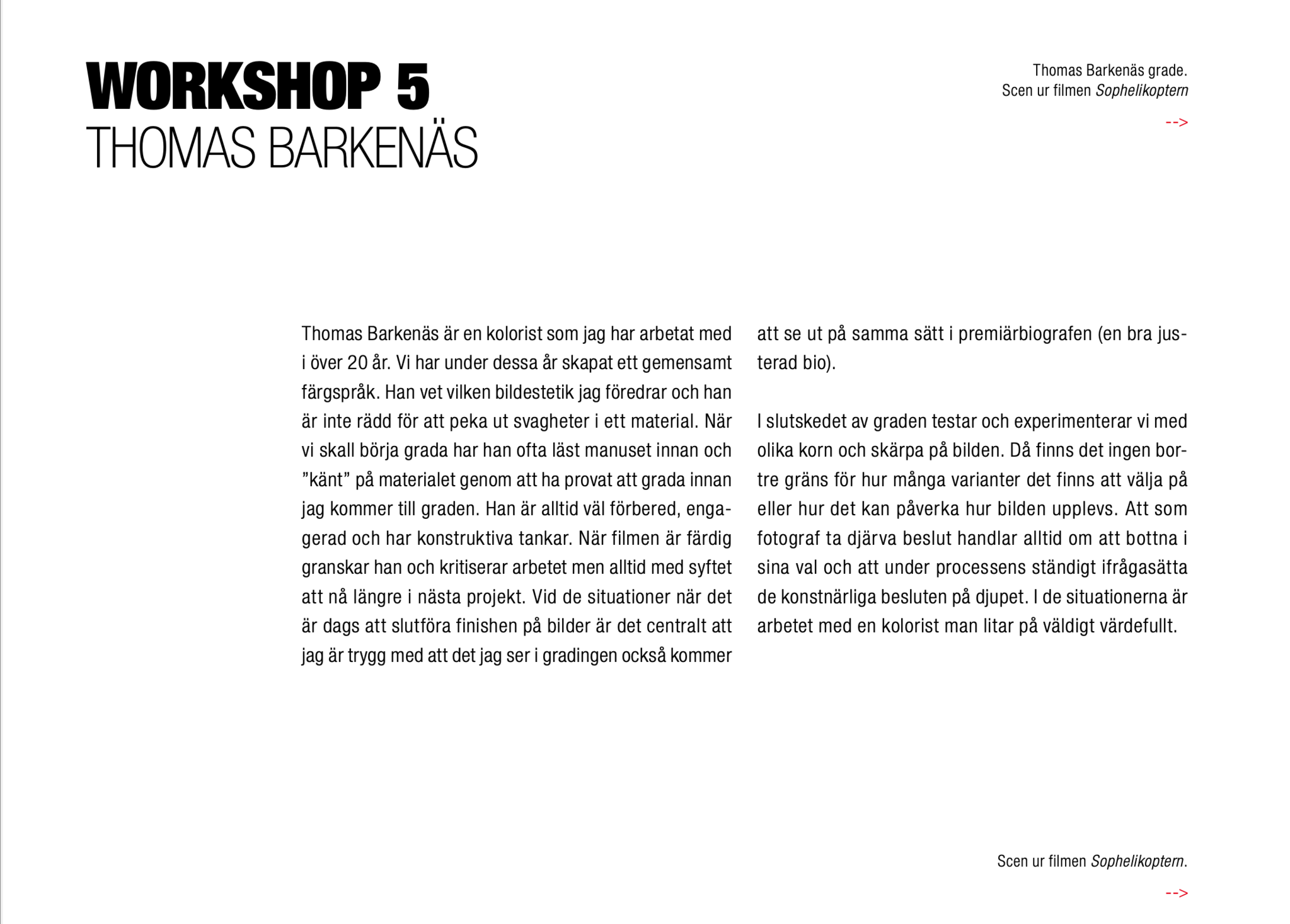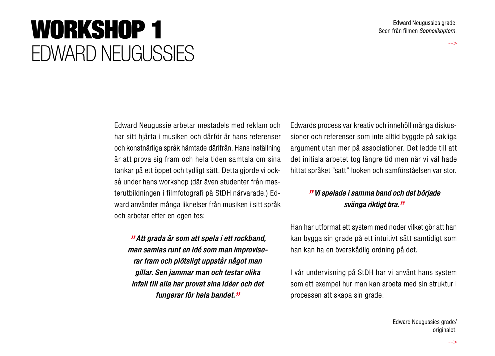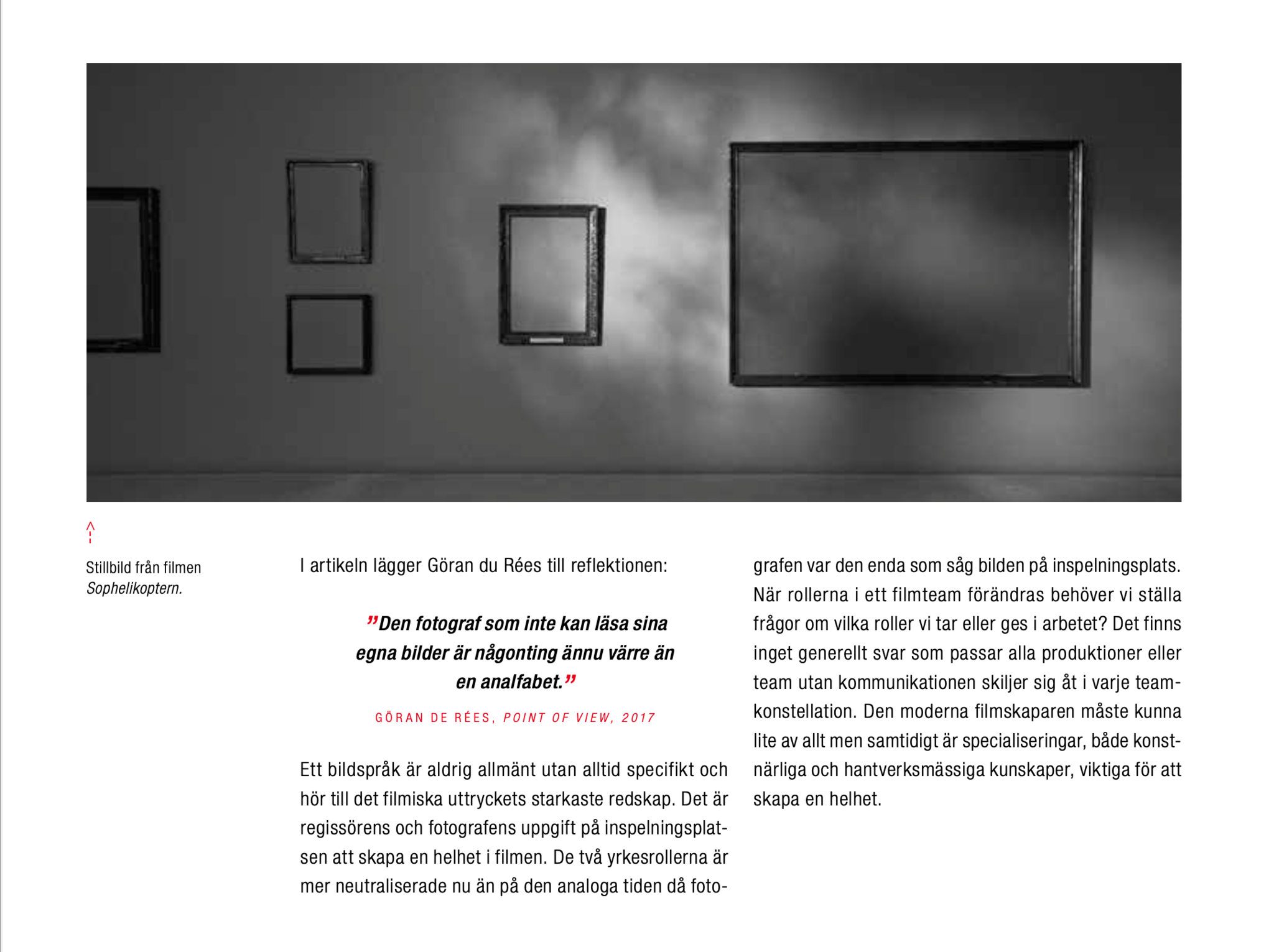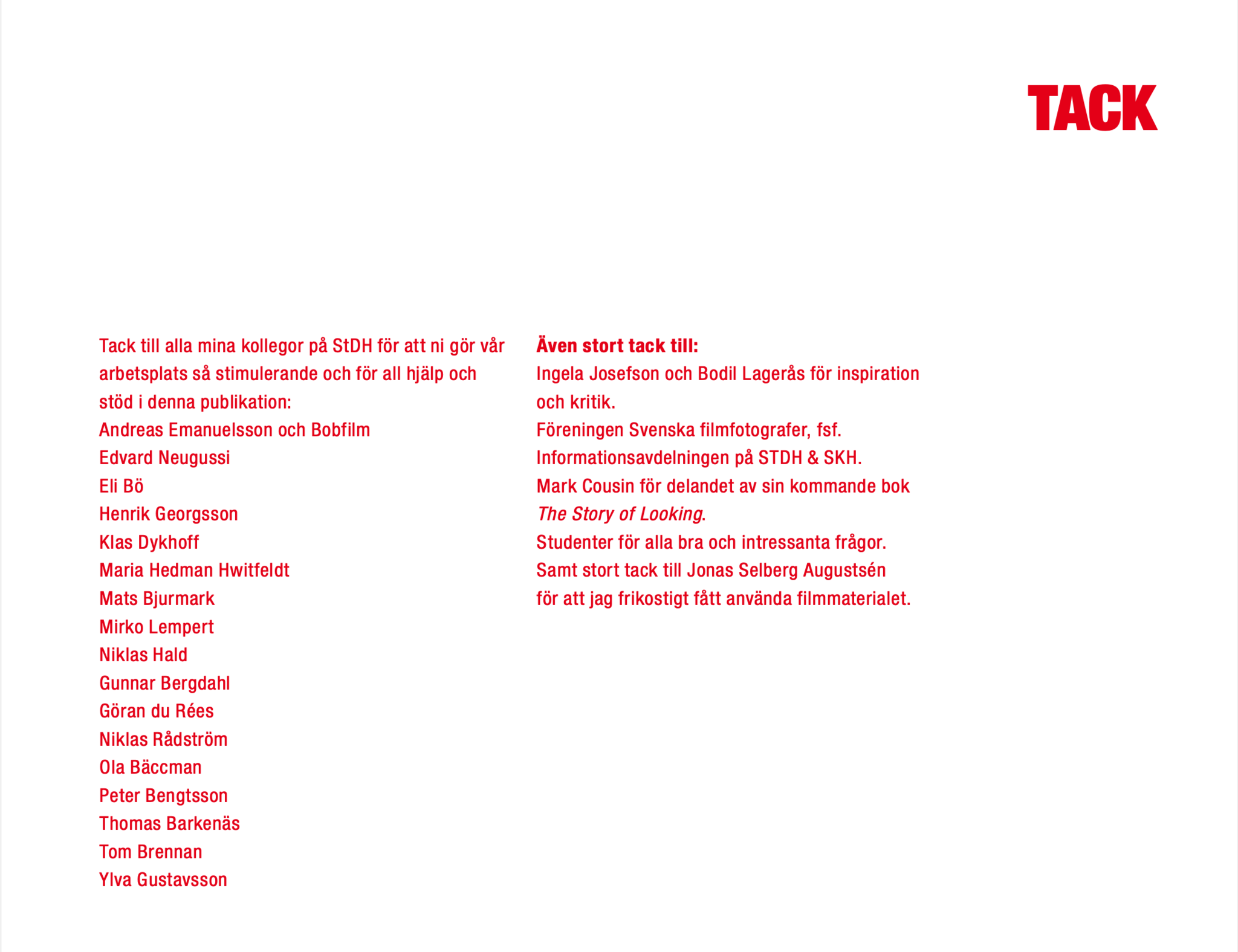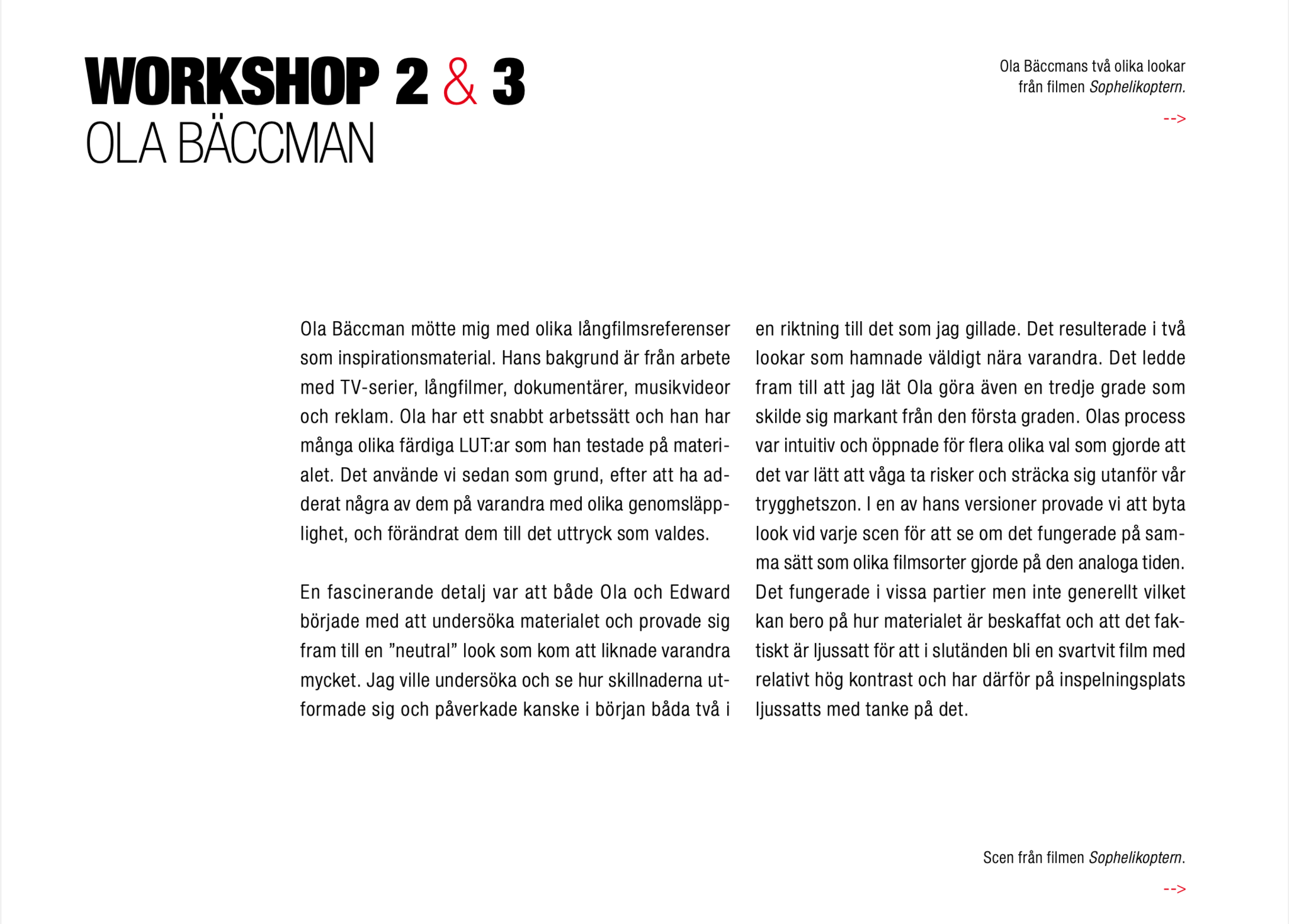 Hur påverkar färg, ljus och form våra sinnen? Varför är det ständigt så intressant och lockande med den oväntade bilden – med brottet av normaliteten? Detta konstnärliga utvecklingsprojekt är sprunget ur mina erfarenheter som praktiserande filmfotograf och den del av processen som handlar om ”grading” (färdigställandet av färgsättningen). Ibland uppstår en frustration av att ett arbete inte får det utrymme som krävs för att uppnå ett bra resultat. Processen att skapa en långfilm /TV-serie är relativt lång och inte sällan kan det ta upp till ett och halvt år från en idé till en färdig film. Besluten om den slutgiltiga ”looken” (det visuella uttrycket) på filmen görs ofta i all hast när klippning och ljudläggning är klar. Producenten behöver snabbt ha klart en färdig kopia (eller DCP/Digital Cinema Package) till den utsatta deadlinen för distribution, säljmaterial eller en festival. Det är ofta då man som fotograf upptäcker de små misstagen som har gjorts i val av tagningar under klippningen. Det kan handla om små störande rörelser i ett klipp, statister som ser in i kameran, skuggor och ljusförändringar, klaffmisstag och misstag i mask och kostym. Detta har inte uppmärksammats i klipprummets ogradade, lilla monitorbild därför att misstagen inte är synliga förrän graden är gjord. En annan komplexitet är när regissör och klippare inte har sett eller vågat använda det bildberättande som finns i materialet därför att de inte har upplevt bildens hela potential. Det kan bero på att att de har arbetat med blaskiga, ogradade och lågupplösta klippversioner av exempelvis mörka scener eller stora bilder. I dessa versioner är de svåra att läsa av och sammantaget kan det resultera i att man inte ser potentialen för gestaltande scenerier eller större bilder. Det leder i sin tur till fler konventionella val än vad ett utforskande filmiskt val kan uttrycka och berätta. Mot bakgrund av detta har jag formulerat fyra frågor att undersöka i mitt projekt: 1. Vilka visuella målsättningar definieras i början av en produktion? 2. Hur kan alla i en produktion bli delaktiga de visuella riktlinjerna? 3. Hur kommunicerar vi den visuella strukturen under den skapande processen? 4. Kan det finnas ett samförstånd om vilket visuellt uttryck som är att föredra? Projektet har fått titeln Hur formen påverkar oss. Jag har i projektet klippt ihop en fristående två minuters sekvens ur långfilmen Sophelikoptern, i vilken jag var filmfotograf. Sekvensen är inte en hel berättelse utan vald för sitt konstnärliga uttryck. Den har därefter färgkorrigerats i fem varianter av olika kolorister. Mitt syfte har varit att se hur de skilda uttrycken i koloreringen kan upplevas. Forskningsfrågorna har varit min utgångspunkt i det praktiska arbetet med färgkorrigeringen av bilderna. Det har resulterat i fem olika lookar med unika visuella uttryck, skapade av koloristerna i samarbete med mig. Jag har presenterat resultaten dels i min undervisning på Stockholms Dramatiska Högskola (StDH), dels vid filmfestivalen i Nordkap och dels på föreläsningar för Föreningen för Svenska Filmfotografer (fsf). I samband med mina presentationer framställde jag en enkät riktad till yrkesverksamma filmfotografer. Frågorna handlade om vilka erfarenheter de hade av att arbeta med färgkollorering. Enkätens syfte var att få en så tydlig översikt som möjligt av hur arbetssituationen med färgkorrigering ser ut för svensk TV och film idag. Min analys av enkätsvaren och resultaten av projektet i sin helhet har jag sammanställt i ett utbildningsmaterial. I materialet fokuserar jag på hur färger kan upplevas och om de skillnader i upplevelser som kan uppstå i olika kulturella kontexter. Jag skriver om hur vissa visuella uttryck kan bli förborgade i en generation eller i olika sociala grupper. Bild- och färgspråk kan variera såväl mellan grupper som mellan generationer. Dessa olika språk förändras fortare än vad vi är medvetna om genom det dagliga rika flödet av bildberättande. Jag lyfter också frågor om vad habituering gör med vårt berättande vilket handlar om hur snabbt vi vänjer oss vid en ett speciellt visuellt uttryck? Det kan ofta räcka med ett par minuter för oss som åskådare att vänja oss vid en viss stil av filmiskt berättande. Det leder till frågan om vilken påverkan färger har på det filmiska berättandet? Och hur vi kan använda kunskapen om detta för att rytmisera ett berättande? I mitt resonemang om färger hänvisar jag bland annat till boken Goethe färglära 1 och Newtons första experiment 2 med prismat. I Pehr Sällströms Goethes färglära (2014) finns ett tankeväckande citat av konstnären Vasilij Kandinsky: ”Vi måste lyssna till den klang som färgen väcker i vår själ. Och vi måste göra detta öppet, så hängiven, så osjälviskt, att vi med övertygelse kan konstatera, att det är färgen som talar till oss, att vi fått erfara något av dess väsen.”P E R S Ä L L S T R Ö M , G O E T H E S F Ä R G L Ä R A , 2 0 1 4
