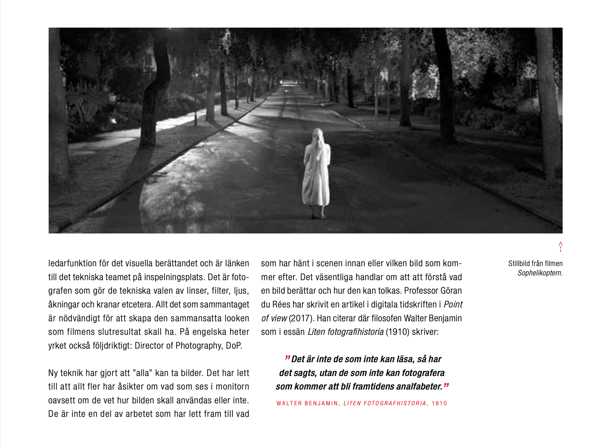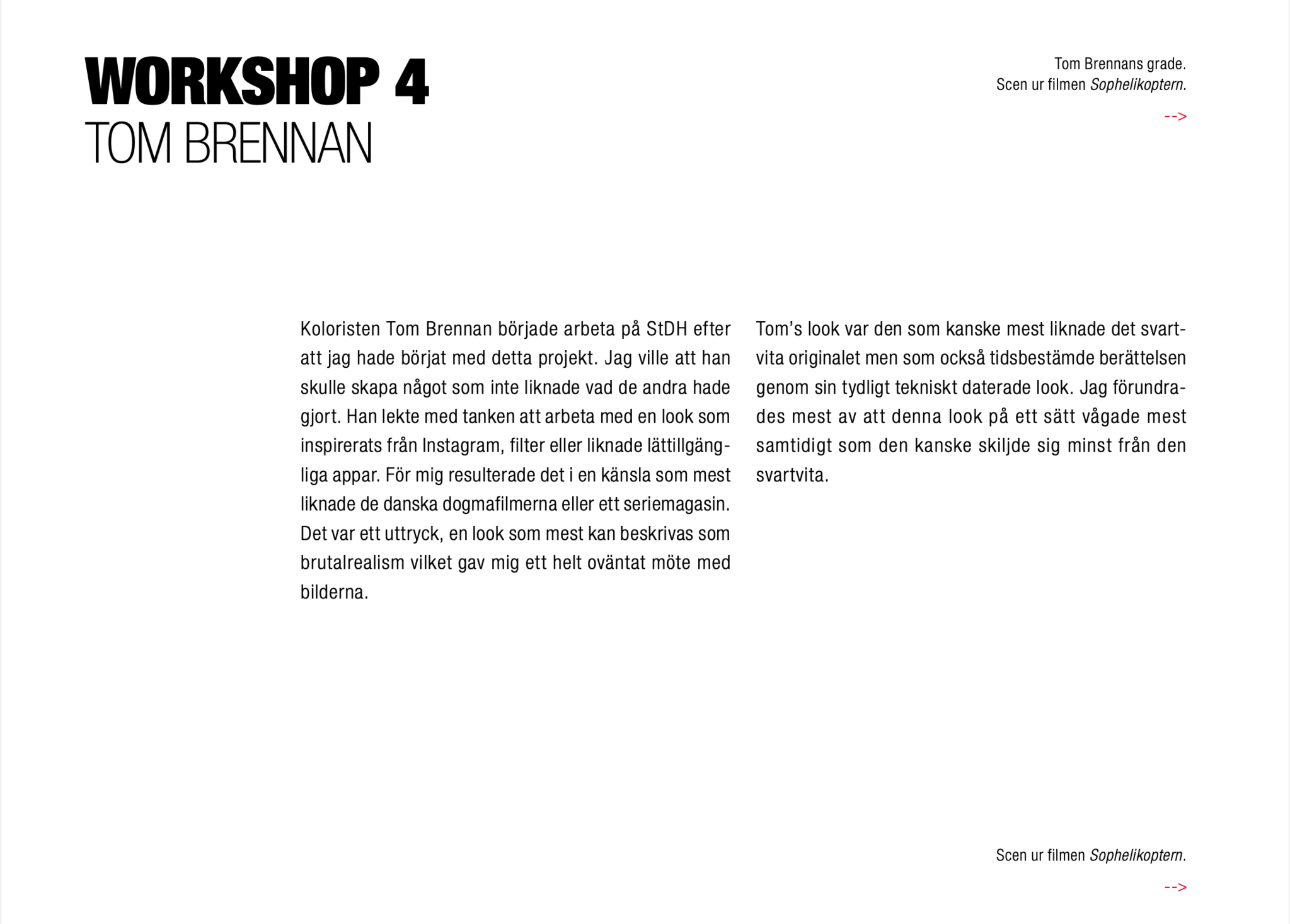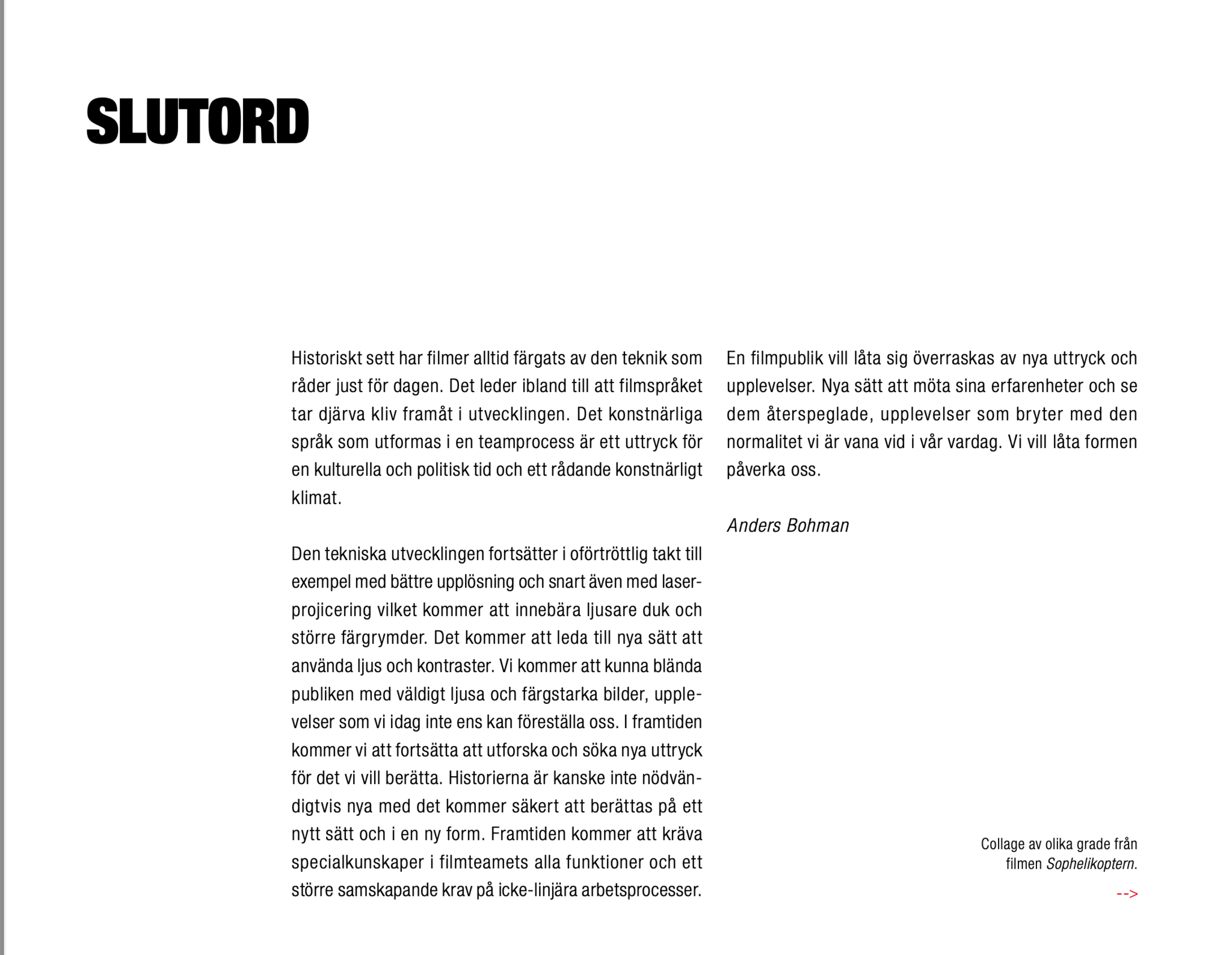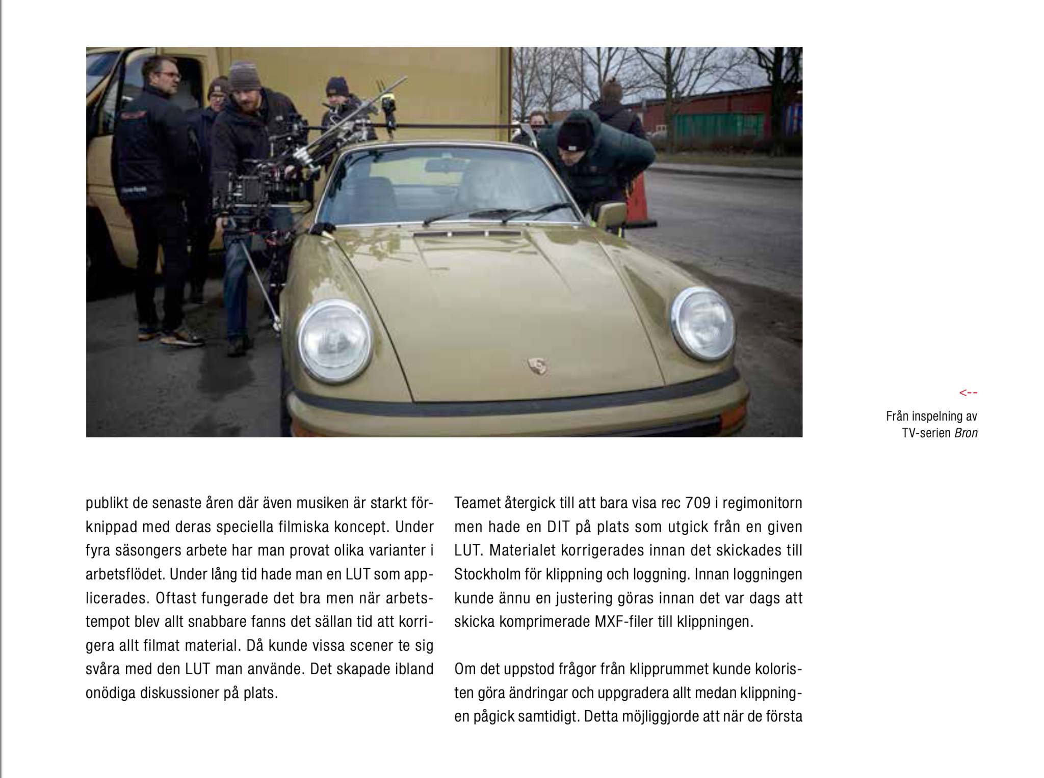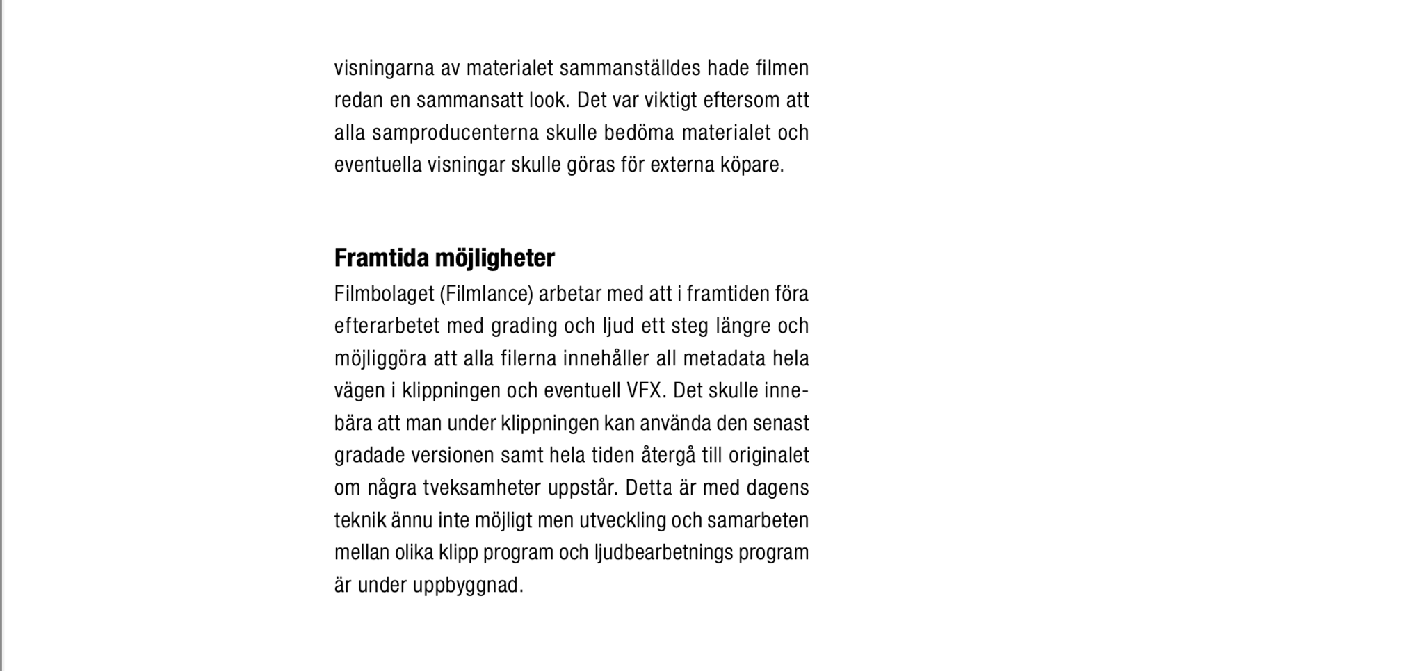 Hur påverkar färg, ljus och form våra sinnen? Varför är det ständigt så intressant och lockande med den oväntade bilden – med brottet av normaliteten? Detta konstnärliga utvecklingsprojekt är sprunget ur mina erfarenheter som praktiserande filmfotograf och den del av processen som handlar om ”grading” (färdigställandet av färgsättningen). Ibland uppstår en frustration av att ett arbete inte får det utrymme som krävs för att uppnå ett bra resultat. Processen att skapa en långfilm /TV-serie är relativt lång och inte sällan kan det ta upp till ett och halvt år från en idé till en färdig film. Besluten om den slutgiltiga ”looken” (det visuella uttrycket) på filmen görs ofta i all hast när klippning och ljudläggning är klar. Producenten behöver snabbt ha klart en färdig kopia (eller DCP/Digital Cinema Package) till den utsatta deadlinen för distribution, säljmaterial eller en festival. Det är ofta då man som fotograf upptäcker de små misstagen som har gjorts i val av tagningar under klippningen. Det kan handla om små störande rörelser i ett klipp, statister som ser in i kameran, skuggor och ljusförändringar, klaffmisstag och misstag i mask och kostym. Detta har inte uppmärksammats i klipprummets ogradade, lilla monitorbild därför att misstagen inte är synliga förrän graden är gjord. En annan komplexitet är när regissör och klippare inte har sett eller vågat använda det bildberättande som finns i materialet därför att de inte har upplevt bildens hela potential. Det kan bero på att att de har arbetat med blaskiga, ogradade och lågupplösta klippversioner av exempelvis mörka scener eller stora bilder. I dessa versioner är de svåra att läsa av och sammantaget kan det resultera i att man inte ser potentialen för gestaltande scenerier eller större bilder. Det leder i sin tur till fler konventionella val än vad ett utforskande filmiskt val kan uttrycka och berätta. Mot bakgrund av detta har jag formulerat fyra frågor att undersöka i mitt projekt: 1. Vilka visuella målsättningar definieras i början av en produktion? 2. Hur kan alla i en produktion bli delaktiga de visuella riktlinjerna? 3. Hur kommunicerar vi den visuella strukturen under den skapande processen? 4. Kan det finnas ett samförstånd om vilket visuellt uttryck som är att föredra? Projektet har fått titeln Hur formen påverkar oss. Jag har i projektet klippt ihop en fristående två minuters sekvens ur långfilmen Sophelikoptern, i vilken jag var filmfotograf. Sekvensen är inte en hel berättelse utan vald för sitt konstnärliga uttryck. Den har därefter färgkorrigerats i fem varianter av olika kolorister. Mitt syfte har varit att se hur de skilda uttrycken i koloreringen kan upplevas. Forskningsfrågorna har varit min utgångspunkt i det praktiska arbetet med färgkorrigeringen av bilderna. Det har resulterat i fem olika lookar med unika visuella uttryck, skapade av koloristerna i samarbete med mig. Jag har presenterat resultaten dels i min undervisning på Stockholms Dramatiska Högskola (StDH), dels vid filmfestivalen i Nordkap och dels på föreläsningar för Föreningen för Svenska Filmfotografer (fsf). I samband med mina presentationer framställde jag en enkät riktad till yrkesverksamma filmfotografer. Frågorna handlade om vilka erfarenheter de hade av att arbeta med färgkollorering. Enkätens syfte var att få en så tydlig översikt som möjligt av hur arbetssituationen med färgkorrigering ser ut för svensk TV och film idag. Min analys av enkätsvaren och resultaten av projektet i sin helhet har jag sammanställt i ett utbildningsmaterial. I materialet fokuserar jag på hur färger kan upplevas och om de skillnader i upplevelser som kan uppstå i olika kulturella kontexter. Jag skriver om hur vissa visuella uttryck kan bli förborgade i en generation eller i olika sociala grupper. Bild- och färgspråk kan variera såväl mellan grupper som mellan generationer. Dessa olika språk förändras fortare än vad vi är medvetna om genom det dagliga rika flödet av bildberättande. Jag lyfter också frågor om vad habituering gör med vårt berättande vilket handlar om hur snabbt vi vänjer oss vid en ett speciellt visuellt uttryck? Det kan ofta räcka med ett par minuter för oss som åskådare att vänja oss vid en viss stil av filmiskt berättande. Det leder till frågan om vilken påverkan färger har på det filmiska berättandet? Och hur vi kan använda kunskapen om detta för att rytmisera ett berättande? I mitt resonemang om färger hänvisar jag bland annat till boken Goethe färglära 1 och Newtons första experiment 2 med prismat. I Pehr Sällströms Goethes färglära (2014) finns ett tankeväckande citat av konstnären Vasilij Kandinsky: ”Vi måste lyssna till den klang som färgen väcker i vår själ. Och vi måste göra detta öppet, så hängiven, så osjälviskt, att vi med övertygelse kan konstatera, att det är färgen som talar till oss, att vi fått erfara något av dess väsen.”P E R S Ä L L S T R Ö M , G O E T H E S F Ä R G L Ä R A , 2 0 1 4
