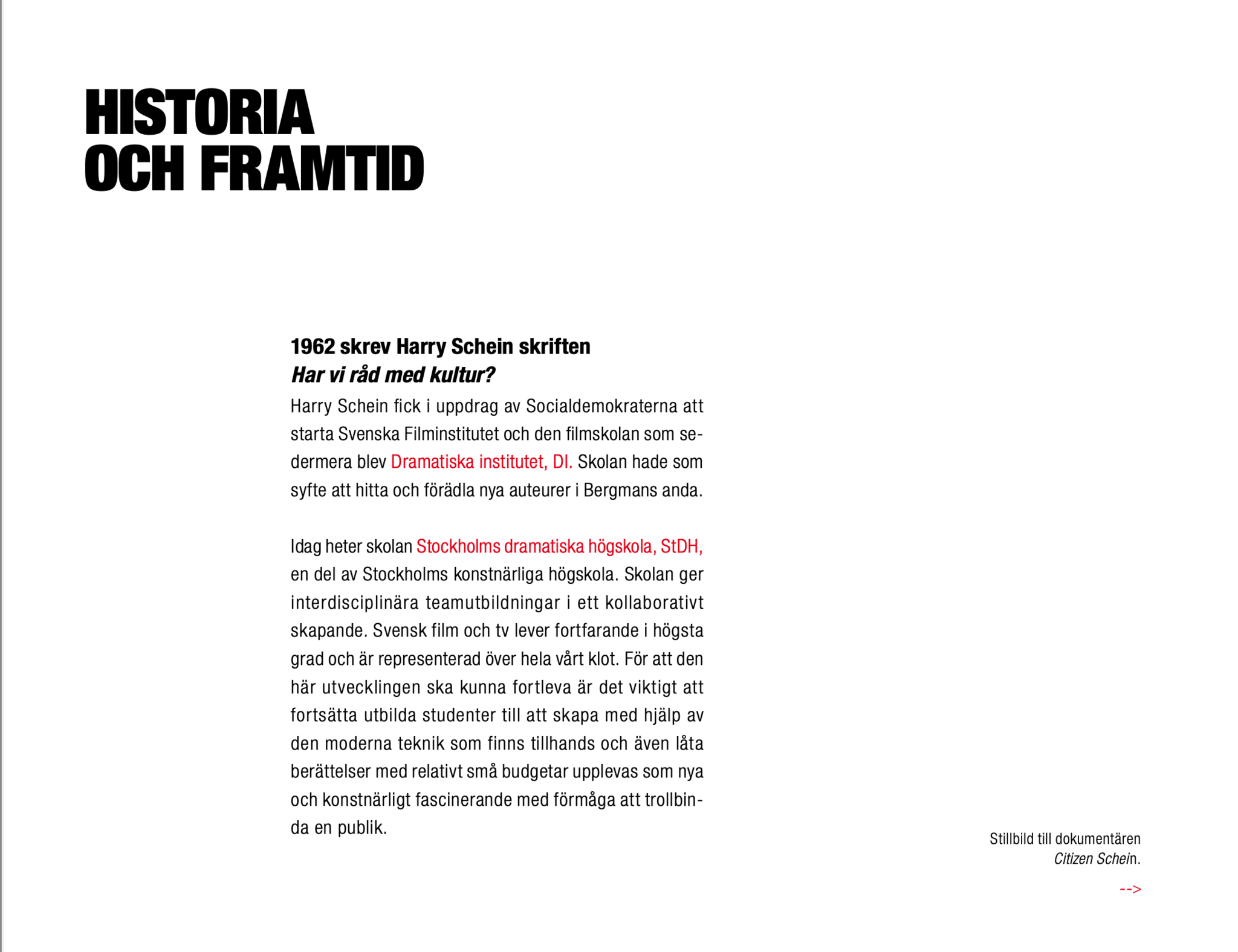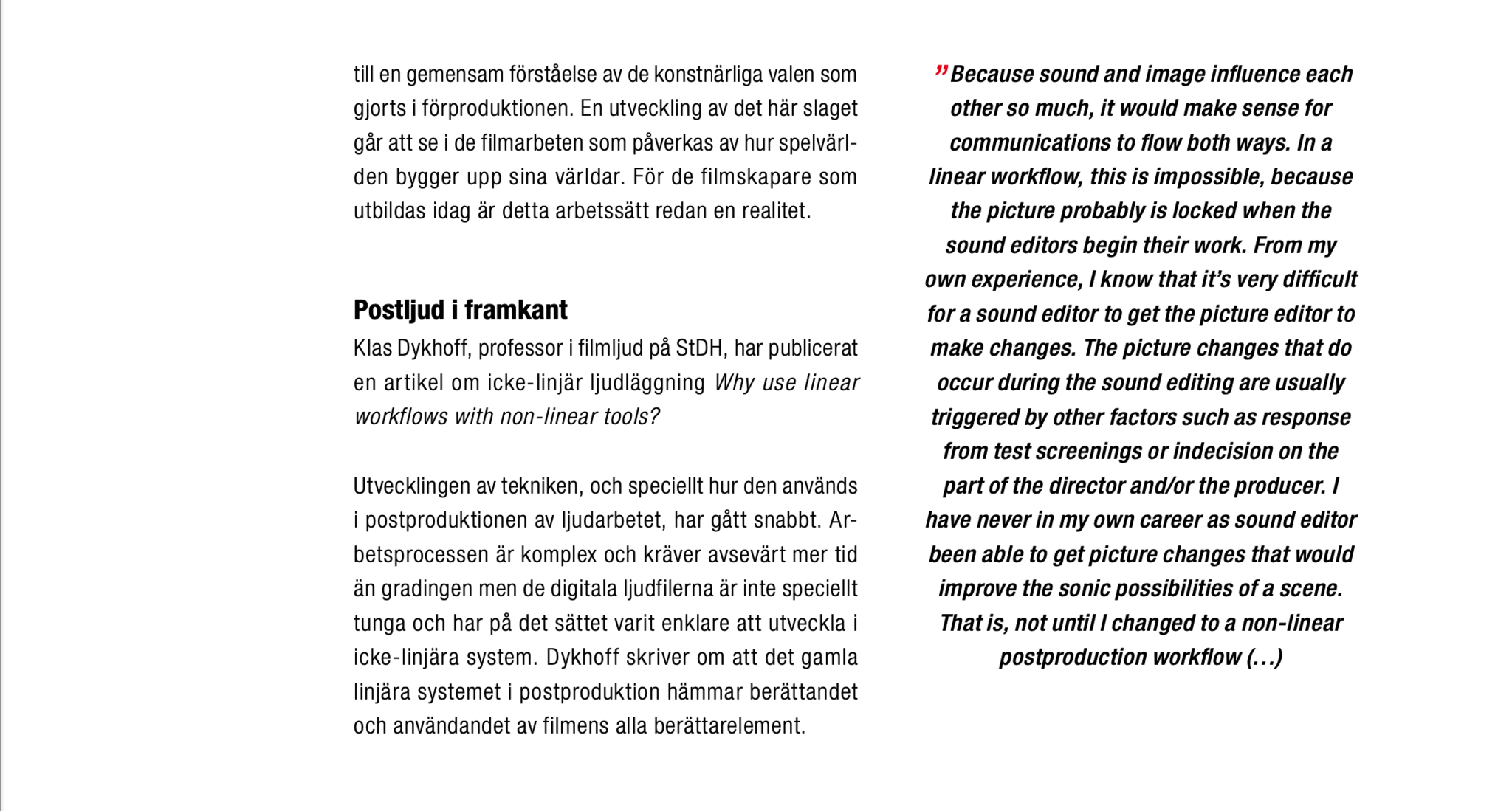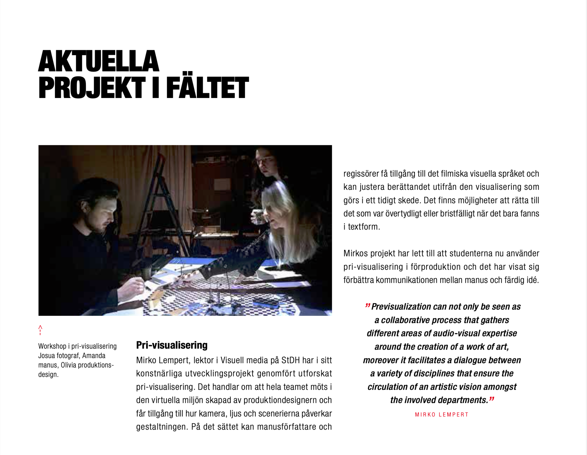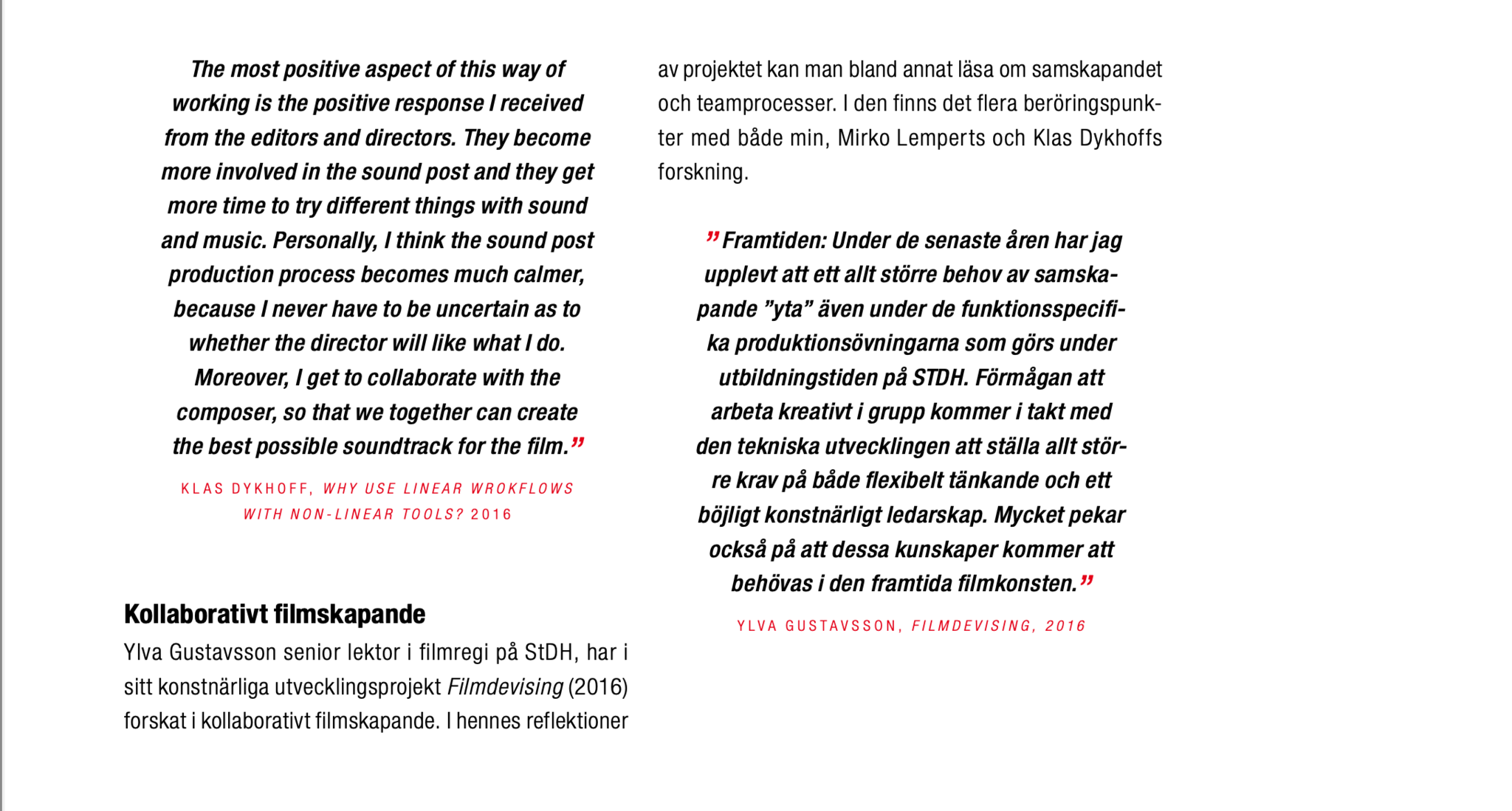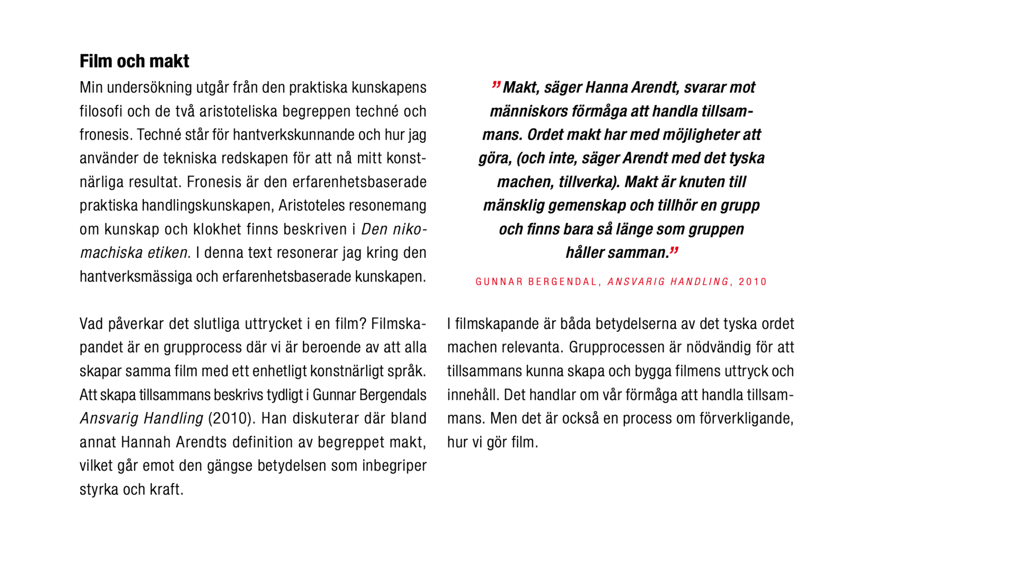 Hur påverkar färg, ljus och form våra sinnen? Varför är det ständigt så intressant och lockande med den oväntade bilden – med brottet av normaliteten? Detta konstnärliga utvecklingsprojekt är sprunget ur mina erfarenheter som praktiserande filmfotograf och den del av processen som handlar om ”grading” (färdigställandet av färgsättningen). Ibland uppstår en frustration av att ett arbete inte får det utrymme som krävs för att uppnå ett bra resultat. Processen att skapa en långfilm /TV-serie är relativt lång och inte sällan kan det ta upp till ett och halvt år från en idé till en färdig film. Besluten om den slutgiltiga ”looken” (det visuella uttrycket) på filmen görs ofta i all hast när klippning och ljudläggning är klar. Producenten behöver snabbt ha klart en färdig kopia (eller DCP/Digital Cinema Package) till den utsatta deadlinen för distribution, säljmaterial eller en festival. Det är ofta då man som fotograf upptäcker de små misstagen som har gjorts i val av tagningar under klippningen. Det kan handla om små störande rörelser i ett klipp, statister som ser in i kameran, skuggor och ljusförändringar, klaffmisstag och misstag i mask och kostym. Detta har inte uppmärksammats i klipprummets ogradade, lilla monitorbild därför att misstagen inte är synliga förrän graden är gjord. En annan komplexitet är när regissör och klippare inte har sett eller vågat använda det bildberättande som finns i materialet därför att de inte har upplevt bildens hela potential. Det kan bero på att att de har arbetat med blaskiga, ogradade och lågupplösta klippversioner av exempelvis mörka scener eller stora bilder. I dessa versioner är de svåra att läsa av och sammantaget kan det resultera i att man inte ser potentialen för gestaltande scenerier eller större bilder. Det leder i sin tur till fler konventionella val än vad ett utforskande filmiskt val kan uttrycka och berätta. Mot bakgrund av detta har jag formulerat fyra frågor att undersöka i mitt projekt: 1. Vilka visuella målsättningar definieras i början av en produktion? 2. Hur kan alla i en produktion bli delaktiga de visuella riktlinjerna? 3. Hur kommunicerar vi den visuella strukturen under den skapande processen? 4. Kan det finnas ett samförstånd om vilket visuellt uttryck som är att föredra? Projektet har fått titeln Hur formen påverkar oss. Jag har i projektet klippt ihop en fristående två minuters sekvens ur långfilmen Sophelikoptern, i vilken jag var filmfotograf. Sekvensen är inte en hel berättelse utan vald för sitt konstnärliga uttryck. Den har därefter färgkorrigerats i fem varianter av olika kolorister. Mitt syfte har varit att se hur de skilda uttrycken i koloreringen kan upplevas. Forskningsfrågorna har varit min utgångspunkt i det praktiska arbetet med färgkorrigeringen av bilderna. Det har resulterat i fem olika lookar med unika visuella uttryck, skapade av koloristerna i samarbete med mig. Jag har presenterat resultaten dels i min undervisning på Stockholms Dramatiska Högskola (StDH), dels vid filmfestivalen i Nordkap och dels på föreläsningar för Föreningen för Svenska Filmfotografer (fsf). I samband med mina presentationer framställde jag en enkät riktad till yrkesverksamma filmfotografer. Frågorna handlade om vilka erfarenheter de hade av att arbeta med färgkollorering. Enkätens syfte var att få en så tydlig översikt som möjligt av hur arbetssituationen med färgkorrigering ser ut för svensk TV och film idag. Min analys av enkätsvaren och resultaten av projektet i sin helhet har jag sammanställt i ett utbildningsmaterial. I materialet fokuserar jag på hur färger kan upplevas och om de skillnader i upplevelser som kan uppstå i olika kulturella kontexter. Jag skriver om hur vissa visuella uttryck kan bli förborgade i en generation eller i olika sociala grupper. Bild- och färgspråk kan variera såväl mellan grupper som mellan generationer. Dessa olika språk förändras fortare än vad vi är medvetna om genom det dagliga rika flödet av bildberättande. Jag lyfter också frågor om vad habituering gör med vårt berättande vilket handlar om hur snabbt vi vänjer oss vid en ett speciellt visuellt uttryck? Det kan ofta räcka med ett par minuter för oss som åskådare att vänja oss vid en viss stil av filmiskt berättande. Det leder till frågan om vilken påverkan färger har på det filmiska berättandet? Och hur vi kan använda kunskapen om detta för att rytmisera ett berättande? I mitt resonemang om färger hänvisar jag bland annat till boken Goethe färglära 1 och Newtons första experiment 2 med prismat. I Pehr Sällströms Goethes färglära (2014) finns ett tankeväckande citat av konstnären Vasilij Kandinsky: ”Vi måste lyssna till den klang som färgen väcker i vår själ. Och vi måste göra detta öppet, så hängiven, så osjälviskt, att vi med övertygelse kan konstatera, att det är färgen som talar till oss, att vi fått erfara något av dess väsen.”P E R S Ä L L S T R Ö M , G O E T H E S F Ä R G L Ä R A , 2 0 1 4