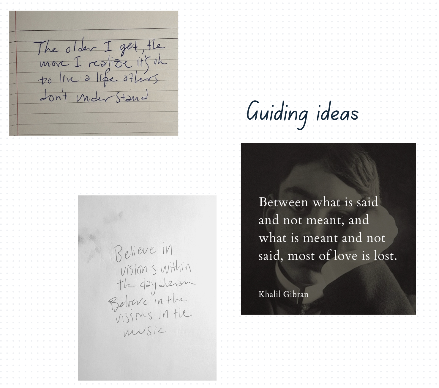 ABOVE: These are some of the guiding ideas of the short film. Since the feature is told from the perspective of a father and a daughter, the film covers the topic of longing and love.