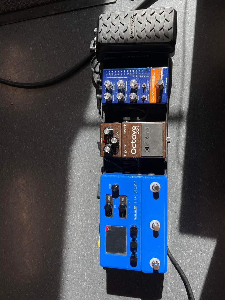 Helix Stomp is a multieffect-pedal which Noah uses to create unique sounds and variations in the soundscape of the music. All these effects have their roles in Celium. One example might be how he uses ring-modulator to create a more piercing, sharp sound that works well when we play with high intensity. Other frequently used effects are Chorus, Reverb, Distortion, Fuzz, Boost, Attack synth and Pitch Shift.