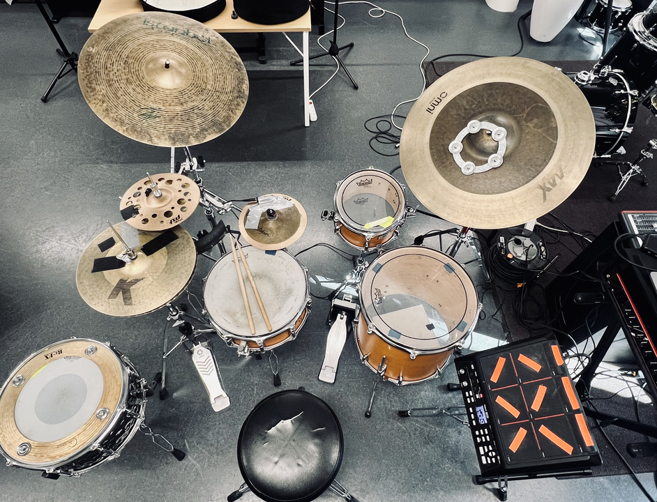 Originally this setup was more minimalistic and did only feature cymbals, one 14” snare drum and, one floor tom and triggers. I decided to expand the setup by adding additional snare drum, rack tom and the cymbal stack trigger right above my main snare drum. I borrowed this idea from Jojo Mayer who uses a stack above his snare drum to layer sounds when playing on the rim of the snare. Unlike Mayer, I use a contact microphone taped to the cymbal-stack which is connected to Ableton live and functions as a midi trigger. For that I use a Max4Live device called Trigg.me-Audio to MIDI 1.0.