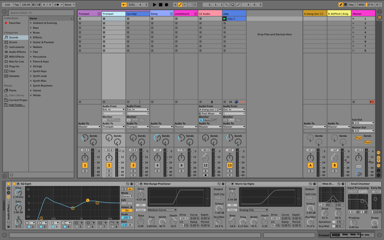 For the trumpet playing, he focuses on being the soloists, he also tries to approach his role as being a part of the soundscape. By creating repetitive patterns and sound textures, he contributes to the overall sound of the band. In the screenshot on the right, you can see Anders' ableton rig. He has multiple channels with different effects that he swaps between with his midi controller.