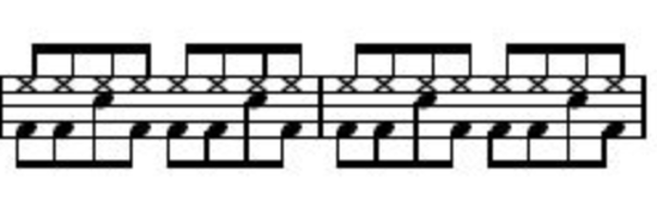 My drumming style in Celium is a combination of elements borrowed from electronic music as well as other elements from other genres that I practiced and worked on through my years as a musician. Firstly, I want to discuss the role of my drum-setup in the context of my drumming style. It is a hybrid drum setup, meaning it combines electronic and acoustic elements and sounds. As mentioned earlier, my main goal was to combine triggers and electronics with acoustic drums and maintaining my freedom around the drumkit. I wanted to have the possibility to use the techniques from the realm of acoustic drums, but also compliment these techniques with electronic sounds. From a technical perspective, the placement and use of triggers allows me to play the electronic sounds as if they were acoustic instruments. I could incorporate use of audio effects that I could modulate while playing to create even more complex sounds, however I chose to keep it simple and minimize the use of electronics to simple triggers. In the four on the floor genres, the bass drum plays a central role in the music, that’s why I chose to use a single bass drum trigger to play purely electronic bass drum sounds. This bass drum sound anchors my overall drum sound in the realm of electronic music. Another aspect of my setup that is worth mentioning is a technique I borrowed from Jojo Mayer which I described in the chapter 3.3. The cymbal-stack with a contact microphone trigger placed above my snare drum is used for a clap sound. Because of the placement of the cymbal, I can choose to either strike the cymbal/trigger itself or hit both the cymbal and the rim of my snare drum at the same time. This connects to the idea of complimenting techniques from acoustic drumming with electronic sounds.