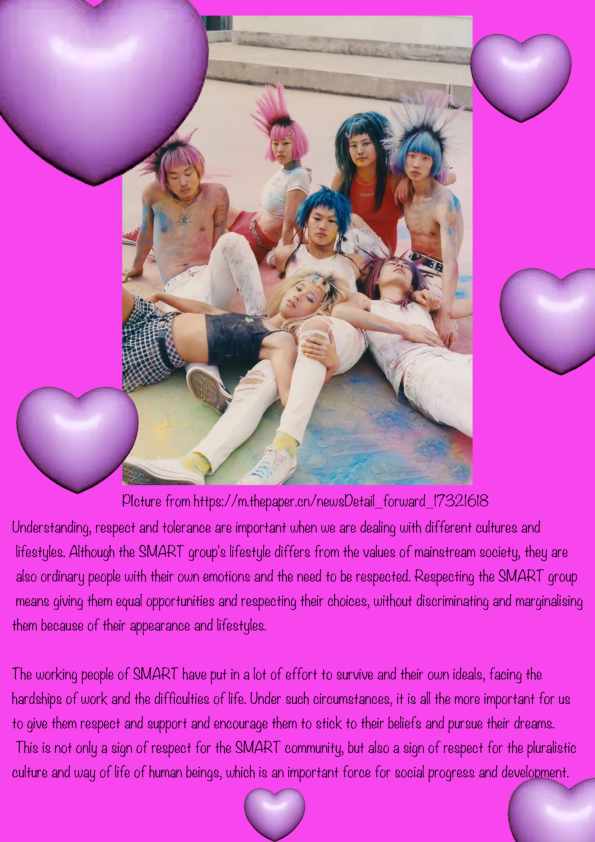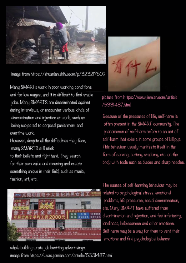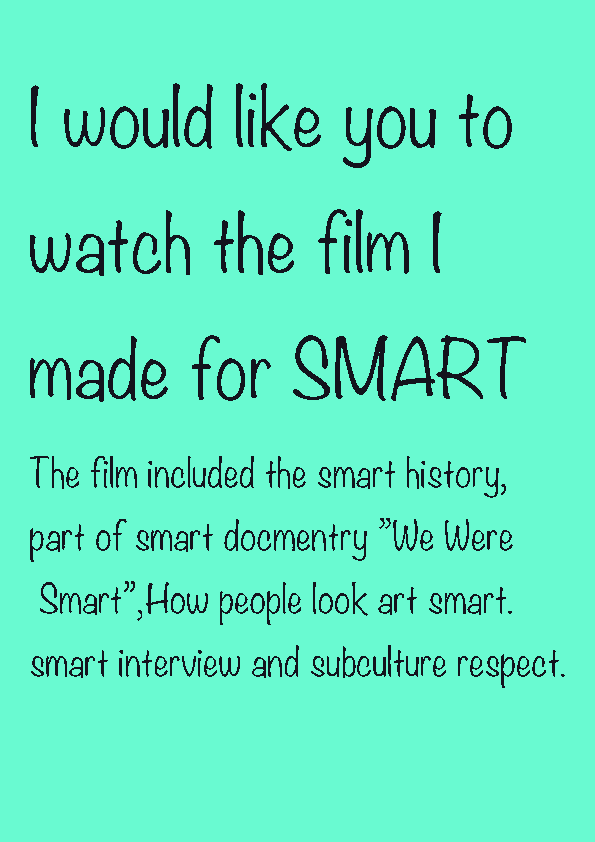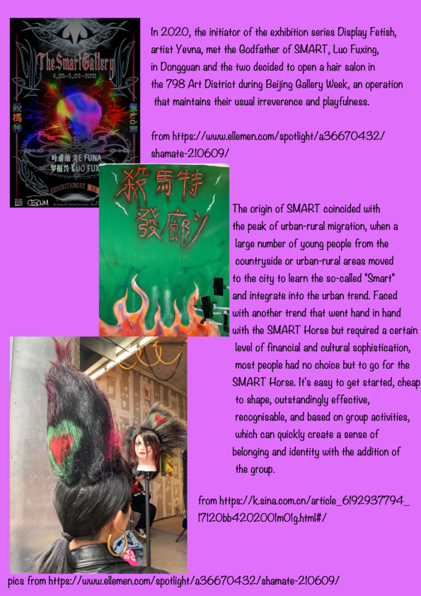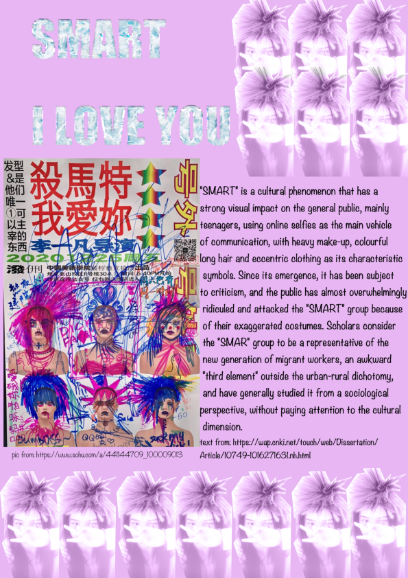 research go to Chinese subculture- "Smart", 杀马特。 The term "SMART" is derived from the Japanese term "Akamaru-zone" (あかまるちたい), which refers to a group of people who are marginalised by Japanese society. In mainland China, the term "SMART" refers to young people who like to wear distinctive clothes, heavy make-up and exaggerated haircuts. This research included the introduction of smart culture , the video recorded the Heartache back story of smart group, smart documentary fragment and smart interview. Most important thing is respect reflection on subculture and Smart!!!!