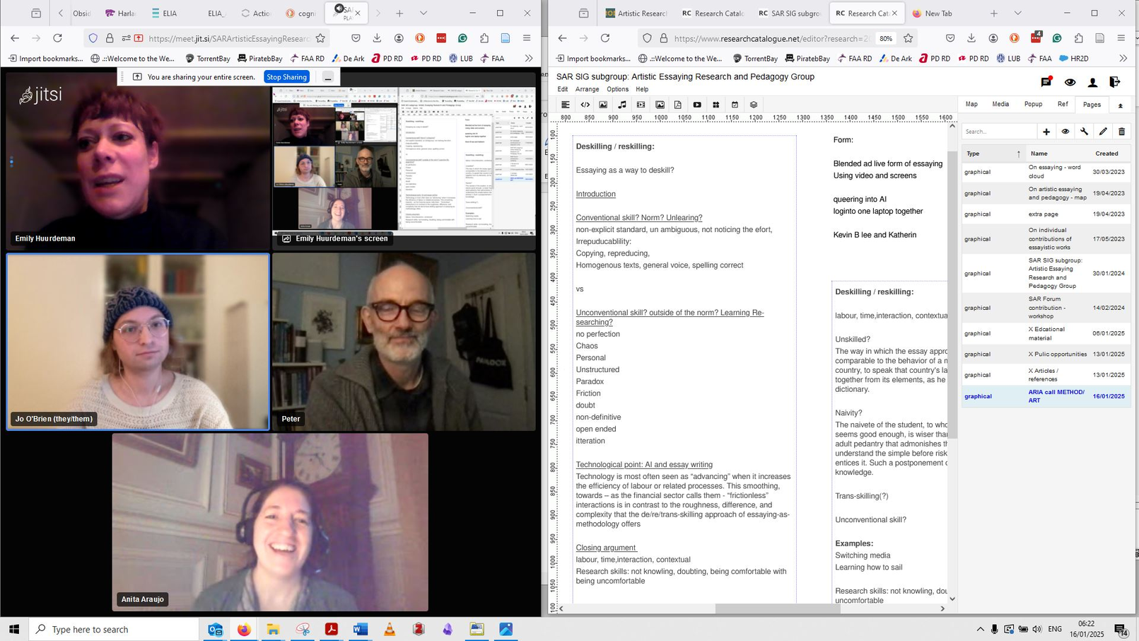 The aim of this research group is to develop an international collective of artistic researchers concerned with the potentiality of creative critical essaying, and how these hybrid and experimental forms of essaying may exist as practice-led artistic research and praxis. Then, how these praxes may inform pedagogical approaches.