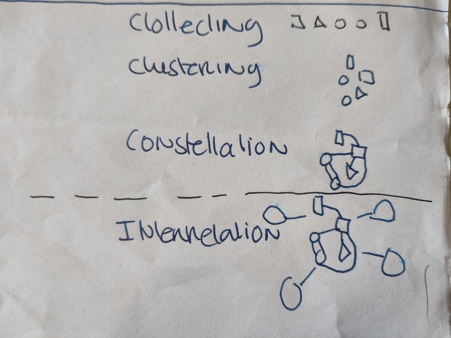 What essaying offers to me is a way to explore the relationships between points, rather than the points themselves; it’s about parsing relationships and in-betweens. A strategy that I use to amplify this potential begins by looking like a somewhat standard “mind map” or “thought web”. The various “points” are put in relation to one another, often through lines, fields, or varied proximities. Rather than beginning to work from this map though, I instead further develop the map by writing a sentence or two about the relationship between each set of points. The aim for me is not to force a particular connection between the two points that will align with a presupposed outcome, but to see what connections arise from the relational tension.