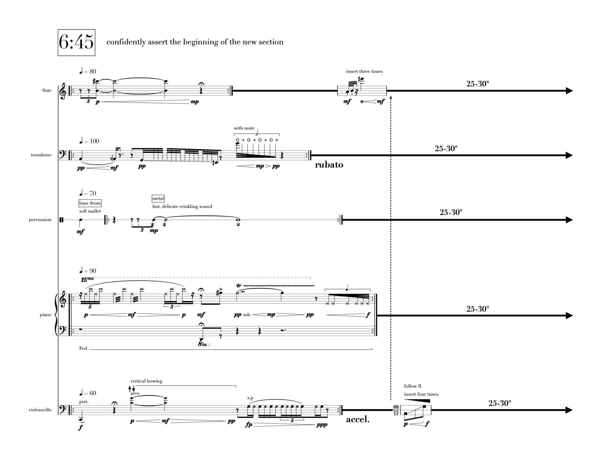 There are two ways in which ensemble material is written in the piece, which can be described — in referring back to Tsunoda’s notion of depiction — as “watching” sections and “portraying” sections. The element of “watching” comes from our relationship as listeners to the recording itself; it is laid out in its entirety, allowing us to literally just sit and experience it as it passes by. During these sections, the ensemble interacts with the material individually and at their own discretion; each player plays these sections from individual parts which contain no reference to the other players, only a selection of notation and timestamps specifying when to play. There is no score for these sections, just possibilities for the players to explore the sonic space and ‘watch’ as the field recording passes by, inviting the audience to do the same.