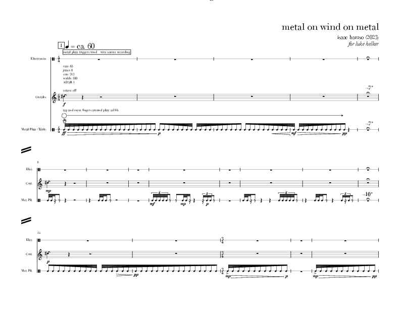 Written for American percussionist Luke Helker, metal on wind on metal follows techniques explored in Untitled.exe in the interaction between performance and live manipulation of sound. In this case, field recordings of found metal objects (taken in The Hague) are in turn manipulated live by a player interacting with different metal objects, including found “junk metal,” saw blades, and vibraphone. This piece will receive its premiere in late April 2023 in Lawrence, Kansas, followed by a repeat performance at the New Music Gathering in Portland, Oregon, in late June.