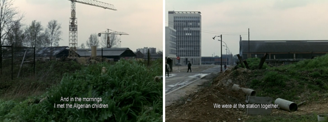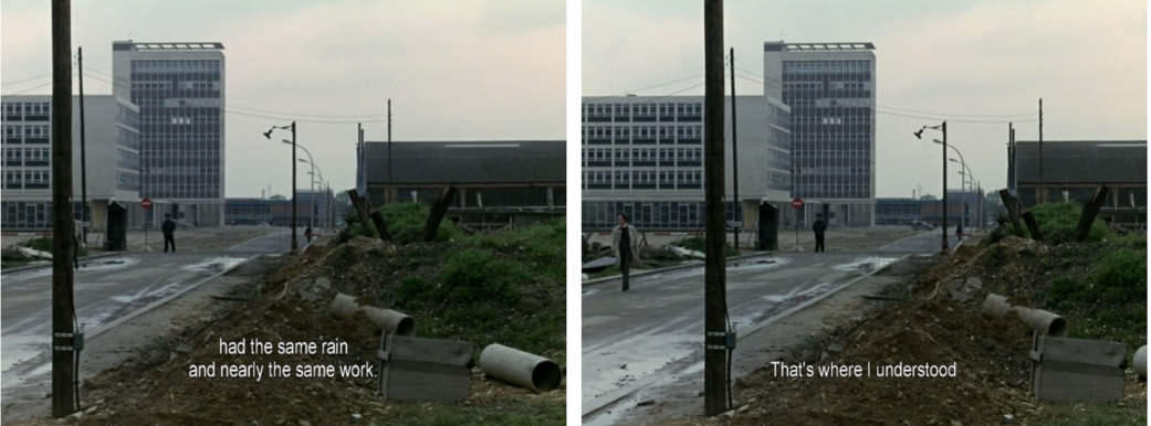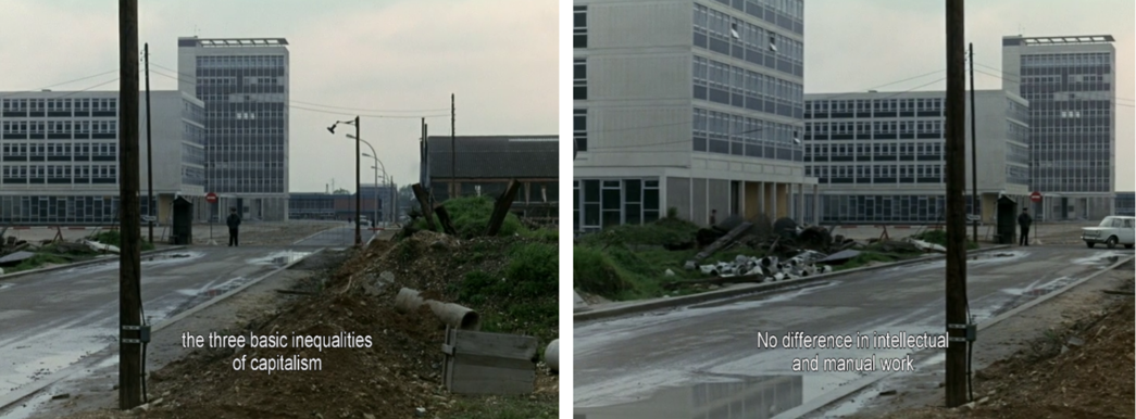 And in the mornings, I met the Algerian children. We were at the station together, we had the same rain and nearly the same work. That's where I understood the three basic inequalities of capitalism. No difference in intellectual and manual work, between town and country. Third, between farming and industry. Panning stils from La Chinoise, 1967, Jean-Luc Godard