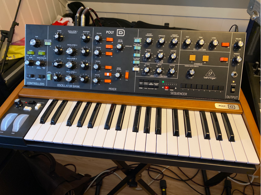 Lydbildet består ellers av frekvensrike synthesizere, så dette ble et problem i forsøket på å oppnå ønsket tydelighet i melodien. Dessuten er det ikke mulig å spille de tiltenkte glissandoene på en standard elgitar på grunn av båndene på instrumentet. Jeg trengte et instrument med skarpe toppfrekvenser som også innebefattet evnen til å spille en jevn glissando. Dette er alle egenskaper som de fleste synthesizere innebefatter, derfor tok jeg utgangspunkt i at melodien skulle spilles på Behringer Poly D.