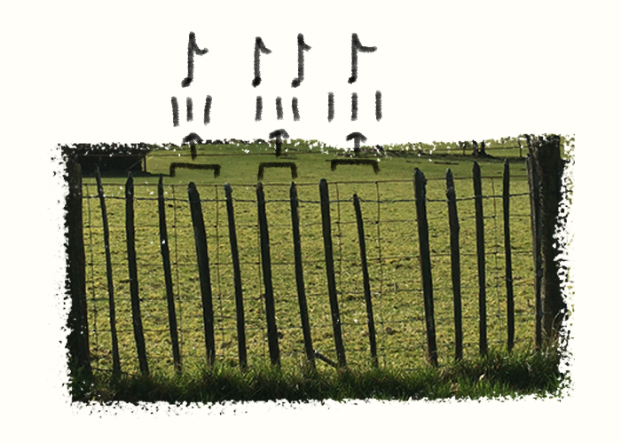 Building on the initial concept behind Plant Rhythms, 4 bar fence loop explores the idea of translating visual rhythms found in video footage, into musical rhythms. The source material for the piece was a series of static videos of a wire fence with wooden slats tied to it. The slats are attached in different patterns on top of a wire grid creating a visual effect similar to that of a piano roll; a common means of displaying musical notes in digital audio workstations. Inspired by the similarity, I devised a process to transcribe the patterns into a rhythm which could be displayed visually as a GIF. The diagram below shows how each segment of the fence was broken up into three sections (frames) and the rhythmic values then extracted from the position of the slats.
