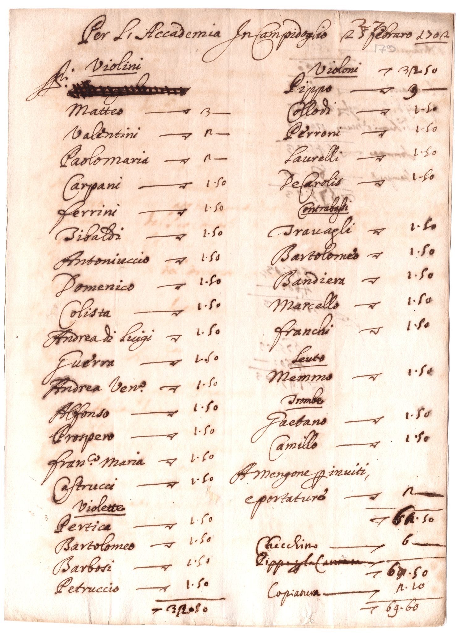 Amongst European cities, only Paris could perhaps match Rome in regard to the liveliness of its cultural life: wealthy noble families, diplomatic representatives, cardinals aiming to establish themselves as possible candidates for the papacy, even a few exiled queens such as Cristina of Sweden and Maria Casimira of Poland – all considered that the best way to acquire prestige in town was by means of giving patronage to artistic activities and, among them, music was definitely regarded as a favourite art. As a result, they were promoting small and large gatherings – sometimes private, sometimes open to the whole town – in which the music was always present and, alongside with the rinfreschi (generous offer of food and drinks), it was often the centre of the event.