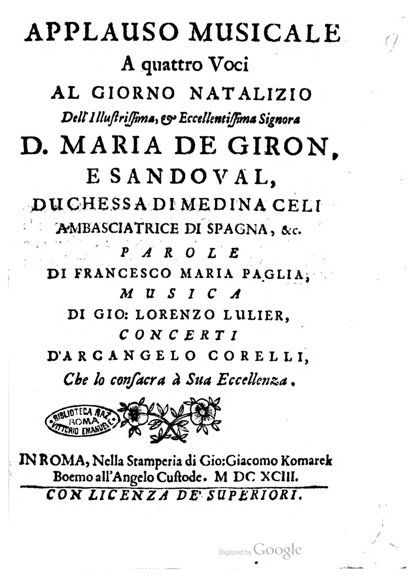 If the key role of Corelli as a player and leader in the numerous Roman musical events and in their Sinfonie is beyond any doubt, references to him as a composer of them are more rare. As seen above, the instrumental music was considered more like an adornment of the vocal compositions hence, for instance, the title pages of the librettos often mention the composer of the Musica , very seldom the one of the Sinfonie . However, apart from the quotes by Crescimbeni and Berardi given above, 24 there are other specific instances in which Corelli is clearly mentioned as the composer of the instrumental music. For instance, in a document from the S. Agnese in Agone's archive we read: “Per regalo al Sig.r Arcang[el]o che portò le Composizioni” which means: “as a gift to Sir Arcangelo, who brought the compositions”. 25 Similarly, in the Avvisi Marescotti – a collection of chronicles of Roman events – a note of April 1689 mentions the performance of an oratorio whose Musica was composed by Bernardo Pasquini while the Sinfonie were “of the Bolognese .” 26 In other occasions, the fee paid to Corelli for a specific event exceeds by far the average payment he was usually earning, 27 and this might be a sign that his role was not only to play, but to compose as well. A cross check of the documents seems also to suggest that when Corelli was performing, the vocal works tended to include more Sinfonie than in average. 28 Overall, we have enough information to make us certain that Corelli was indeed composing Sinfonie and that these pieces were highly praised by Roman audience. Sadly, with one remarkable exception, all this music is apparently lost. 29 Lost is also the complete score of a large cantata of 1693, Applauso Musicale, which would have been particularly interesting in the perspective of this study as its survived libretto contains explicit evidence of a Sinfonia with trumpets composed by Corelli himself. Indeed, the libretto's title page reads: “Musica di Gio: Lorenzo Lulier, Concerti D'Arcangelo Corelli” while later on, in the libretto, one can find the mention of a: Sinfonia strepitosa con quattro trombe , literally “loud music with four trumpets”, which must have been an original composition by Corelli with a rare instrumentation including a particularly large brass section. 30