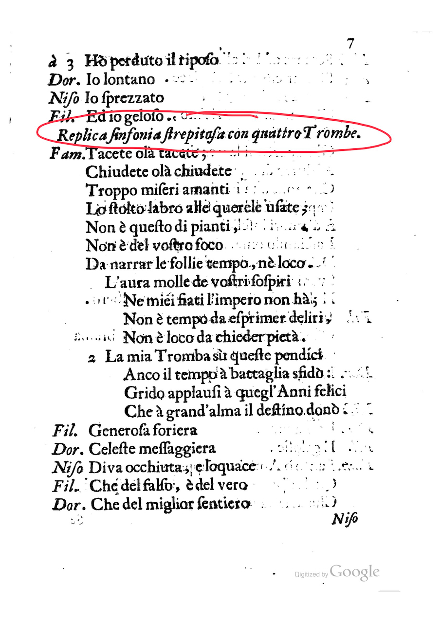 If the key role of Corelli as a player and leader in the numerous Roman musical events and in their Sinfonie is beyond any doubt, references to him as a composer of them are more rare. As seen above, the instrumental music was considered more like an adornment of the vocal compositions hence, for instance, the title pages of the librettos often mention the composer of the Musica , very seldom the one of the Sinfonie . However, apart from the quotes by Crescimbeni and Berardi given above, 24 there are other specific instances in which Corelli is clearly mentioned as the composer of the instrumental music. For instance, in a document from the S. Agnese in Agone's archive we read: “Per regalo al Sig.r Arcang[el]o che portò le Composizioni” which means: “as a gift to Sir Arcangelo, who brought the compositions”. 25 Similarly, in the Avvisi Marescotti – a collection of chronicles of Roman events – a note of April 1689 mentions the performance of an oratorio whose Musica was composed by Bernardo Pasquini while the Sinfonie were “of the Bolognese .” 26 In other occasions, the fee paid to Corelli for a specific event exceeds by far the average payment he was usually earning, 27 and this might be a sign that his role was not only to play, but to compose as well. A cross check of the documents seems also to suggest that when Corelli was performing, the vocal works tended to include more Sinfonie than in average. 28 Overall, we have enough information to make us certain that Corelli was indeed composing Sinfonie and that these pieces were highly praised by Roman audience. Sadly, with one remarkable exception, all this music is apparently lost. 29 Lost is also the complete score of a large cantata of 1693, Applauso Musicale, which would have been particularly interesting in the perspective of this study as its survived libretto contains explicit evidence of a Sinfonia with trumpets composed by Corelli himself. Indeed, the libretto's title page reads: “Musica di Gio: Lorenzo Lulier, Concerti D'Arcangelo Corelli” while later on, in the libretto, one can find the mention of a: Sinfonia strepitosa con quattro trombe , literally “loud music with four trumpets”, which must have been an original composition by Corelli with a rare instrumentation including a particularly large brass section. 30