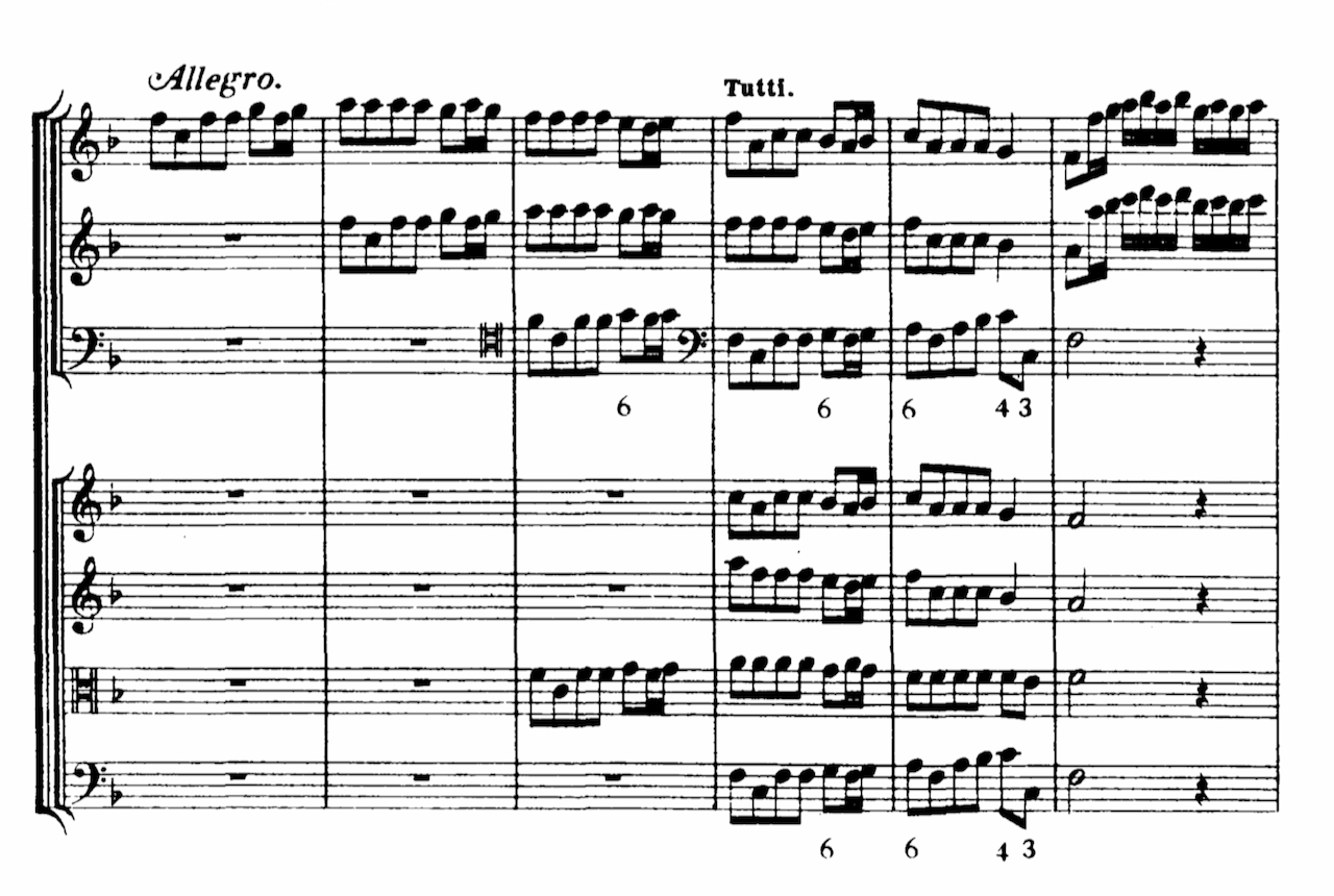 The fact that Corelli's Concertos Opus 6 are, at least to some extent, the result of a reworking of previously composed works, is accepted as a fact amongst scholars. Already Mario Rinaldi and many others after him, have expressed the same opinion. 38 Franco Piperno, in particular, has pointed to a number of evidences speaking in favour of such a genesis. For instance, the evident derivation of the third movement of Concerto n. 6 from the second movement of the Sinfonia of the Beatrice d'Este, or the existence of a single page autograph containing a movement which was later included, in a different tonality, in Concerto n. 10. 39 There is also a primary source suggesting that Corelli’s Sinfonie clustered eventually in his Opus 6: it is the statement by Giovanni Crescimbeni that “the beauty of Corelli's countless Sinfonie can be observed in his printed work”, by which we are to understand that it is his Opus 6 (Crescimbeni 1720, 251). 40 As a consequence of all the above, one could then argue that, in Opus 6, it would be possible to track some traces of the lost Sinfonie . With this in mind, an article about Corelli and Torelli by Förster is intriguing. 41 Förster's analysis shows a striking resemblance between the trumpets' parts of a Torelli Sinfonia and the violin concertino's parts of the Allegro starting at bar 61 of Concerto Opus 6 n. 2.
