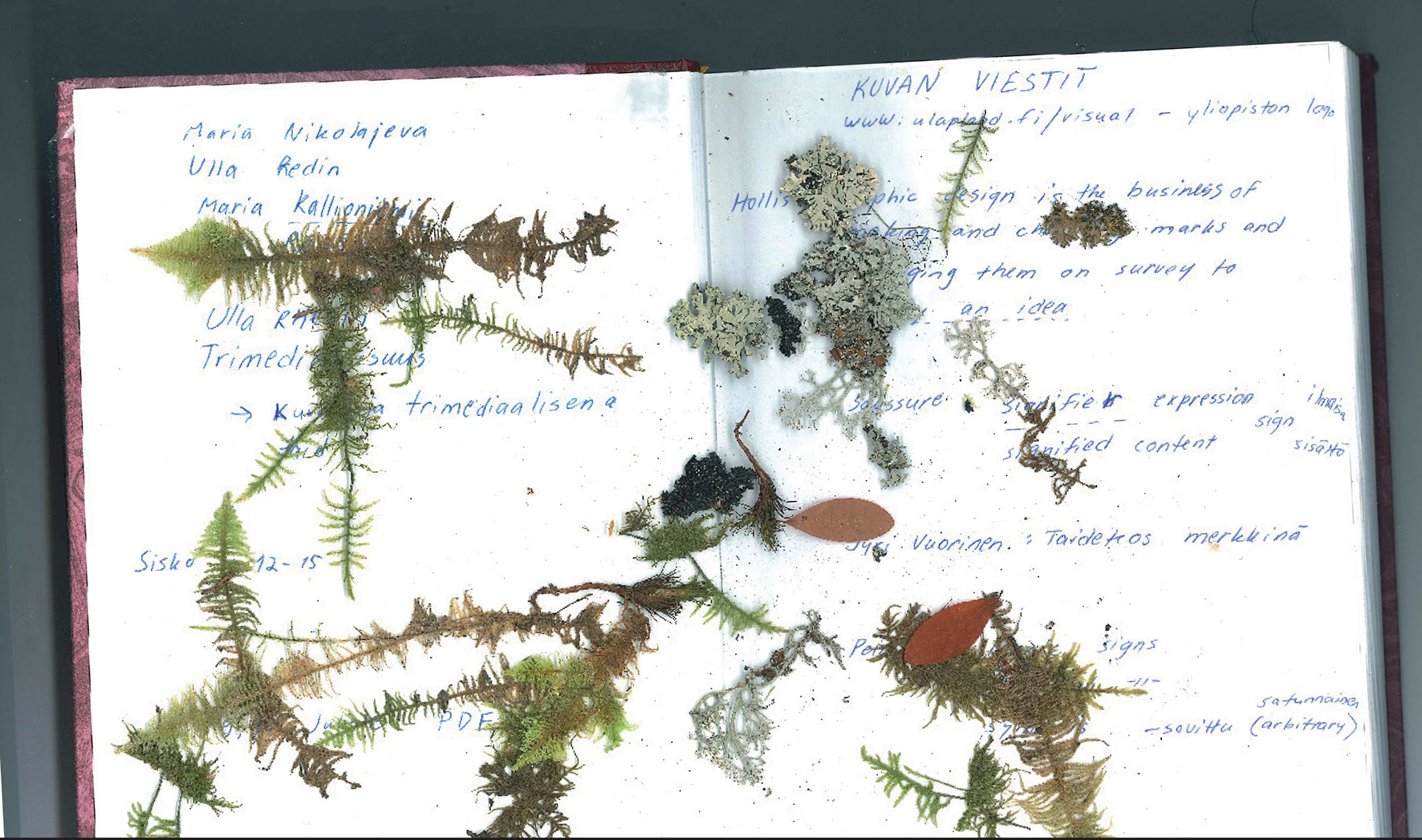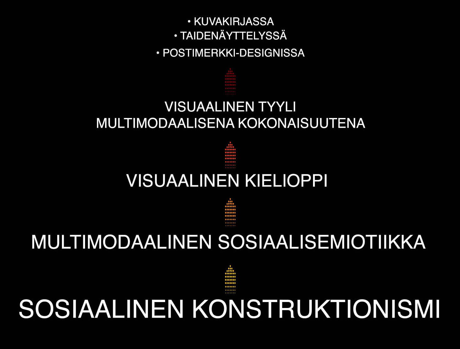 Graafisena suunnittelijana ja alan tutkijana minua kiinnostaa multimodaalisen sosiaalisemiotiikan teoria, joka – pohjatessaan sosiaalisen konstruktionismin tiedonkäsitykseen – näkee visuaaliset merkitykset ja tulkinnat sosiaalisesti muodostuvina. Gunther Kressin ja Theo van Leeuwenin 1990-luvulla kehittelemä visuaalisen kieliopin teoria soveltaa kielitieteen periaatteita myös visuaalisten esitysten tulkintaan. Kuville tai kuvaa ja tekstiä yhdistäville kommunikaation muodoille etsitään kielioppia, kulttuurissa vakiintuneita esittämisen ja tulkinnan tapoja. Graafisen suunnittelijan työvälineitä mielikuvien ja merkitysten luomisessa ovat moodit: semioottiset resurssit kuten väri, typografia, kompositio tai layout sekä erilaiset materiaalit ja teknologiat kuten paperi tai näyttö ja mediat kuten kirja tai postimerkki. Kuva itsessään hyödyntää monia näistä resursseista, ja painotuotteessa – kuten kirjassa, postimerkissä tai taidenäyttelyn lasisessa kastepisarassa – eri elementit sulautuvat ja luovat kokonaisvaikutelman yhdessä. Graafisen tuotteen visuaalinen tyyli syntyy siis eri elementtien yhteisvaikutuksena ja toimii multimodaalisena semioottisena resurssina. Tyylin avulla luodaan kokonaistunnelmaa ja mielikuvia.