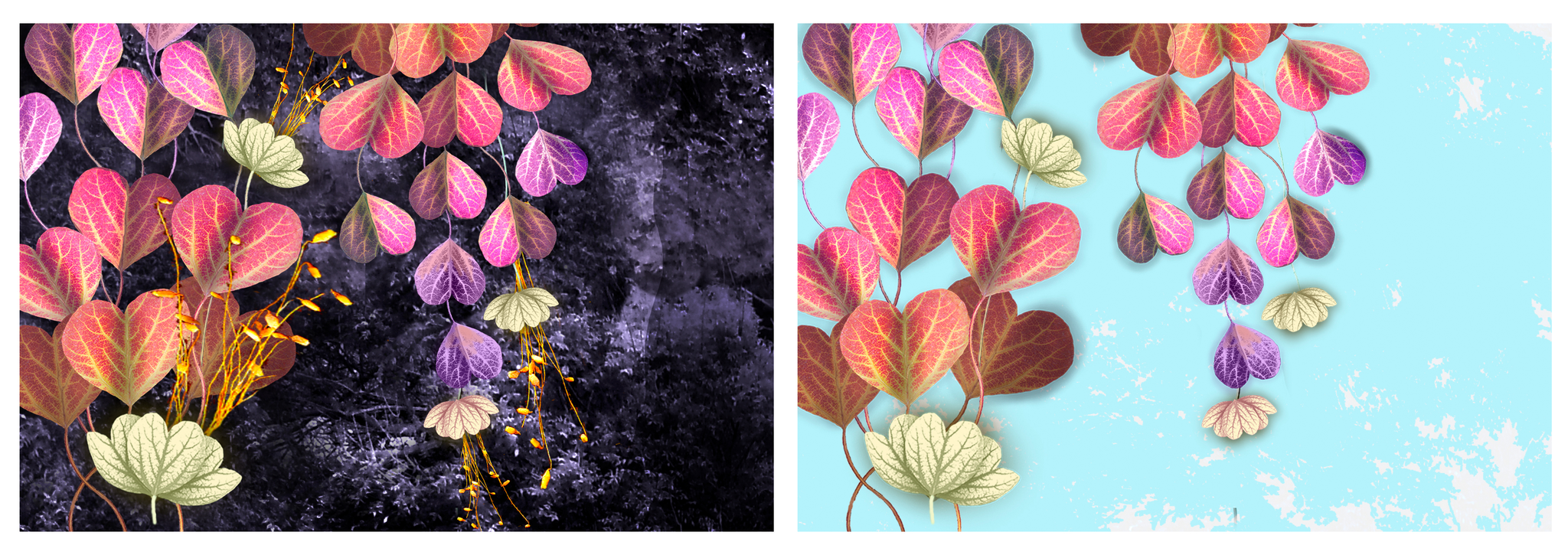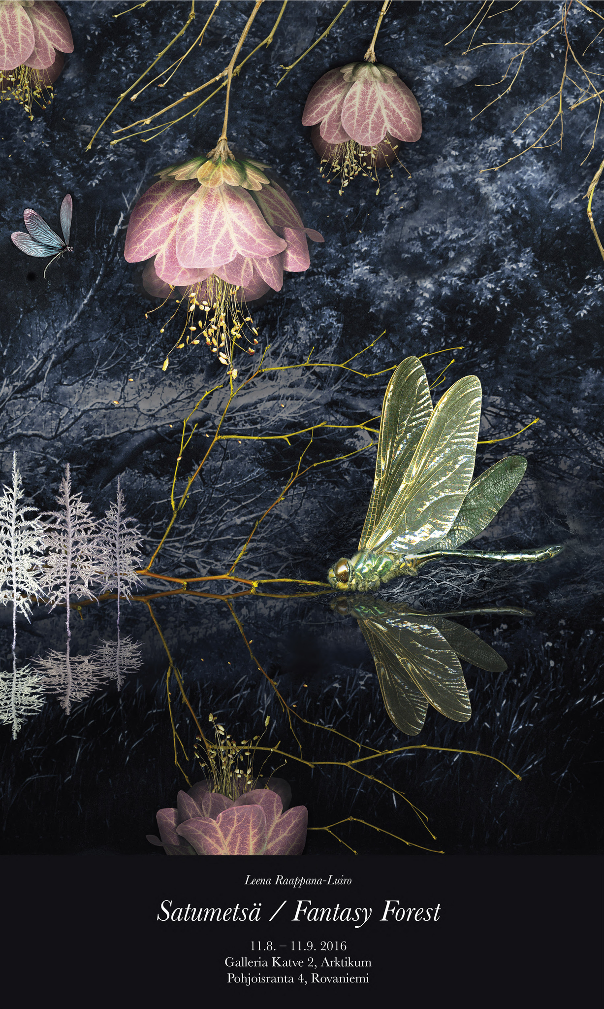 Teorian kielellä ilmaistuna tein taidenäyttelyssä kokeiluja lapsuuden luontokokemukseni ilmaisemiseksi eri semioottisten resurssien kuten lasin materiaalin kautta. Kuvittajana aloin pian pohtia, kuinka jatkaisin samaa tunnelmaa kaksiulotteisessa kuvassa. Jatkoin kokeiluja skannaamalla luonnonelementtejä. Olin huomannut, että skannerille tyypillinen valo ja voimakas terävyys tuottivat kuvia, jotka olivat hyperrealistisuudessaan epätodellisen tuntuisia. Vein skannattuja elementtejä Photoshopiin ja käsittelin niitä miltei kaikilla ohjelman työkaluilla. Kokosin eri skannauksista kollaaseja: Rakensin haavan lehdistä mielikuvituksellisia kukkia, joiden heteinä oli karhunsammalen kukintoja. Jättimäinen sudenkorento lepää lähteen äärellä. Mustaan veteen kuvastuu sammalista muodostuneita huurteisia kuusia. Yksityiskohtaisen realistisen pinnan alla kuva on satukuva, enemmän kuin totta. Realistiset luonnonelementit muuttuivat fantasiaksi tyylissä, jota nimitän maagiseksi realismiksi.