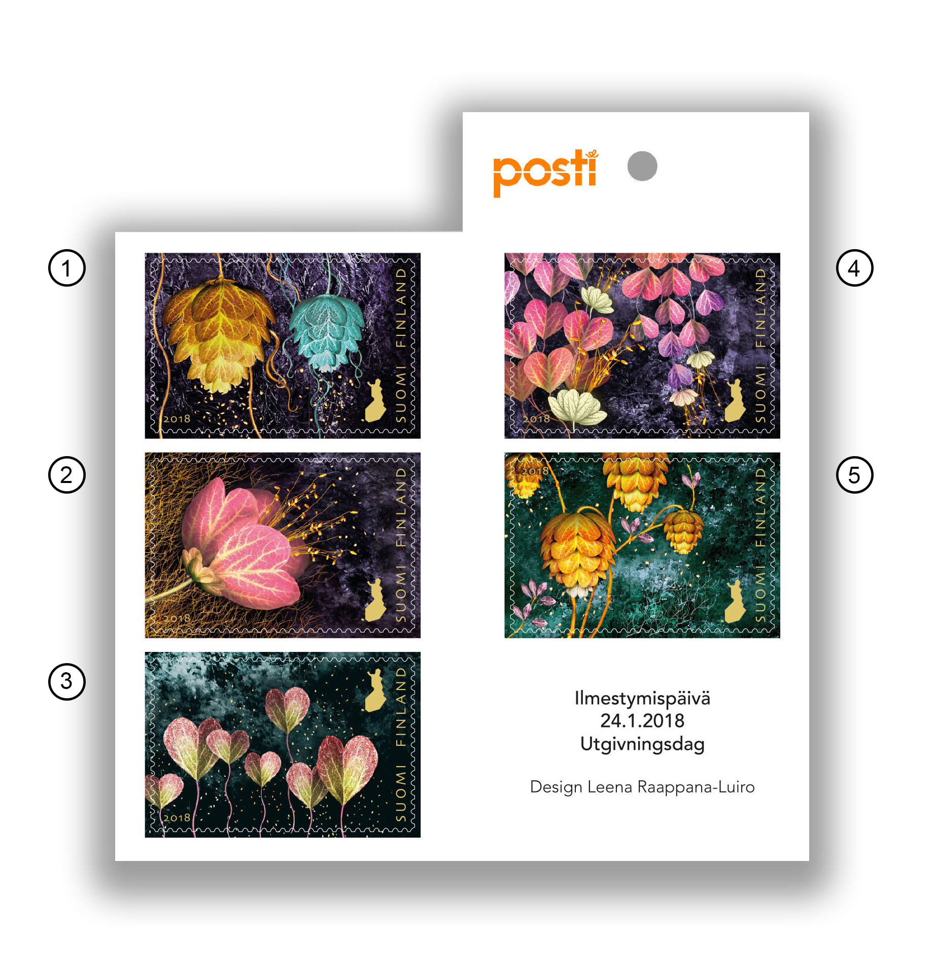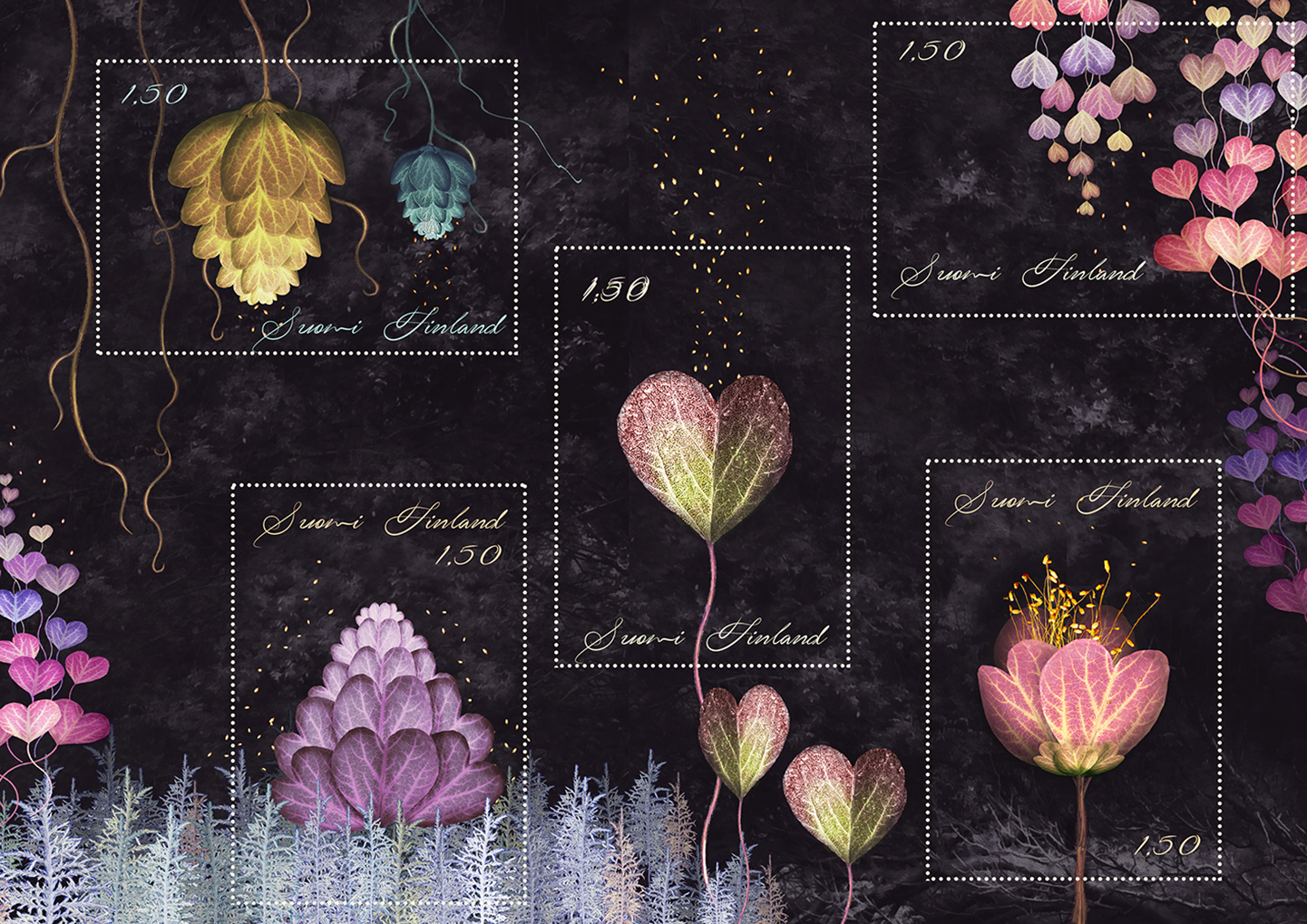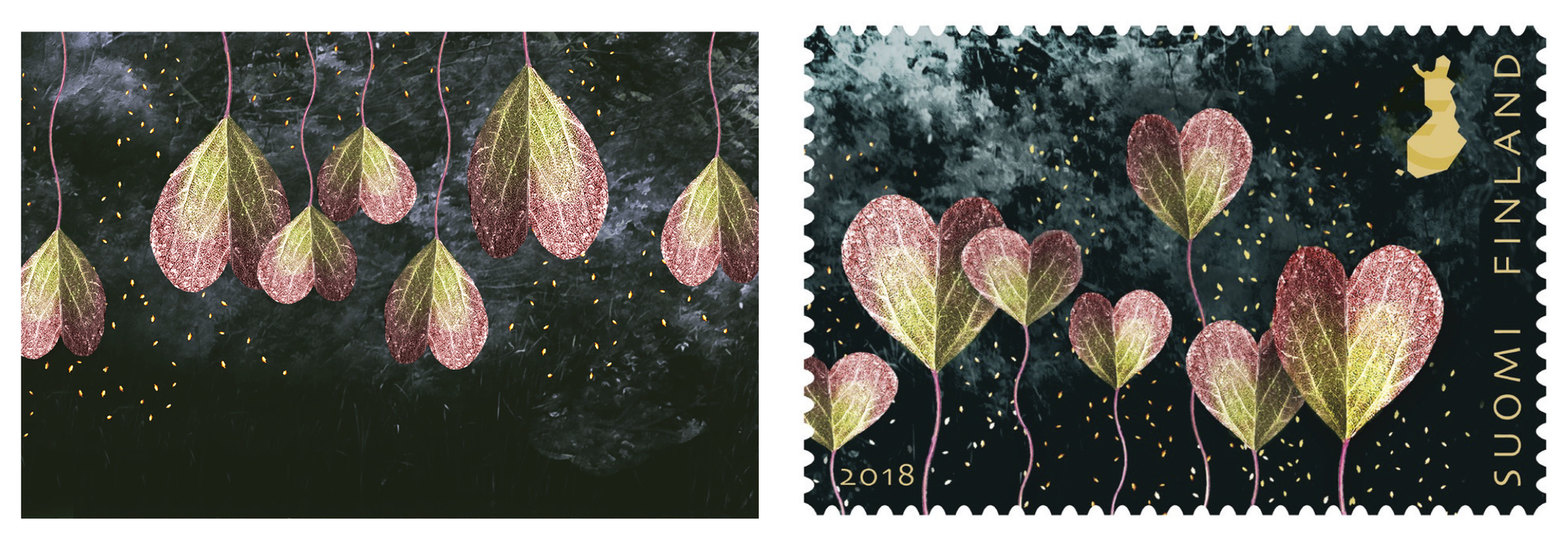 Väitöskirjani seuraava projekti alkoi, kun osallistuin Postin, Grafian ja Kuvittajat ry:n järjestämään postimerkkien suunnittelukilpailuun, jonka teemana oli suomalainen ystävänpäivä. Päätin jatkaa näyttelyssä kehittelemälläni tyylillä, mutta asenteeni suunnitteluun oli jo kontrolloidumpi, ja yleisö ja kilpailun jury mielessäni leikkasin PhotoShopissa haavan lehden sydämen muotoon, josta rakensin erilaisia kasveja merkkien aiheiksi. Tein kilpailutyöni kuvapaneeliksi, josta yksittäiset merkit voisi irrottaa. Hohtavan värikkäät sydänkasvit loistivat öisessä maisemassa omaa valoaan. Hiukan epäröin öisen maiseman kanssa, ja ikään kuin perusteluna tummuudelle annoin kilpailutyölle nimen Ystävyys on valo. (Joskin kilpailun tuloksista kirjoitetussa tiedotteessa nimeksi oli lipsahtanut muotoon Ystävyys on ilo). On todettava, että vaikka olinkin sydän-aiheessa ottanut huomioon ystävänpäivän kontekstin, olin epäammattimaisesti unohtanut kokonaan Suomi 100 -teeman. Sijoituin kuitenkin kilpailussa toiselle sijalle, ja raati kuvaili ehdotustani ”runolliseksi ja herkäksi”. Kilpailu johti toimeksiantoon, ja Posti tilasi minulta merkkisarjan vuodelle 2018.