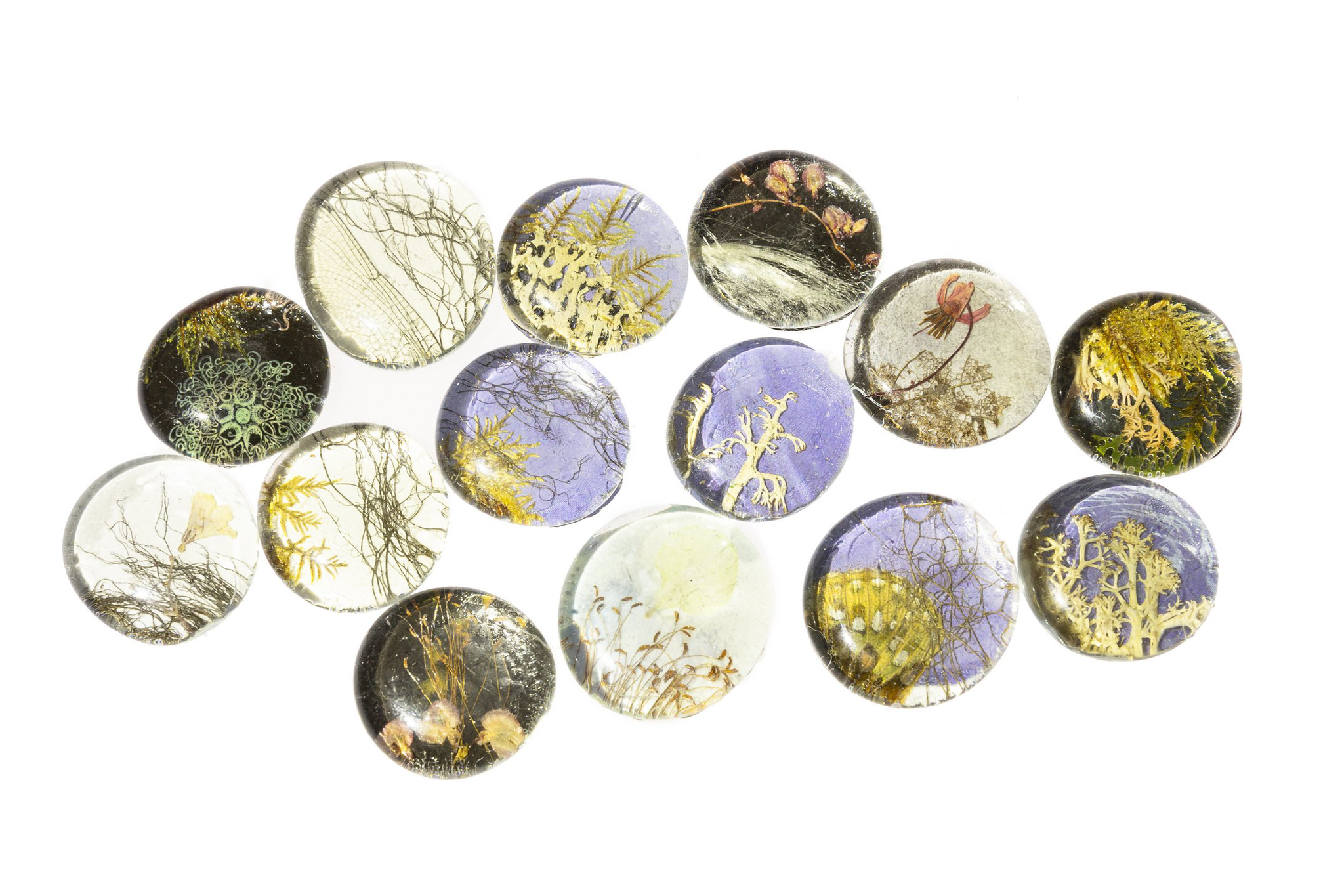 Samaan aikaan, kun kirjoitin artikkelia kuvakirjasta, alkoi Satumetsä/Fantasy Forest -näyttelyyn johtanut taiteellinen prosessi. Taiteelliselle työskentelylle on vaikeaa asettaa etukäteen rajattua tutkimustehtävää: siihen liittyi omalla kohdallani sekä yllätyksiä että puhtaita sattumia. Tuolloin yläkoulussa olleen poikani kesätehtävänä oli kerätä kasvio. Elokuu saapui, kukat lakkasivat kukkimasta, eikä kasviota ollut. Menin siis lähimetsään ja aloin kerätä listalla olevia sammalia. Prässäsin ne ja tutkin sammalia, jotka olivat kuin miniatyyripuita. Lipaston laatikosta löysin pieniä akvaarioihin tarkoitettuja, litteähköjä lasihelmiä. Laitoin lasin sammalen päälle ja ihastuin.