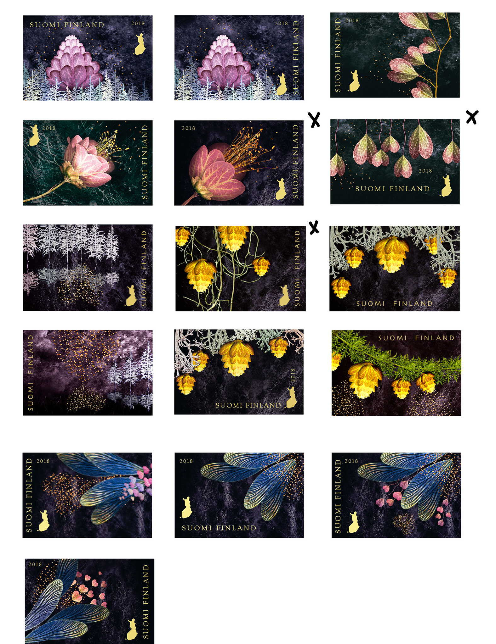 Jälkikaneettina haluan kertoa, että postimerkkien kaupallisen menestyksen innoittamana lähetin kuvitusportfolioni suurelle suomalaiselle tekstiiliyritykselle ja ehdotin, että suunnittelisin mielelläni myös kangaskuoseja. Sain vastauksen, jossa kuvituksiani kehuttiin herkiksi ja tunnelmallisiksi, mutta liian surumielisiksi kodintekstiileihin! Olen kuitenkin varioinut tyyliäni sittemmin muun muassa matkailujulisteeseen ja tieteellisen julkaisun kansi-designiin.