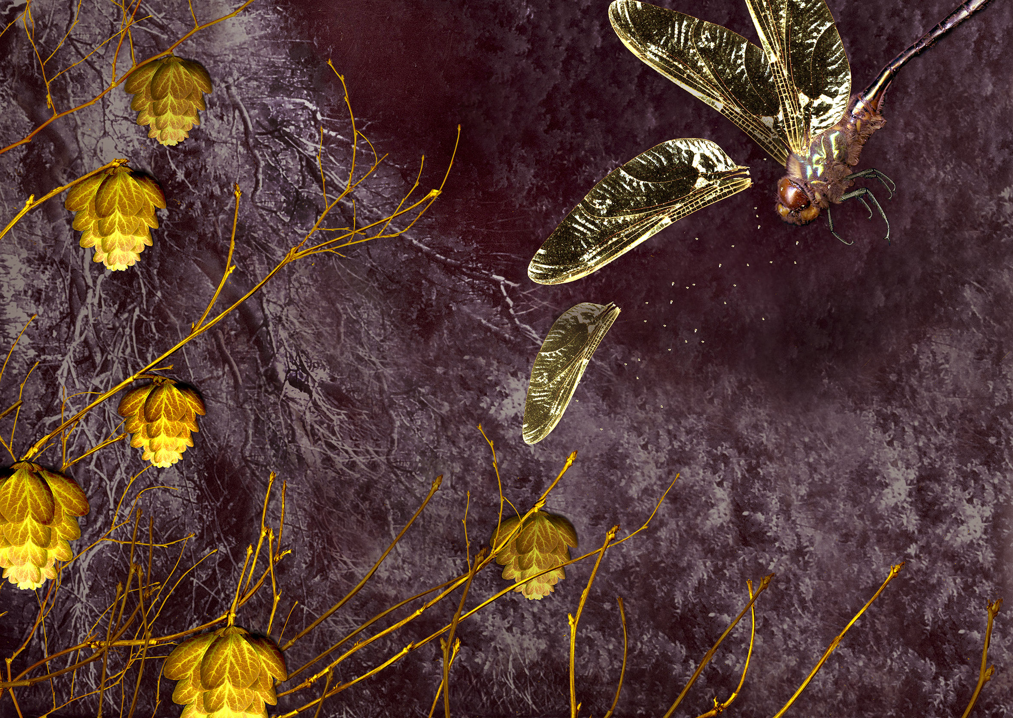 Toisessa kaksiulotteisessa teoksessa värit ovat syksyiset, paljaissa oksissa riippuu enää kultaisia käpyjä. Kuparinhohtoinen sudenkorento lentää oikealta ylhäältä kohti maata, samalla kun sen siivet sirpaloituvat. Visuaalisen kieliopin mukaan se palaa uudesta ja tuntemattomasta takaisin juurilleen, yläosan ideaalista kohti maan reaalia. Huomasin, että olin luonut luontoaiheella, tummilla taustoilla ja yksityiskohtaisella realismilla samankaltaisen tunnelman kuin ihailemissani 1600-luvun hollantilaisen realismin vanitas-maalauksissa. Hollantilaiset asetelmat ylistävät elämän kauneutta, mutta samalla muistuttavat kaiken katoavaisuudesta: kukkasia saattaa nakertaa toukka tai ruusun terälehdellä istua kärpänen – tiimalasin hiekka valuu hetkessä, jonka kuva on maagisesti pysäyttänyt ja vanginnut. Miettiessäni nimiä tekemilleni kahdelle taideprintille muodostui niiden välille tarinallinen yhteys ja juonellinen jatkumo verbaalin kielen resurssin avulla: ensimmäinen työ sai nimekseen Juhannusaatto, toisen nimeksi tuli Syyskuun viimeinen. Nimillä tulin samalla vahvistaneeksi elämän kauneuden hetkellisyydestä muistuttavaa vanitas-teemaa.