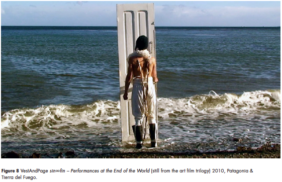 In 2010, we travelled to Patagonia to shoot the first episode of our performance art movie trilogy sin∞fin The Movie (figures 8 and 9).7 Due to the isolation and ruthless conditions of the location, our usual prosaic daily thoughts progressively ceased to exist. Living in those remote lands for weeks, we had to circumscribe the source of a stinging sense of melancholy and astonishment that we felt and were slowly drowning into. The tangible realisation of the human frailty, the solitude, the silence, the emptiness, the merciless beauty that shines from a nature so immense and desolate, helped us to set the parameters for the performances we did for the movie. Moreover, it helped us to crystallise what would become one of our main objectives as a performance duo: expanding the perceptual space of inner silence.