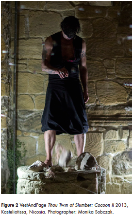 For example, as part of the performance Thou Twin of Slumber: Cocoon II (figure 2), a durational piece that formed part of the 2013 performance cycle Thou Twin of Slumber, I walked, blindfolded, on a very narrow rough edge of an ancient well, which we had previously filled with sharp broken glass pieces and spiky stones. I balanced seagull feathers on my fingernails, while my partner, Verena, wrapped the space around me with fishing lines, shaping a net to cage both of us inside. The aim of this action was to enhance our concentration on the main action to the point where we acted without thinking while simultaneously reaching a higher sensorial perception and activating of an inward atmosphere of confidence and serene peaceful force. By the end of the action, we were no longer pointing out the limit between time and space; we were dancing on it.
