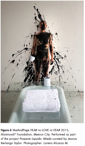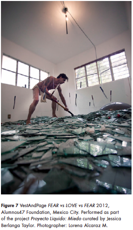 6. The twenty-four-hour durational performance FEAR vs LOVE vs FEAR took place in an abandoned two-storey villa in the heart of Mexico City in summer 2012, as part of Proyecto Liquido, organised by Fundación Alumnos 47. In each of the twelve rooms of the house, we created a different situationist installation, which we would perform twice (one hour during the day, one hour during the night in each room, moving in a circular pattern).