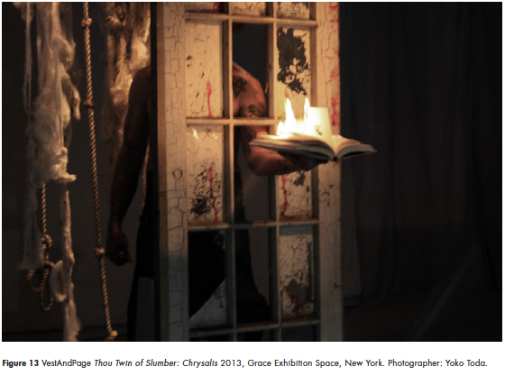 Nevertheless, it is important to note that Fromm’s idea of genuine individuality also represents an “illusion” (Fromm 1942, 221). People are social beings who are often under social pressures that continually interfere with and affect their authentic being. In fact, distractions come from internal and external sources, which can cause a state of mental confusion in performers that can mislead them during their action, resulting in losing the necessary, required, and intimate attention to their main task: unveiling their own Self. If their energy level drops, the action will progressively lack intensity and the communication will be impoverished; the whole work might fail. However, there are other ways of reading an apparently unsuccessful, unsatisfactory action without considering it as a ‘mistake’ or a ‘failure’. Something of this nature happened during our performance Thou Twin of Slumber: Chrysalis (2013, figure 13), when I badly cut my middle finger with a sharp knife. This was a technical mistake. The blood streamed down, but instead of interrupting the piece, I took a book and kept it open on my wounded hand. With the other hand, I started writing words with my blood poured on the floor on an old Victorian door we had previously installed in the space. As part of the performance, I burnt the book while my hand was still dripping blood. These series of events, which were the result of an accident, created an unintentional but very powerful image.