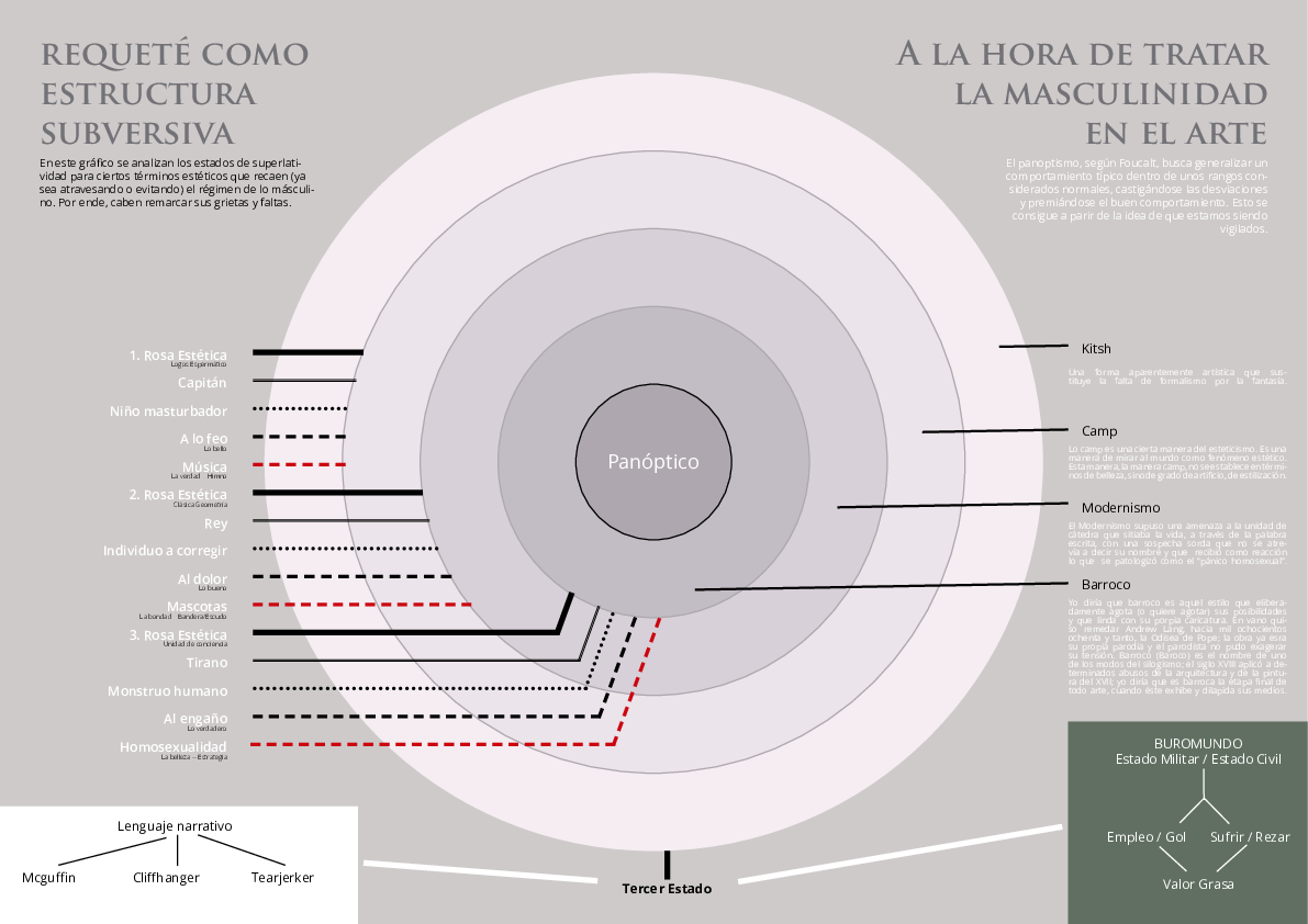 Este proyecto de tesis parte de la noción del requeté, cuestionando si éste podría ser un término subversivo a la hora de tratar la masculinidad en el arte. Para ello deberemos abordar primeramente la noción de lo masculino. Una vez activado dicho término haremos una exploración de lo biopolítico partiendo de autores como M. Foucault, F. Nietzsche o P. B. Preciado. Finalmente trataremos el término requeté no solo desde su contexto, sino desde su potencialidad en la actualidad, buscando así los límites de su performatividad.
