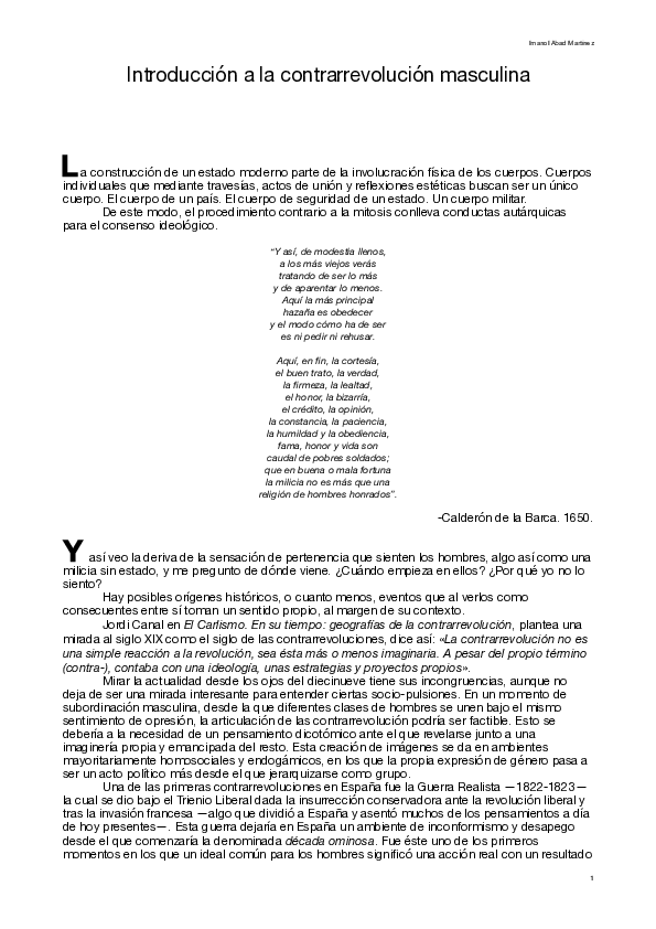 Y desde el tercer estado imaginario, que podría decirse que es el carlismo, se abre la puerta a la gestación de un nuevo biopolítico y por tanto, una reflexión sobre la masculinidad. Queda patente en toda la evolución del estado carlista dos formas de asentarse: mediante la ordenanza militar y la cultural. Por un lado, la milicia es adscrita al estado como una escuela de formación de hombres, no tanto para su funcionalidad sino para la asunción de su cuerpo en colectivo. Dichos planteamientos prácticos se refuerzan desde un tejido de obras culturales que activan la asimilación de términos y una nueva sensibilidad estética por y para el nuevo estado. El estado carlista necesita de una ficcionalidad para hacerse entender, al igual que el jacobitismo que primero asume un gesto propio cultural —desde la mitología, la poesía de vanguardia, la pintura y la veneración de sus paisajes— para que el estado militar sea uno y tenga algo por lo que batallar.