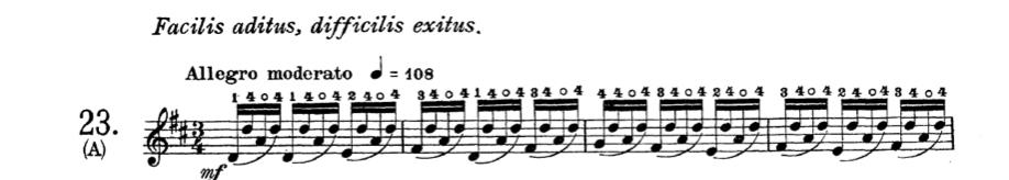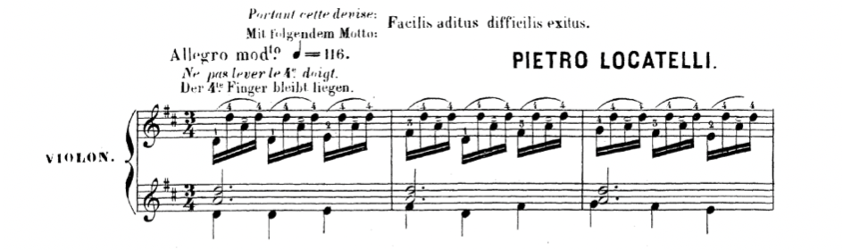Then there is an earlier version by Jean-Delphin Alard (Alard, 1868, p. 2) from 1868. Allegro moderato, tempo 116 beats per minute, and the motto is shown: “Facilis aditus, difficilis exitus.” The same sequence of notes, but here he tells us to “keep the 4th finger down,” so this is a combined bow and left-hand exercise. No dynamics, but a line showing the original notes, which is a nice touch.