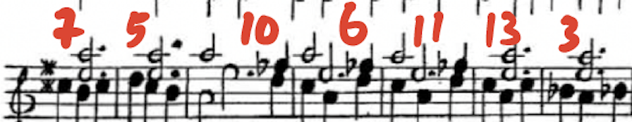 But 143 is also eleven times thirteen. So, if I were to distribute the repeats between one and thirteen an equal number of times at a tempo of 120 bpm it would mean that I would play each of these amounts of repeats eleven times spread throughout the piece, and it would turn into a crisp 25-minute performance – long enough to lose one’s bearings in but short enough to keep my arm from falling off. And if I were to distribute those measures randomly throughout, many things could conceivably happen: for example, those identical middle measures I just showed could be repeated as many as 39 times or as few as three, which would definitely make for a different experience each time. One solution would then be to play the measures randomly and try to keep the rules regarding repeats in my head. The problem if I chose myself would be that the number of times I repeated something might be affected by how I felt in that moment, or what was easier to play, which would defeat part of what I wanted to accomplish.
