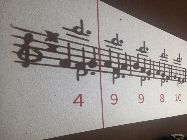 Why not only allow each possible pattern to be played once? And why not ensure that I do not know which pattern will be performed that day? I spoke with the composer and programmer Fredrik Olofsson, who created an app that scrolls through the score both for myself and on a screen for the audience as I perform. The number of measures to be played is generated randomly, and only a few measures are shown at a time, so I find out the number of times I am to play each measure in real time. The distribution of the repeats is new for each new iteration; any measure may be played one to thirteen times, eleven times over, creating a 25-minute version that is never the same. It might conceivably be the same, but since there are over 600 million permutations of the 13 x 11 measures, the chances are quite slim.