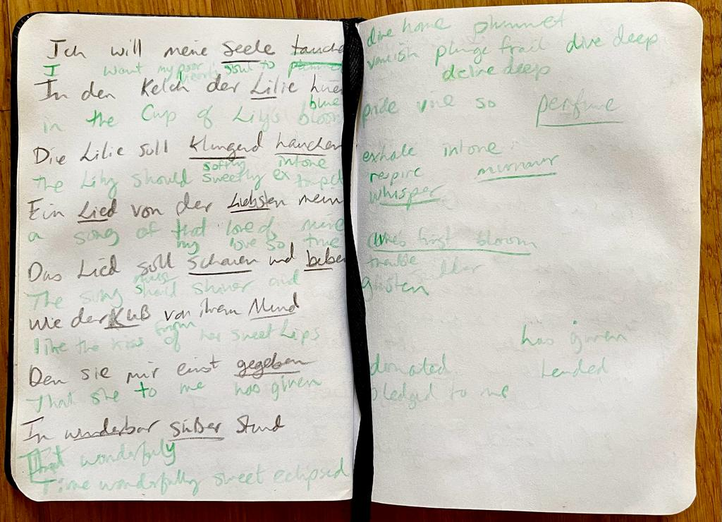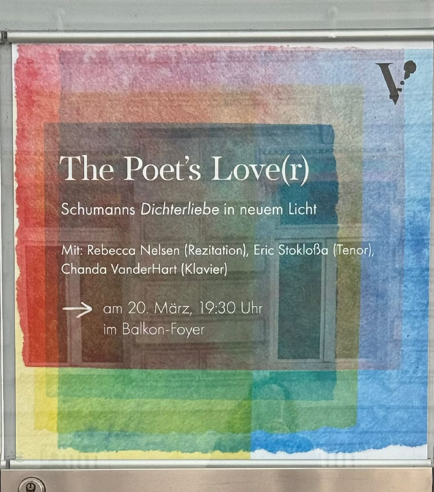 On 15 and 22 October 2022, VanderHart, Babb-Nelsen, and Stokloßa presented their project: The Poet’s Love(r) to two separate, day-long seminar classes, which launched the module/course ‘Voicing The Unvoiced – Liederzyklen des 19. Jahrhunderts ins 21. Jahrhundert transportiert’. The course, conceived and taught by VanderHart, Stephen Delaney, and Judith Kopecky is part of an ongoing cooperation between the Antonio Salieri Institute and the Institute for Department of Musicology and Performance Studies (IMI) under the rubric Content-Concept-Context. For an extensive summary of those lectures with direct transcription of the lecture in the form of commentary, click here. The tone of the commentary was a casual and largely extemporaneous academic discussion, and the excerpts below are taken directly from a transcript of that discussion leading to more casual banter and repetition than one would find in a traditional interview or research project.