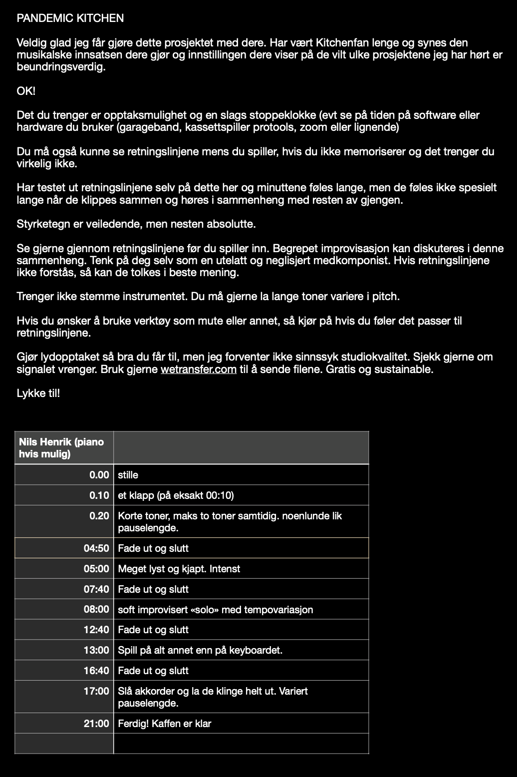 Da de 18 musikerne hadde takket ja til å delta på prosjektet hvor konseptet var at de skulle spille inn materiale alene og isolert, kunne jeg starte prosessen med å komponere retningslinjer som de skulle forholde seg til under innspilling.