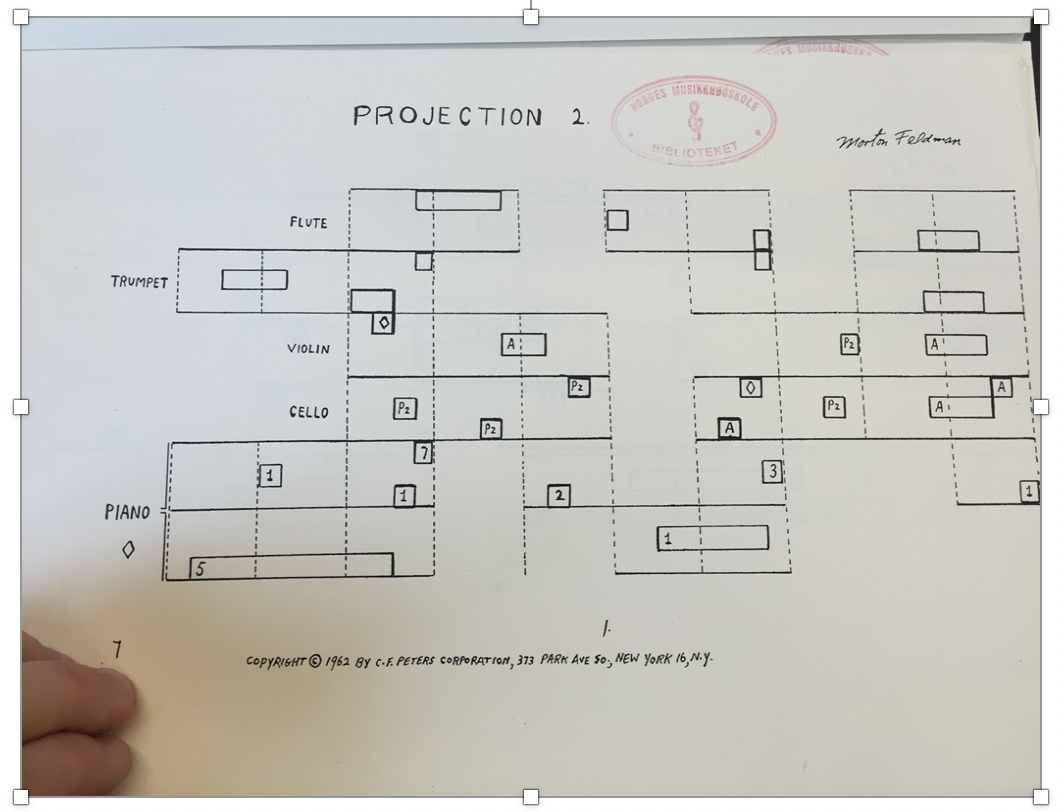 Feldman benyttet en komposisjonsteknikk i flere verk i løpet av 1950-tallet hvor han komponerte et rutenett som ble lest fra venstre til høyre, hvor hver rute inneholdt ulik, enkel lesbar visuell informasjon til de ulike musikerne, og ved cue, eget ønske eller angitt tid, kunne musikerne spille seg videre til neste rute med informasjon (Boutwell, 2012).
