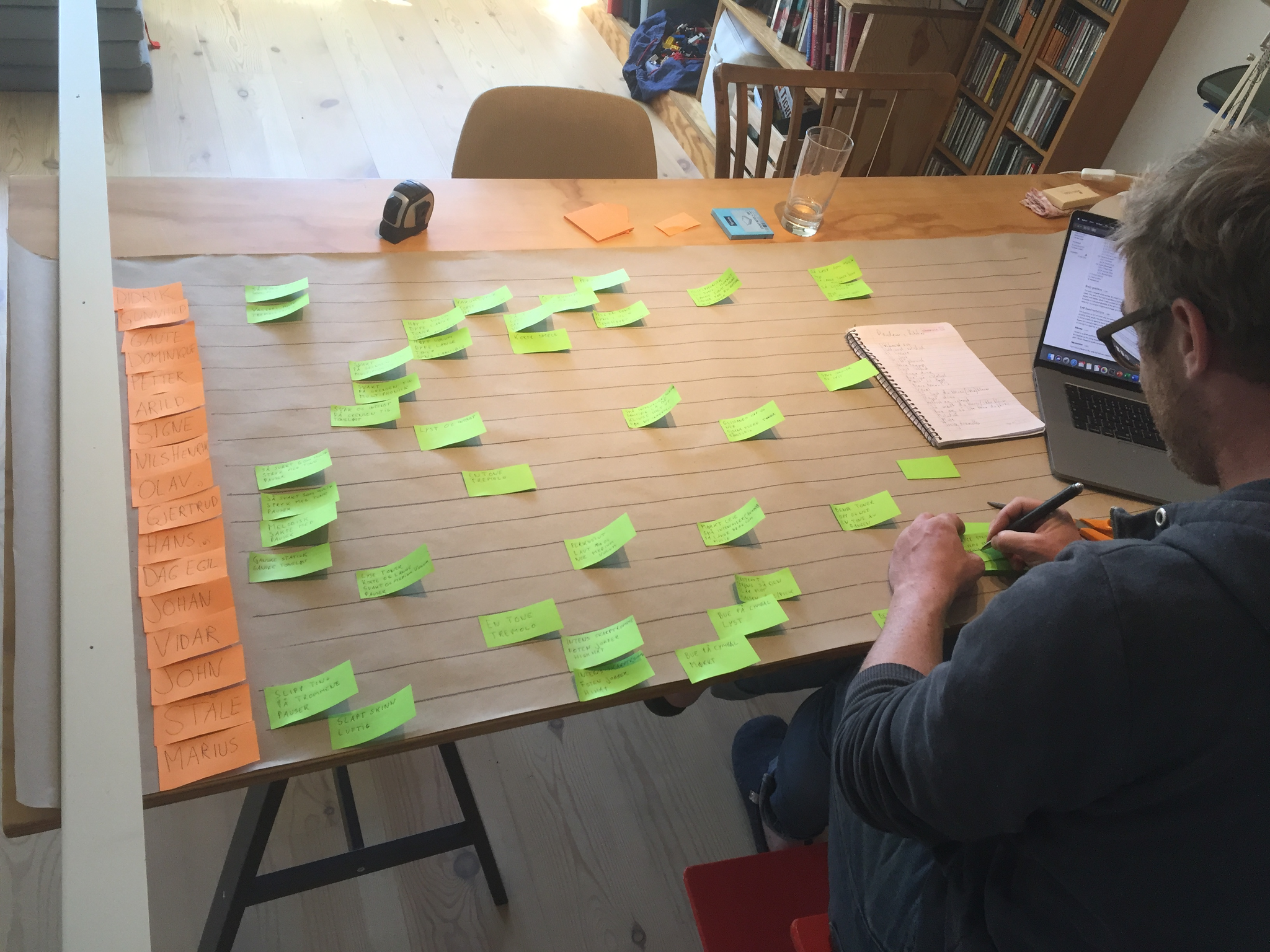 Jeg produserte en nedskrevet plan med navn på musikere (oransje lapper) og enkle oppgaver de kunne utføre på instrumentene (grønne lapper) og forsøkte å forestille meg hvordan dette kunne høres ut samtidig og hvordan dette kunne fungere som et musikalsk forløp på 21 minutter (som er den omtrentlige lengden på en vinylside).