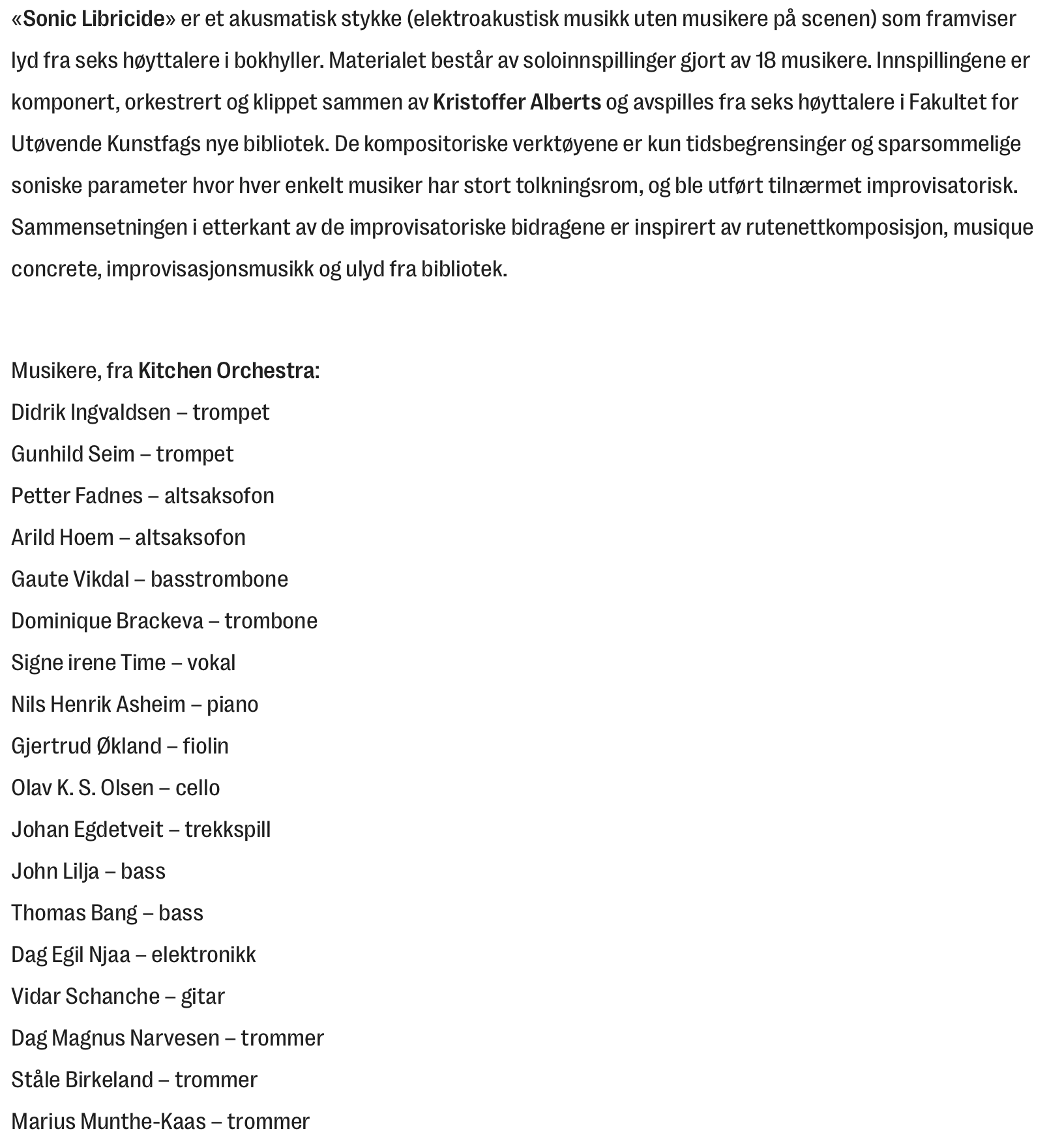 Jeg ønsket ikke å avbryte prosjektet, men anså det som en viktig læringsprosess for prosjektet. Jeg forsøkte å løse problemet ved å klippe dette sammen og mikse musikken ut i seks høyttalere i et lite, akustisk tørt universitetsbibliotek på Bjergsted i Stavanger. Jeg gikk vekk fra den originale tittelen på verket, fra Pandemic Kitchen til Sonic Libricide da prosjektet ble formet til å passe inn i biblioteket på Bjergsted. Sonic Libricide kan oversettes til lydlig ødeleggelse av bøker, og jeg hadde ingen andre tanker med tittelen enn at jeg syntes den hørtes kul ut og at den hadde noe med bibliotek, litteratur og lyd å gjøre. Jeg kommer ikke til å greie videre ut om titlene på prosjektene.